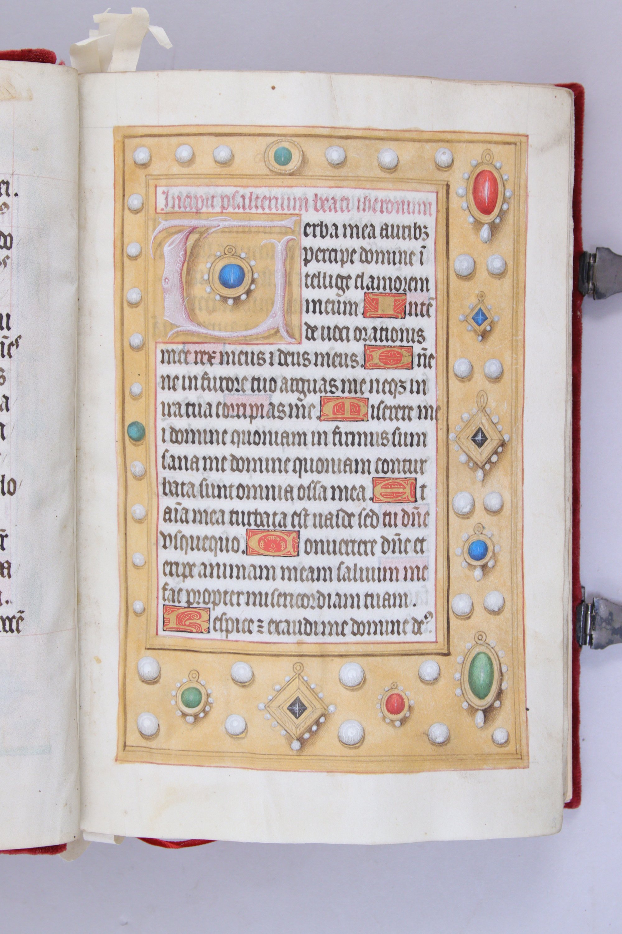 Velours XIXème dans le style néo-gothique, avec fermoirs métalliques. (Il manque une douzaine de feuillets, -en particulier toutes les miniatures à pleine page. La marge de queue du feuillet 108 a été découpée).