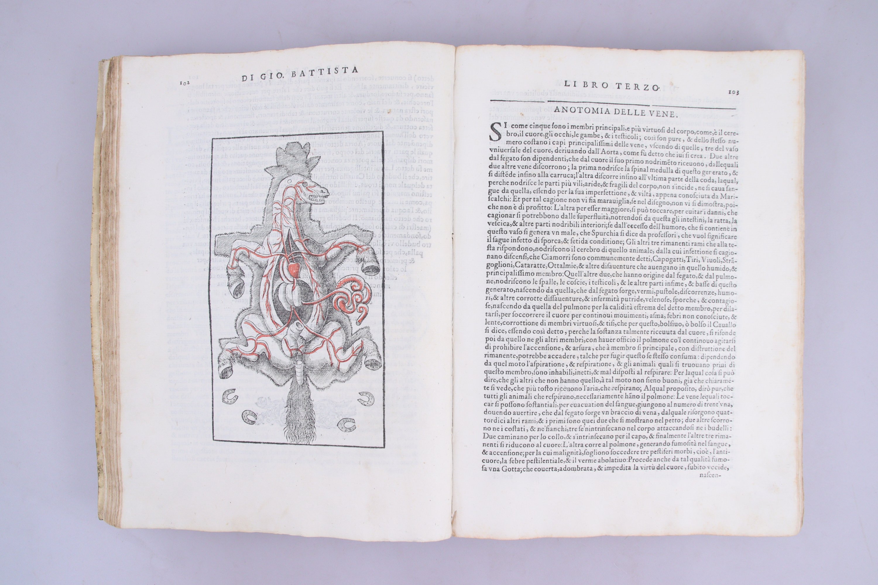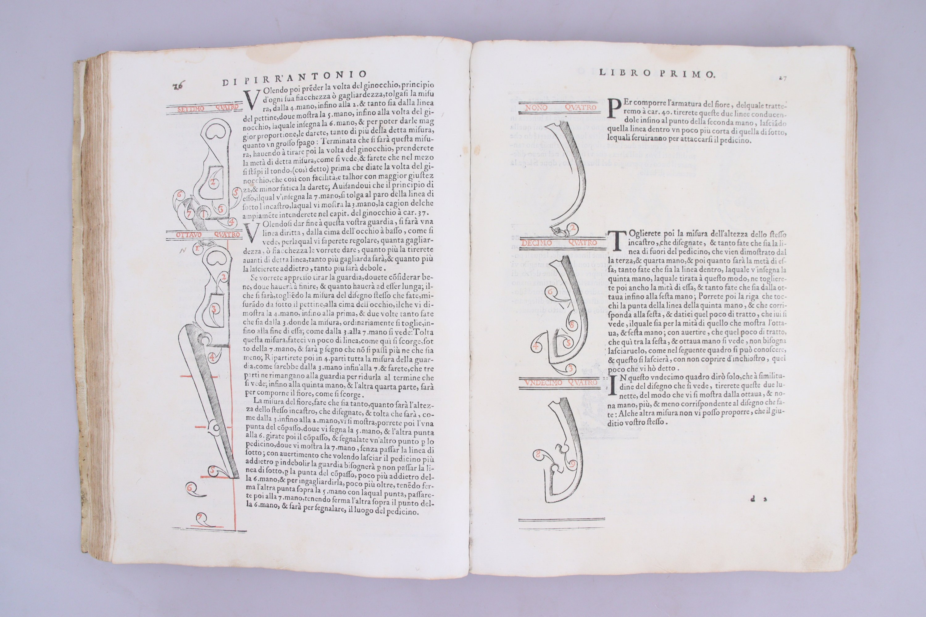 Edition originale très peu courante de ce superbe ouvrage illustré de plus de 130 bois gravés, la plupart à pleine page. Il est publié par Giovanni Battista II et Berardino Ferraro, après la mort de l'auteur, leur père, Pirro Antonio, écuyer de Philippe II d'Espagne, qui l'avait composé sous forme manuscrite et illustré dès les années 1575. C'est l'ouvrage italien sur l'équitation le plus richement illustré de la Renaissance. Quelques-unes des planches sont imprimées en noir et rouge.