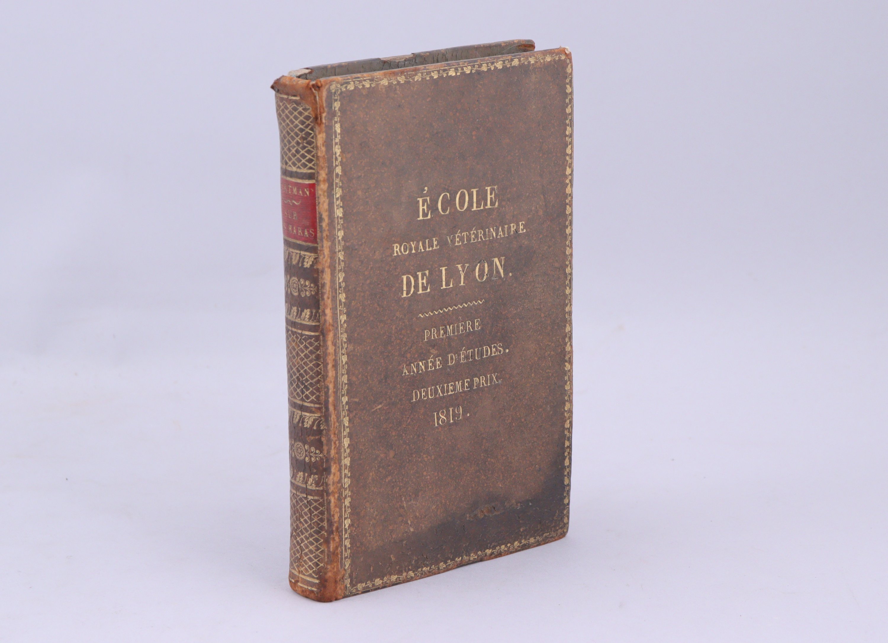 In-8, LVI et 312 pages, (2 ff). 5 tableauxhors texte, et 2 planches gravées hors-texte. Pleine basane, roulette d'encadrement ; supra-libros "Ecole Royale Vétérinaire de Lyon. Deuxième prix. 1819.". Reliure du début du XIXème siècle. (Mors, coiffes, coins frottés. La planche II, page 260, est un fac-simile).
