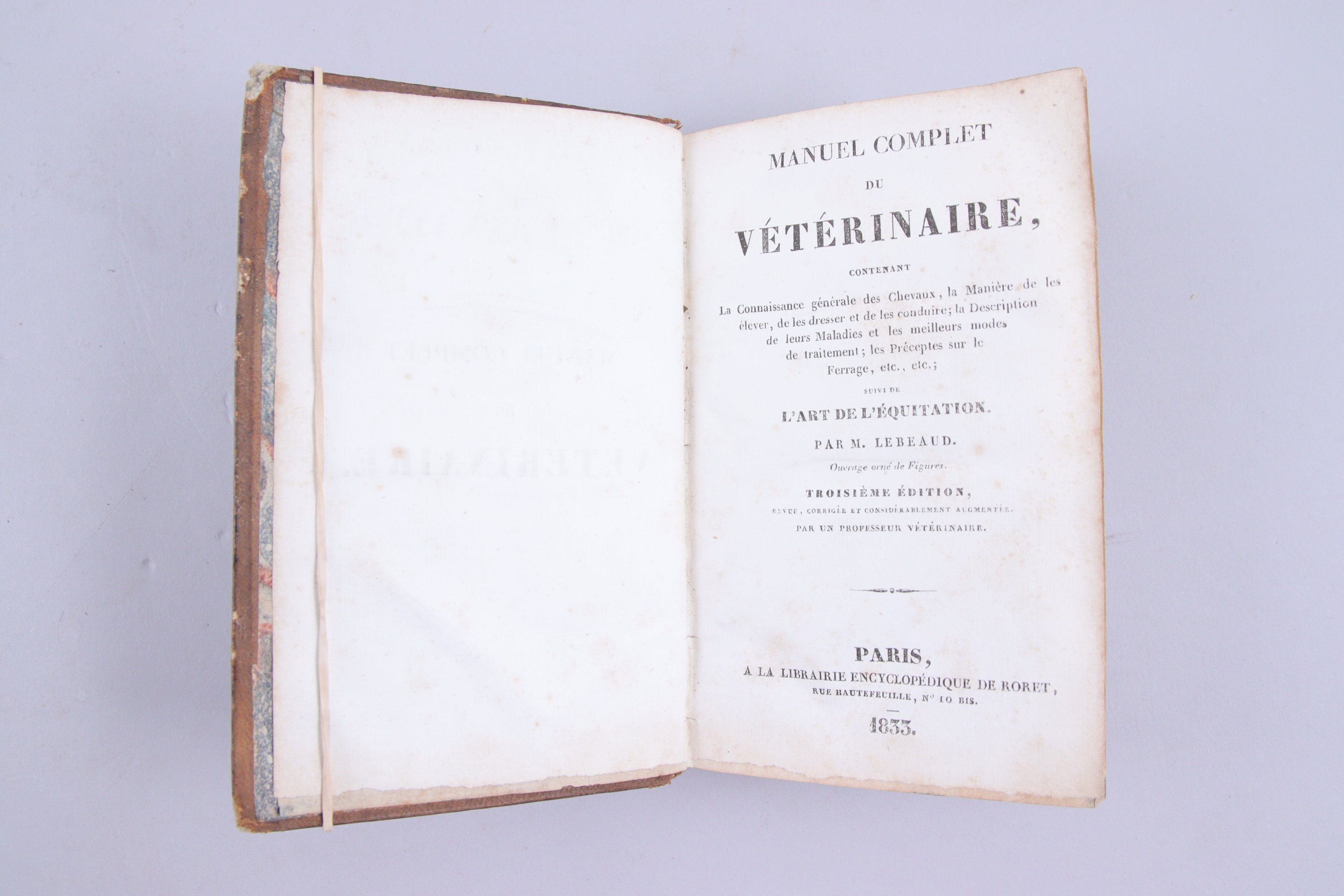 - Lebeaud: Manuel complet du vétérinaire ... suivi de l'Art de l'équitation. Paris, Roret, 1833. In-12, veau du temps.. 7 figures sur 2 planches dépliantes.