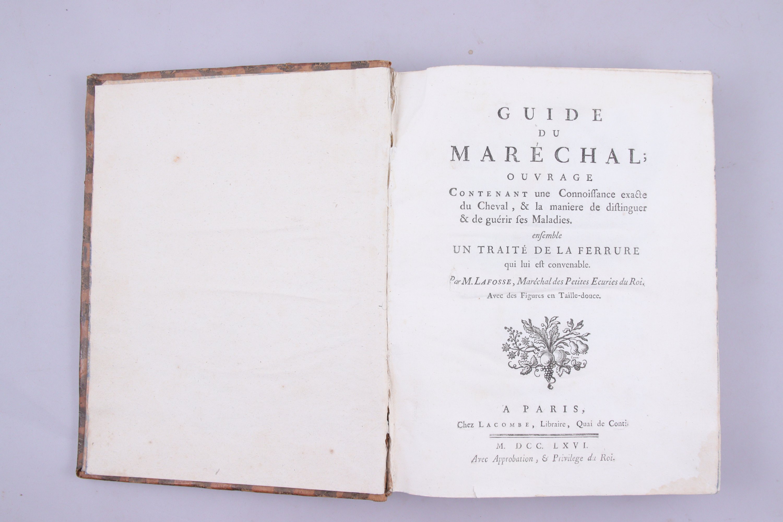 Guide du Maréchal ; ouvrage contenant une connoissance exacte du cheval, et la manière de distinguer et de guérir les maladies. Ensemble un traité de la ferrure qui lui est convenable. Par M. Lafosse, Maréchal des Petites Ecuries du Roi. Avec des figures en taille-douce.