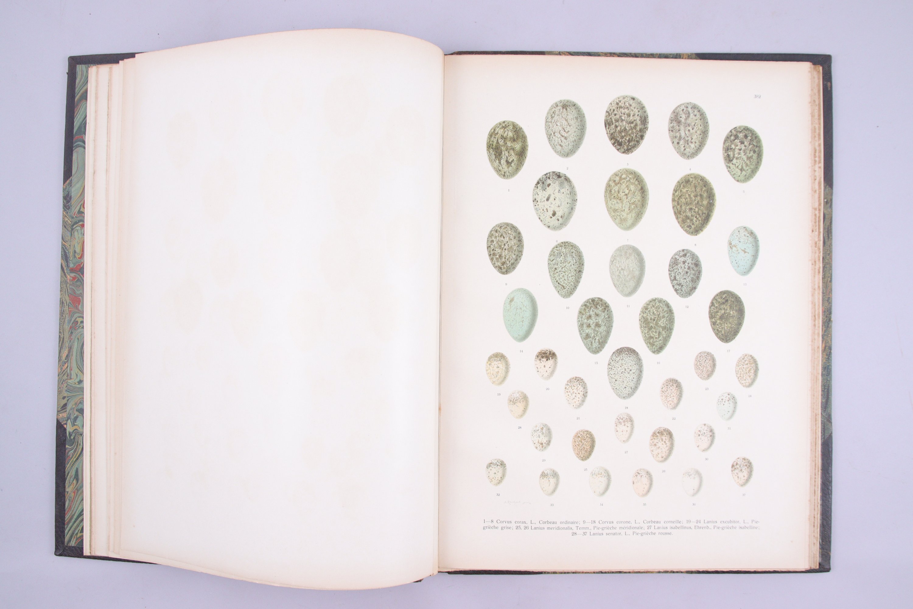 Iconographie d'oiseaux d'Europe et de leurs oeufs. Edition française de 413 planches coloriées, destinée à servir d'Atlas à l'Ornithologie européenne de Degland et Gerbé, à l'Avifauna italica d'Enzio Hileyer Giglioli, à l'Ornitologia Andaluza y de España de Gansez et aussi aux Aves da peninsule Iberica e de Portugal de Paulino d'Oliviera, avec références aux noms anglais de H.E. Dresser, aux noms allemands de Naumann et à l'Hand-list of Birds de George Robert Gray par A. Bouvier.