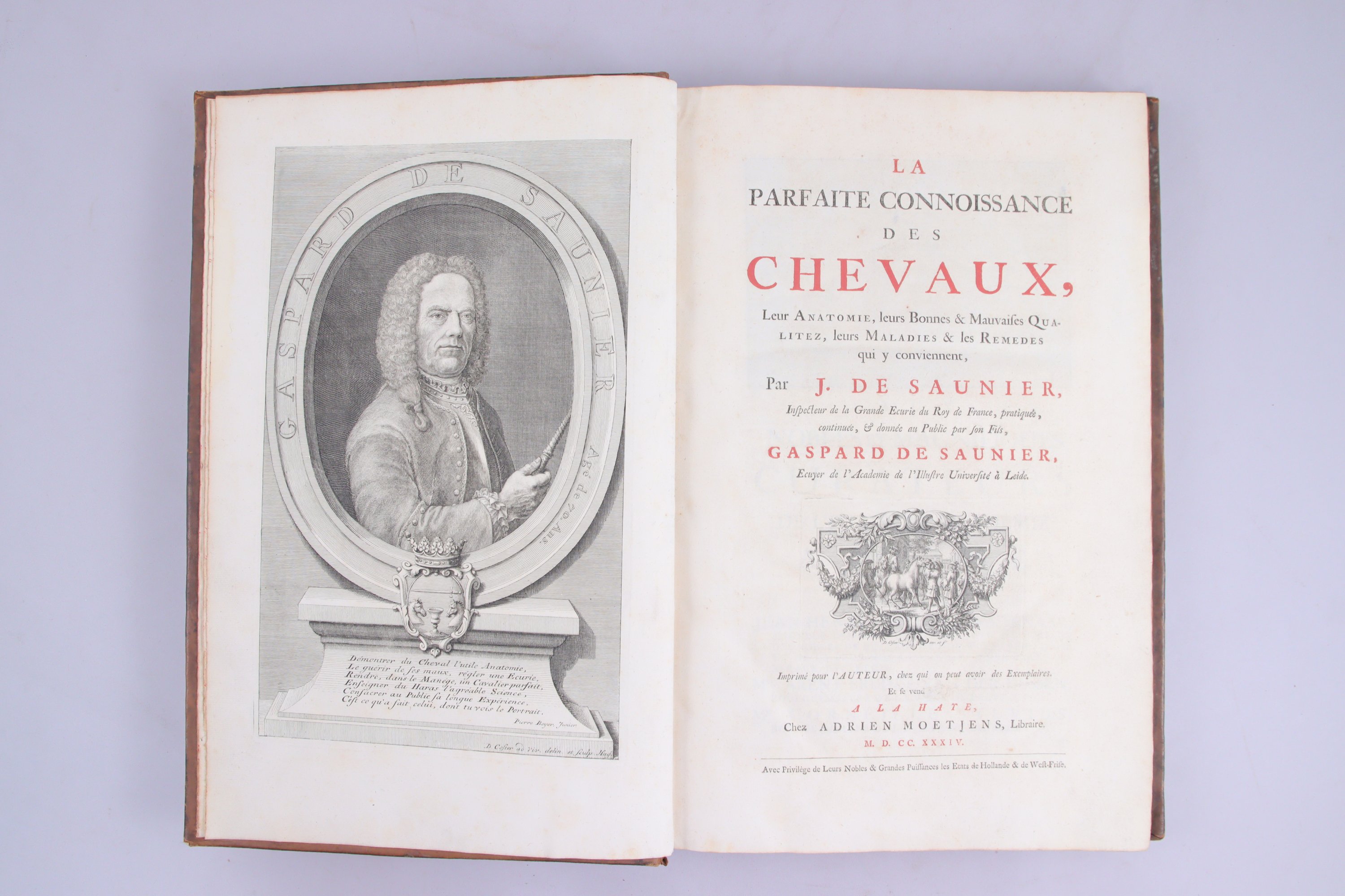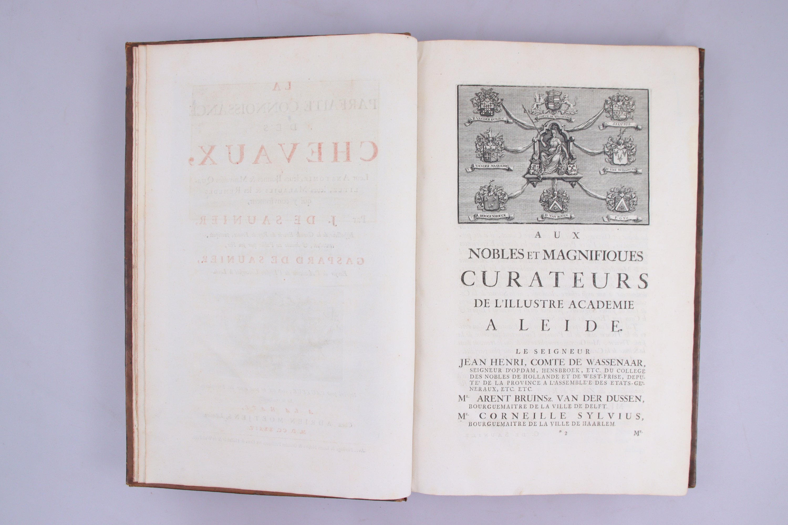 La parfaite connoissance des chevaux. Leur anatomie, leurs bonnes et mauvaises qualitez, leurs maladies et les remèdes qui y conviennent. Par J. de Saunier, Inspecteur de la Grande Ecurie du Roy de France, pratiquées, continuée et donnée au public par son fils Gaspard de Saunier, Ecuyer de l'Académie de l'Illustre Université de Leyde.