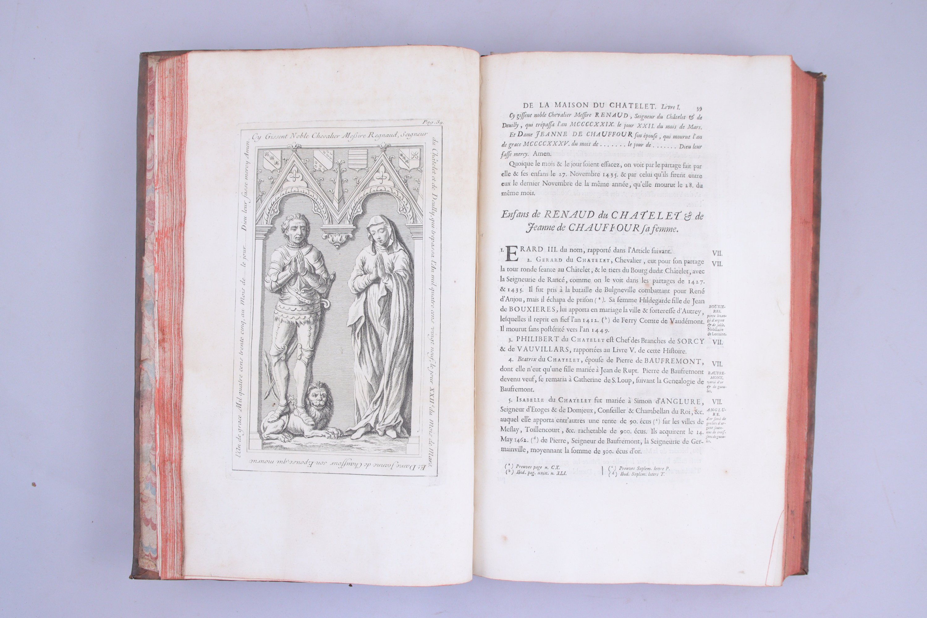 Bon exemplaire de ce volume recherché, illustré in-texte de très nombreux blasons gravés sur bois. Emilie Tonnelier de Breteuil, marquise du Chatelet (1706-1749), femme de lettres et physicienne, correspondante et amie de Voltaire, ne doit d'être citée à la page 119 qu'en temps qu''épouse du Marquis Florent-Claude du Chatelet, et fille de Nicolas de Breteuil.