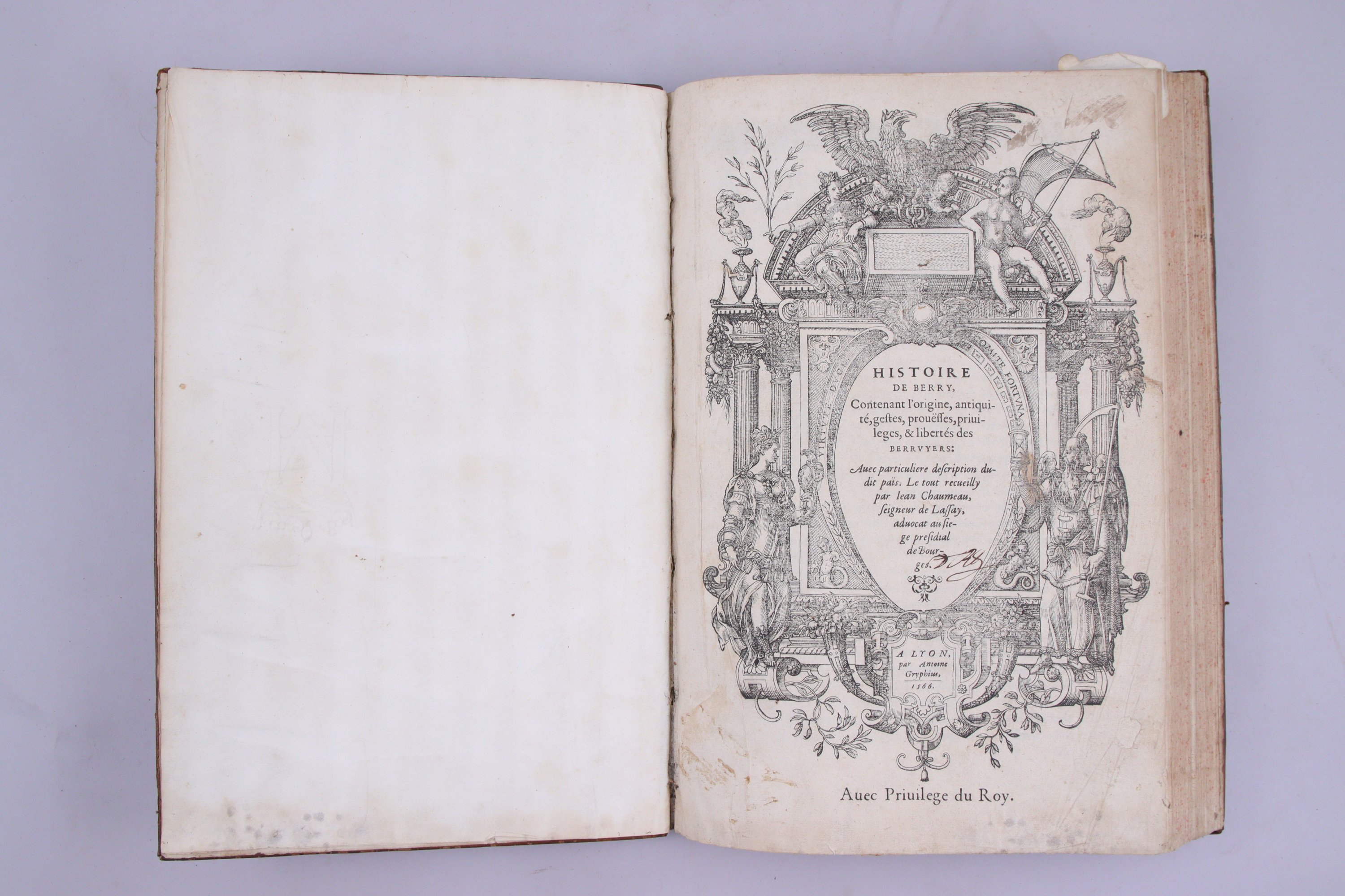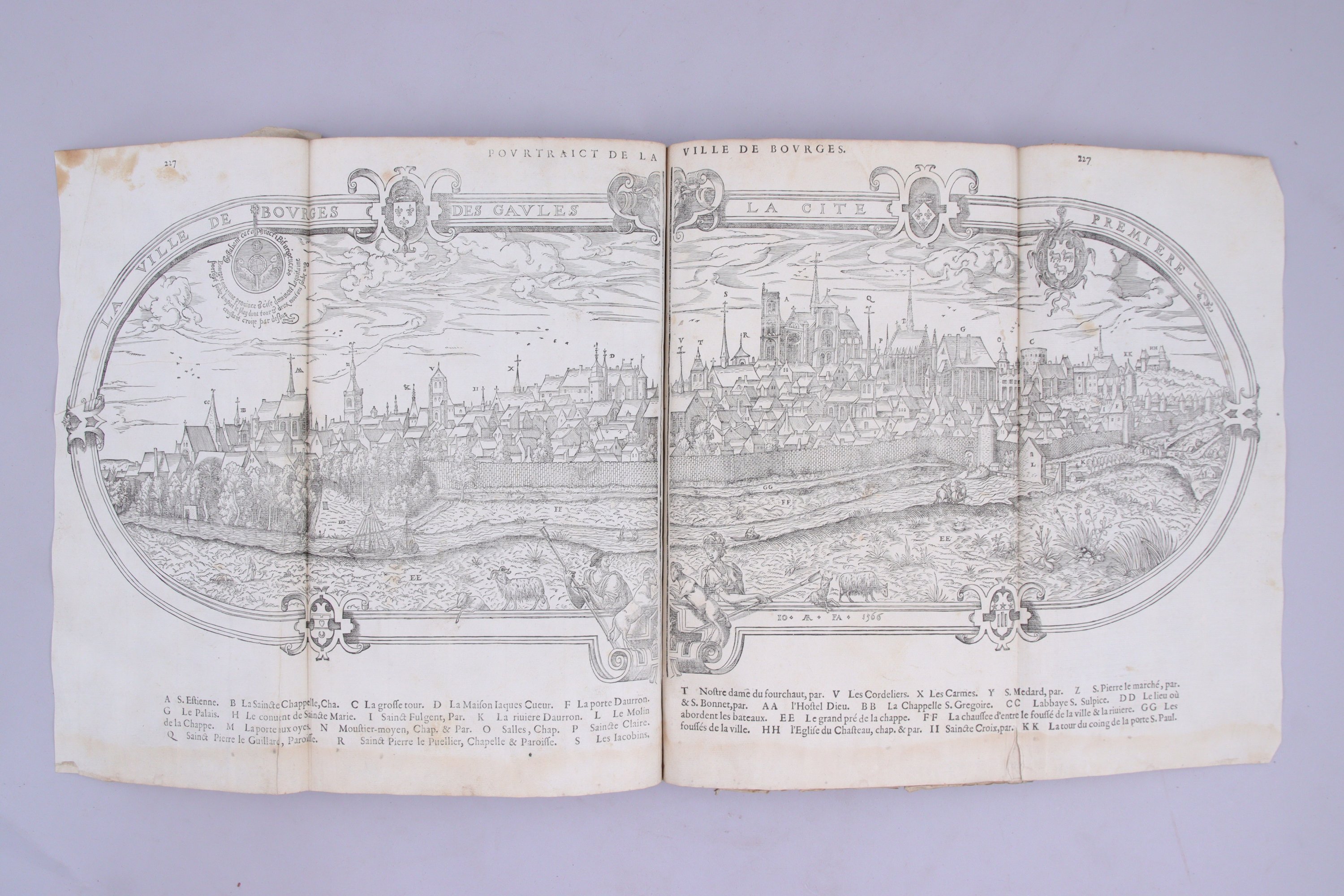Ouvrage recherché, bien complet de la grande vue cavalière de Bourges (335 X 670 mm) signée Io. Ar. Fa (Jean Arnoullet?) et datée 1566 ; et de la carte du Berry (330 X 360 mm). Toutes deux sont gravées sur bois. Sur la carte, les noms des villages sont gravés en italique en très petits caractères, véritable "tour de force de la gravure sur bois", selon Brun ().