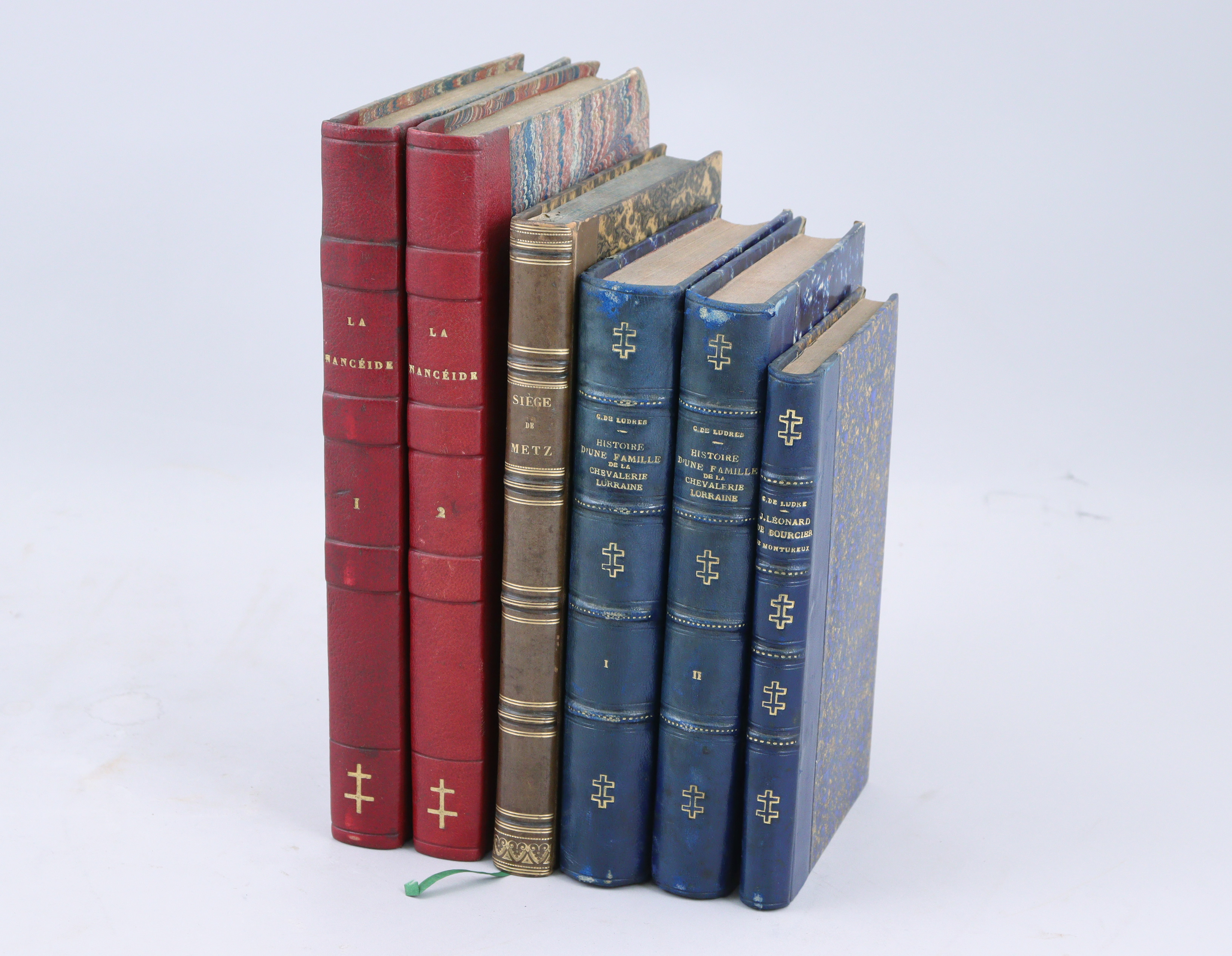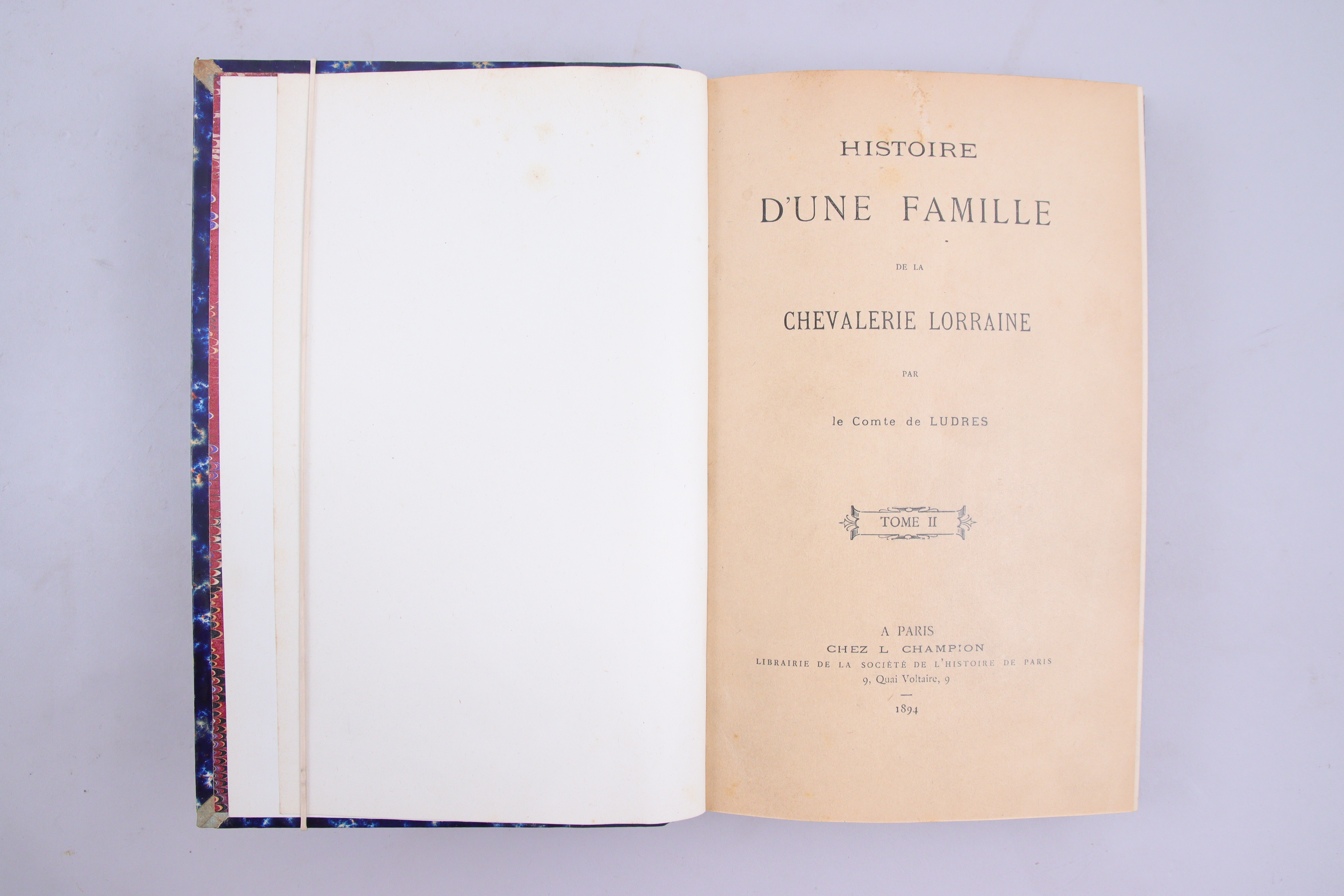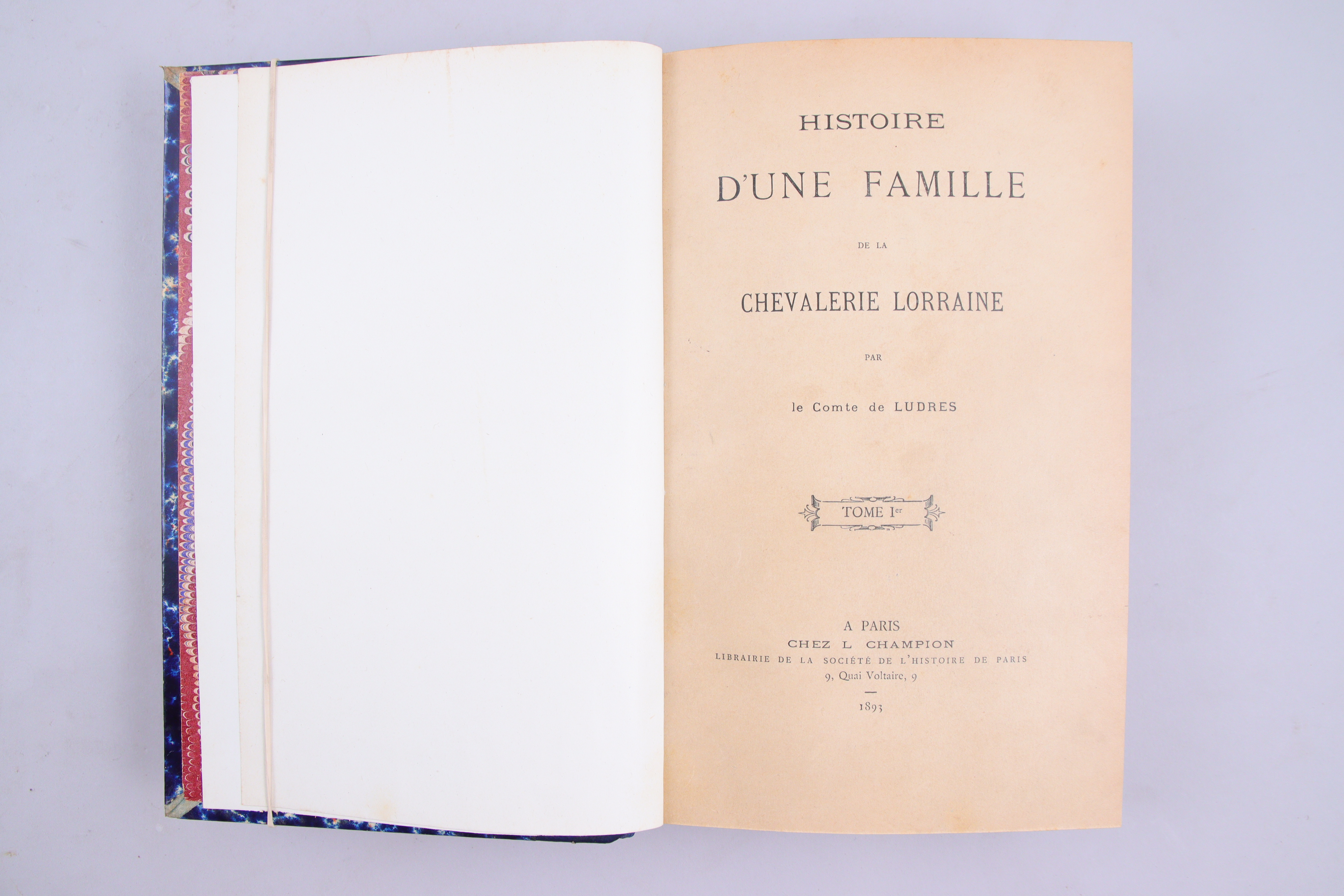 - Comte de Ludres: Histoire d'une famille de la chevalerie lorraine. Paris, Champion, 1893-1894. 2 volumes in-8; 1/2 veau bleu, croix de Lorraine au dos. Reliures du temps.