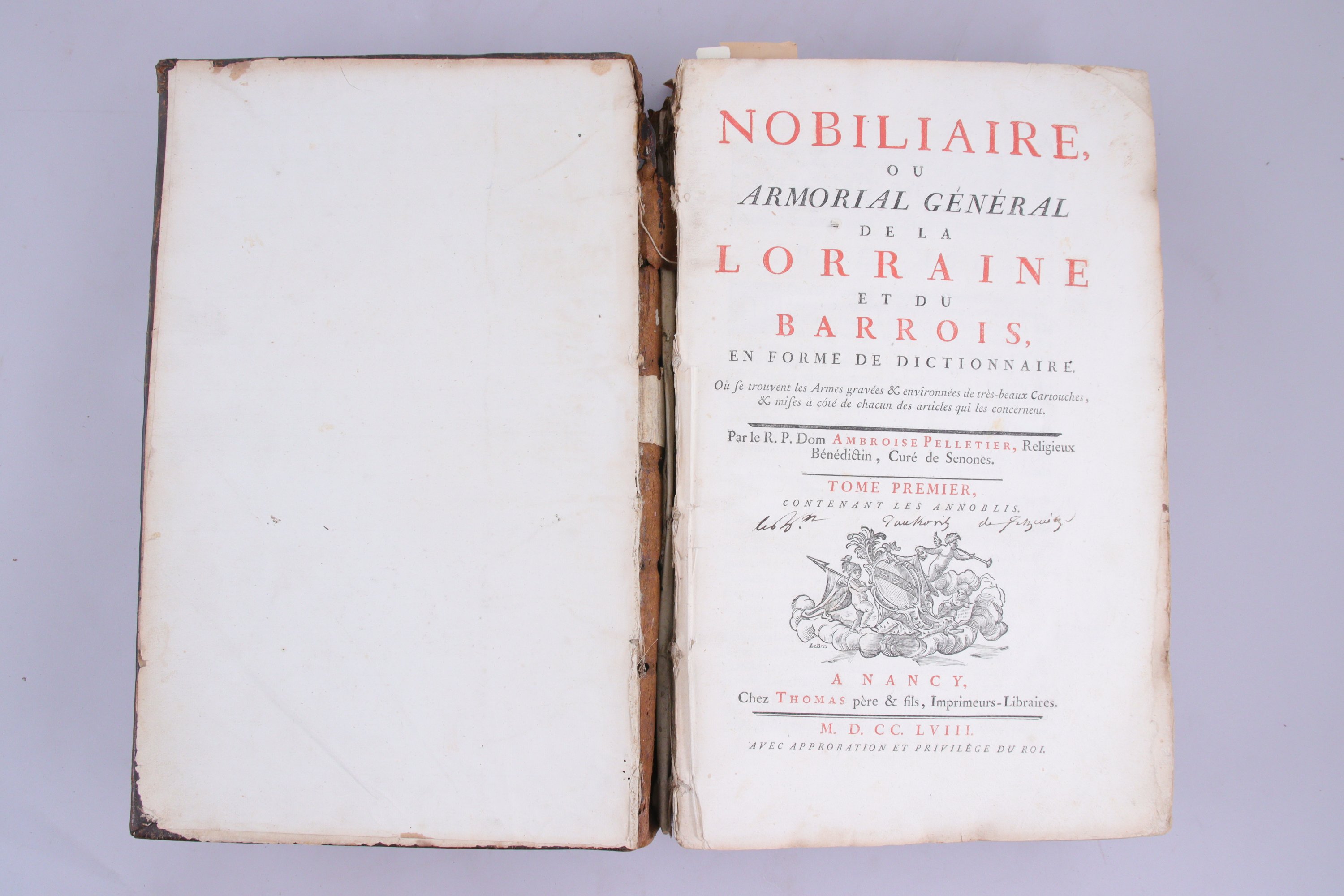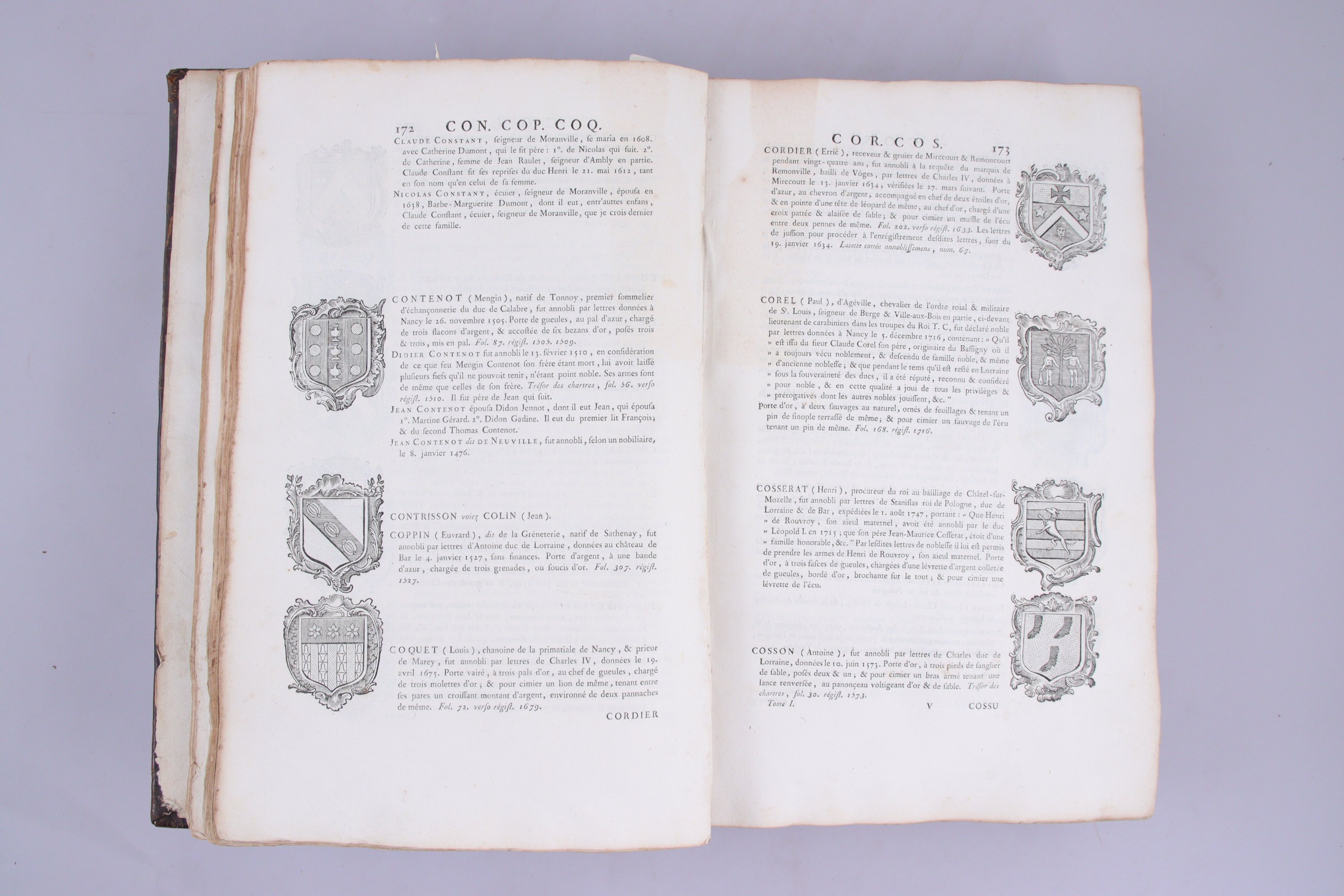 Important ouvrage de généalogie lorraine, très abondamment illustré dans les marges d'environ 1000 blasons. Seul tome publié au XVIIIème siècle, la publication étant interrompue par la mort de l'auteur ; les autres volumes ont été publiés en 1974, sous forme de fac-simile du manuscrit préparatoire, après son acquisition par la Bibliothèque de Nancy.
