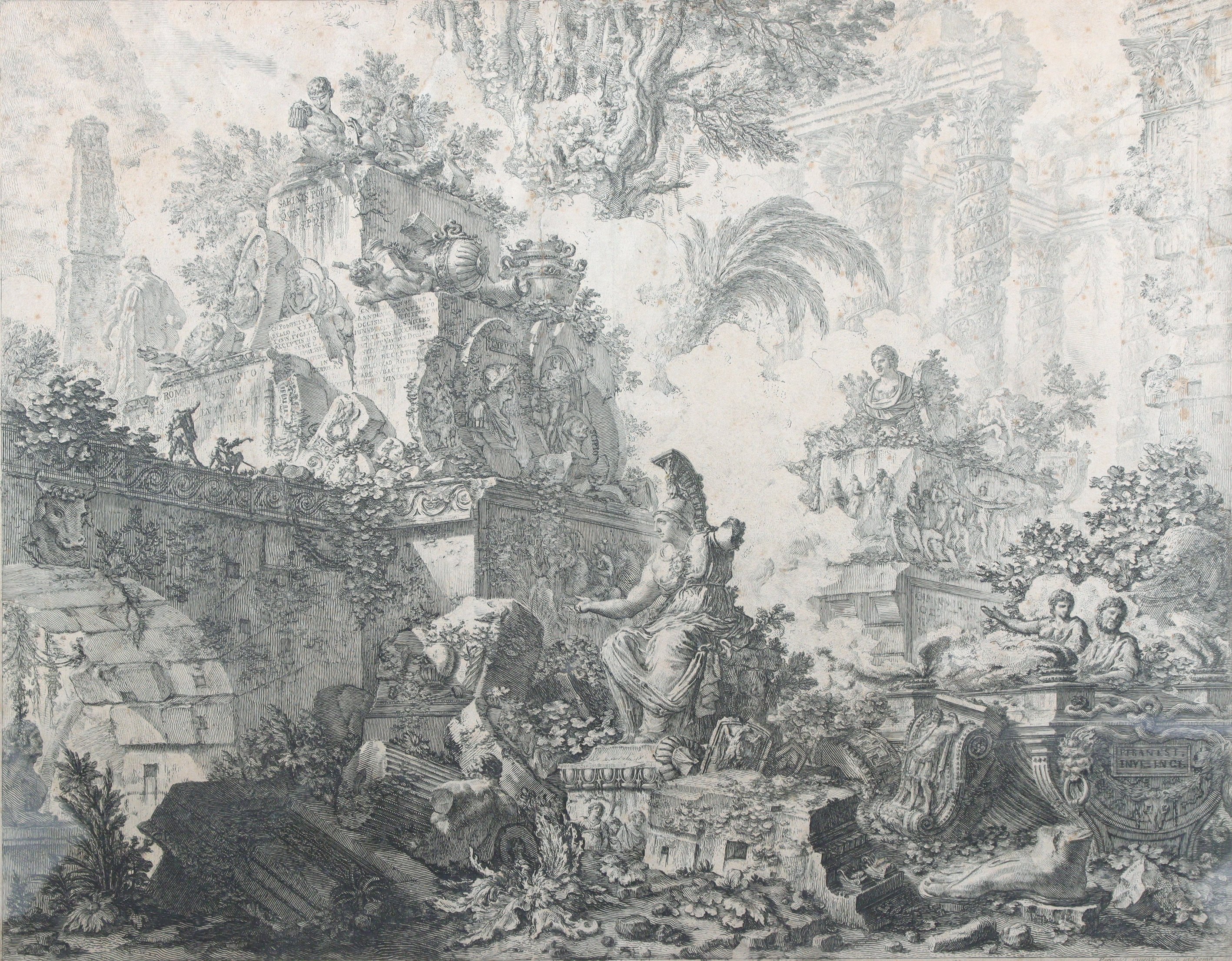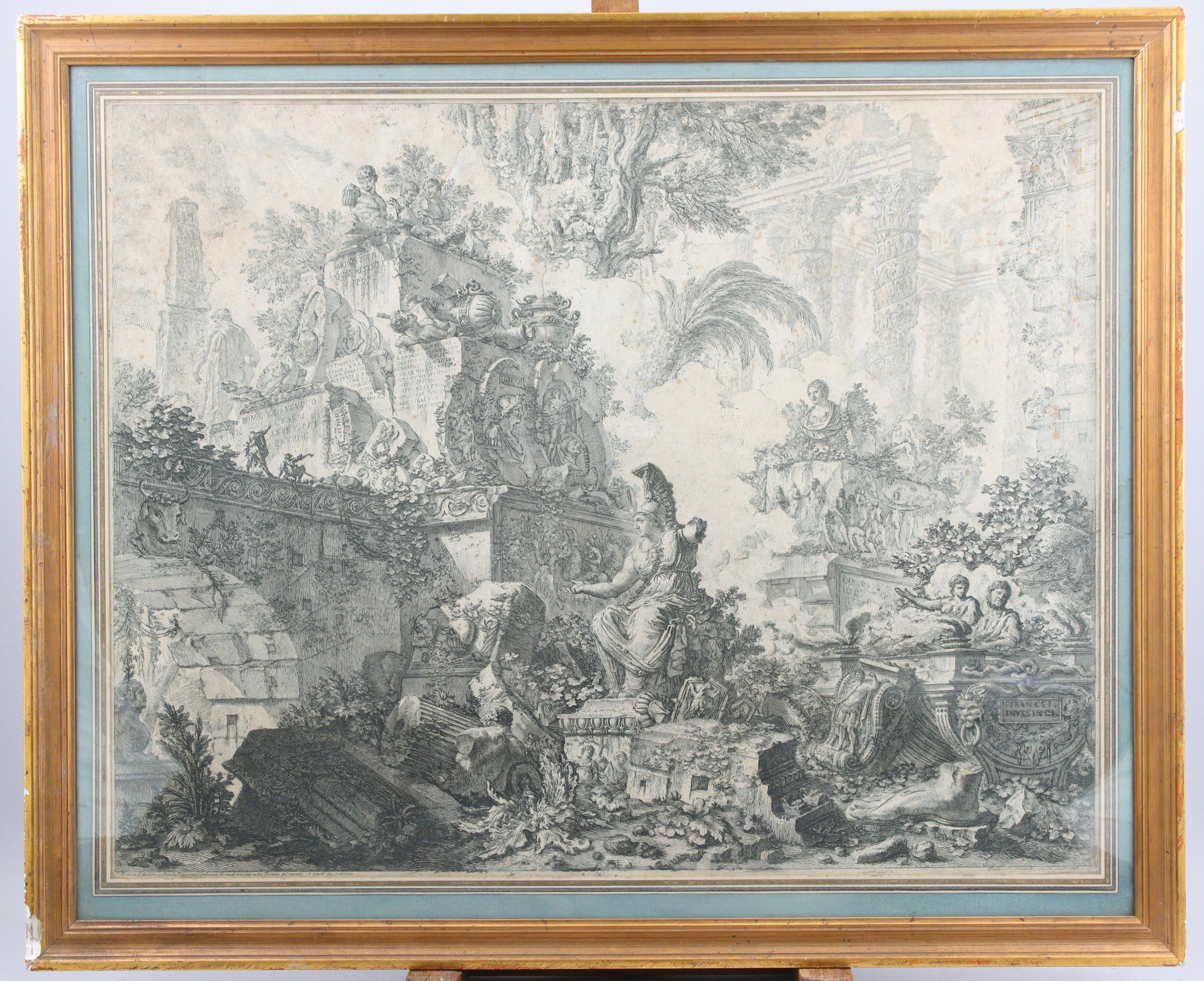 Frontispice pour les Vedute di Roma. Eau-forte. Très belle épreuve avec l'adresse et le prix en bas à gauche. (Hind 2, Wilton-Ely 135)