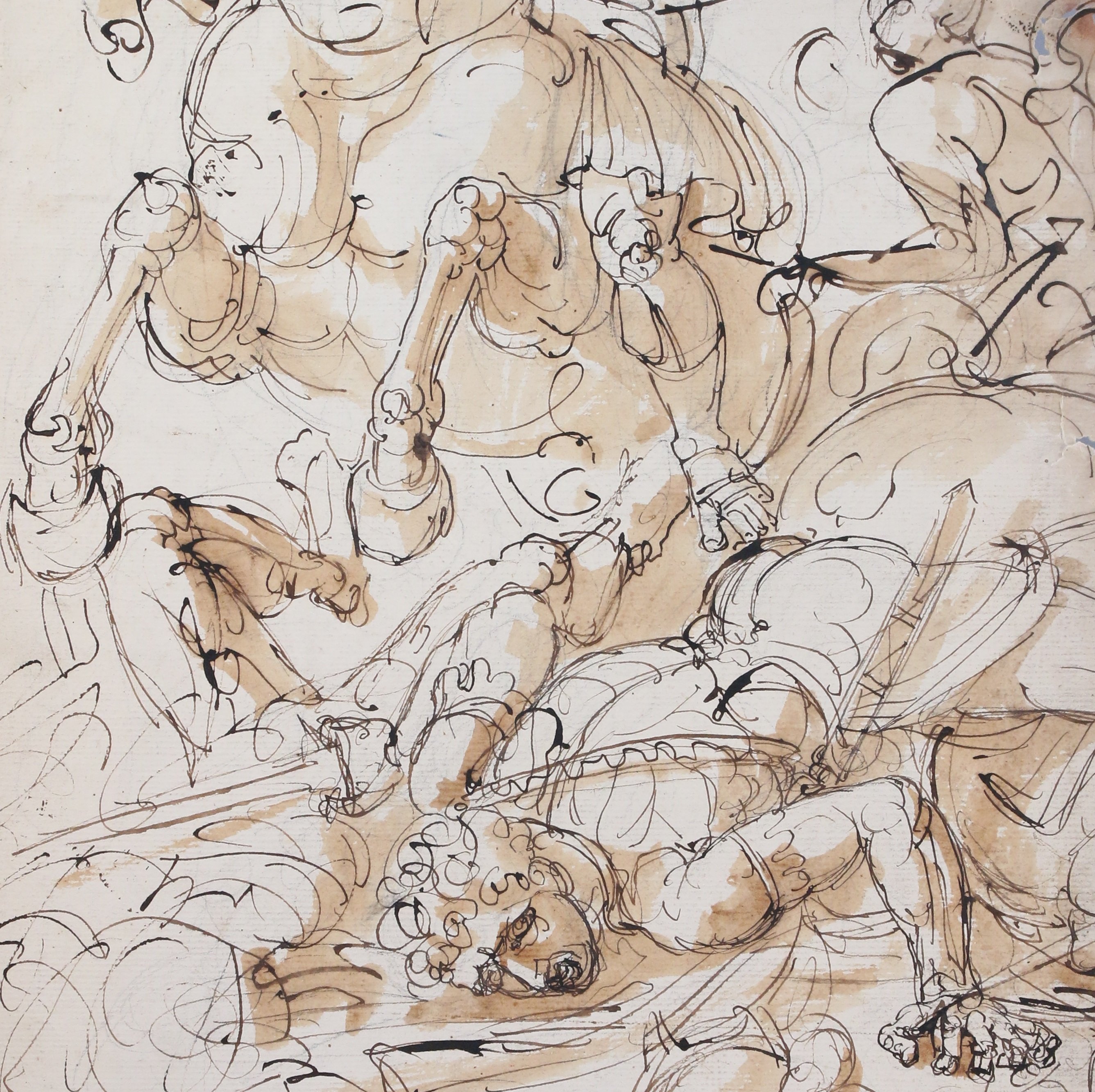 Pierre noire, plume et encre brune, lavis brun.