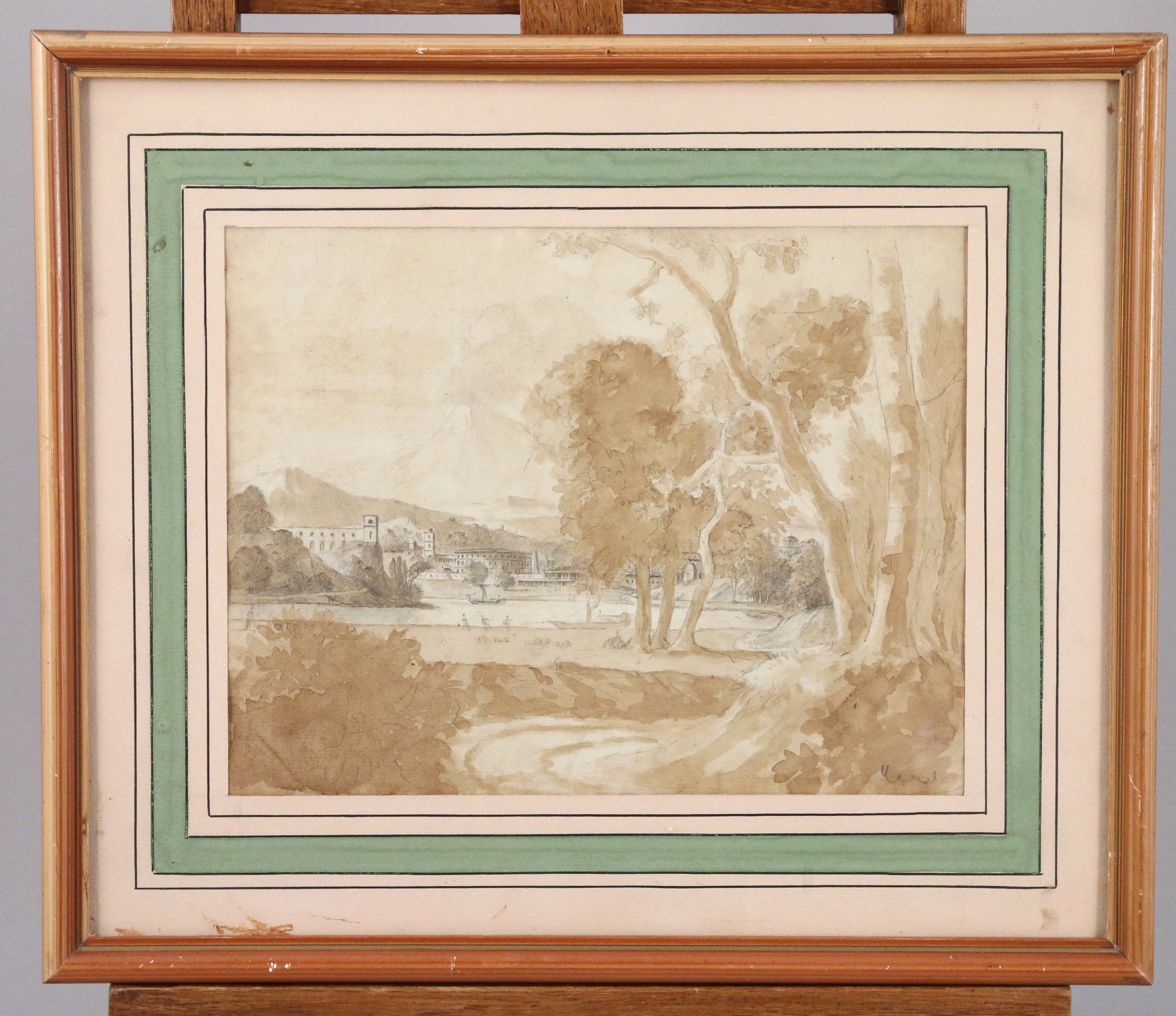 ÉCOLE FRANÇAISE VERS 1800 Paysage italienLavis et crayon.Haut. 18,7, Larg....