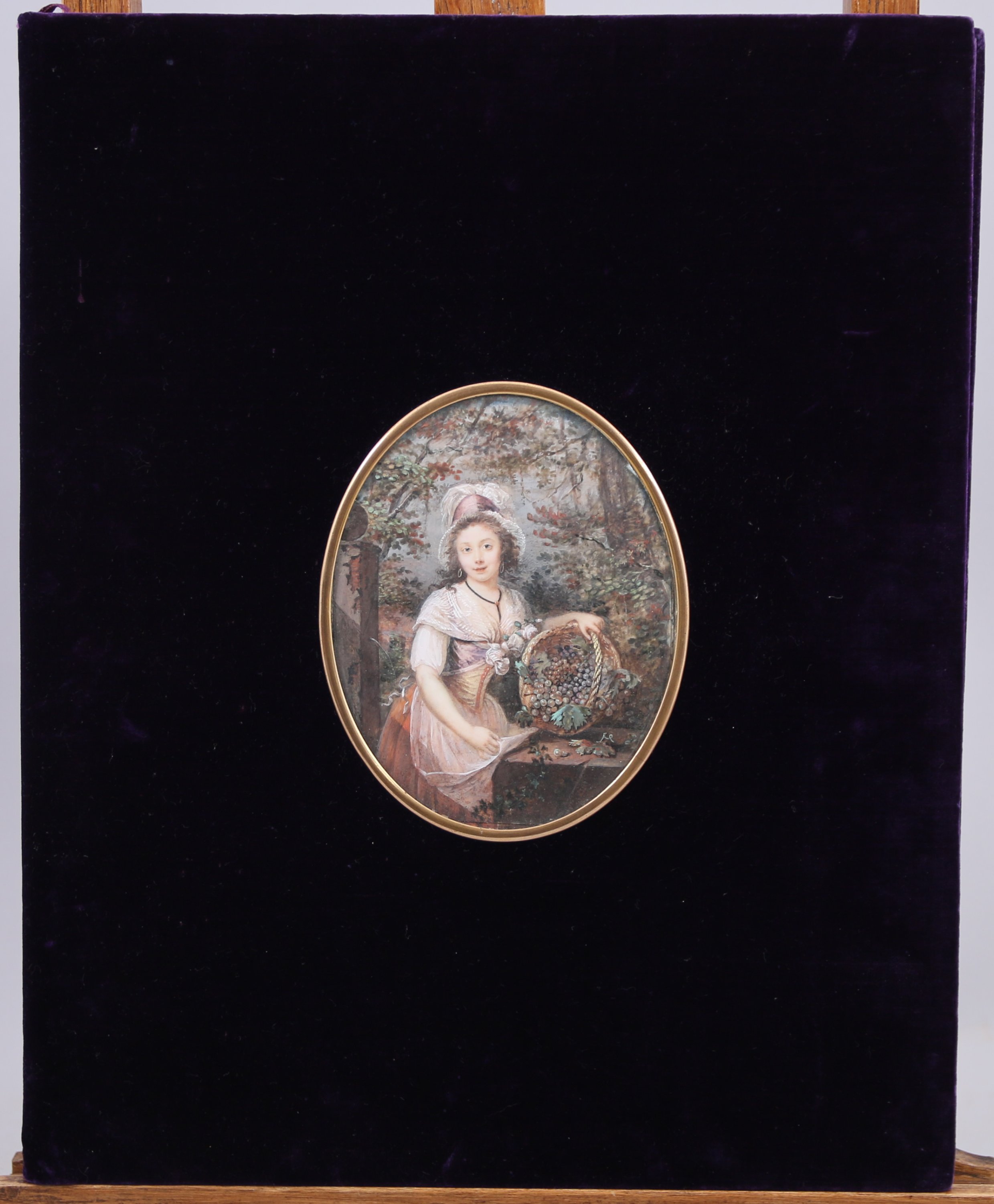 la couverture, foncée d'un velours cramoisi, est ornée d'une belle miniature ovale sur ivoire figurant une jeune vendangeuse (Haut. 13,2, Larg. 10,5 cm).