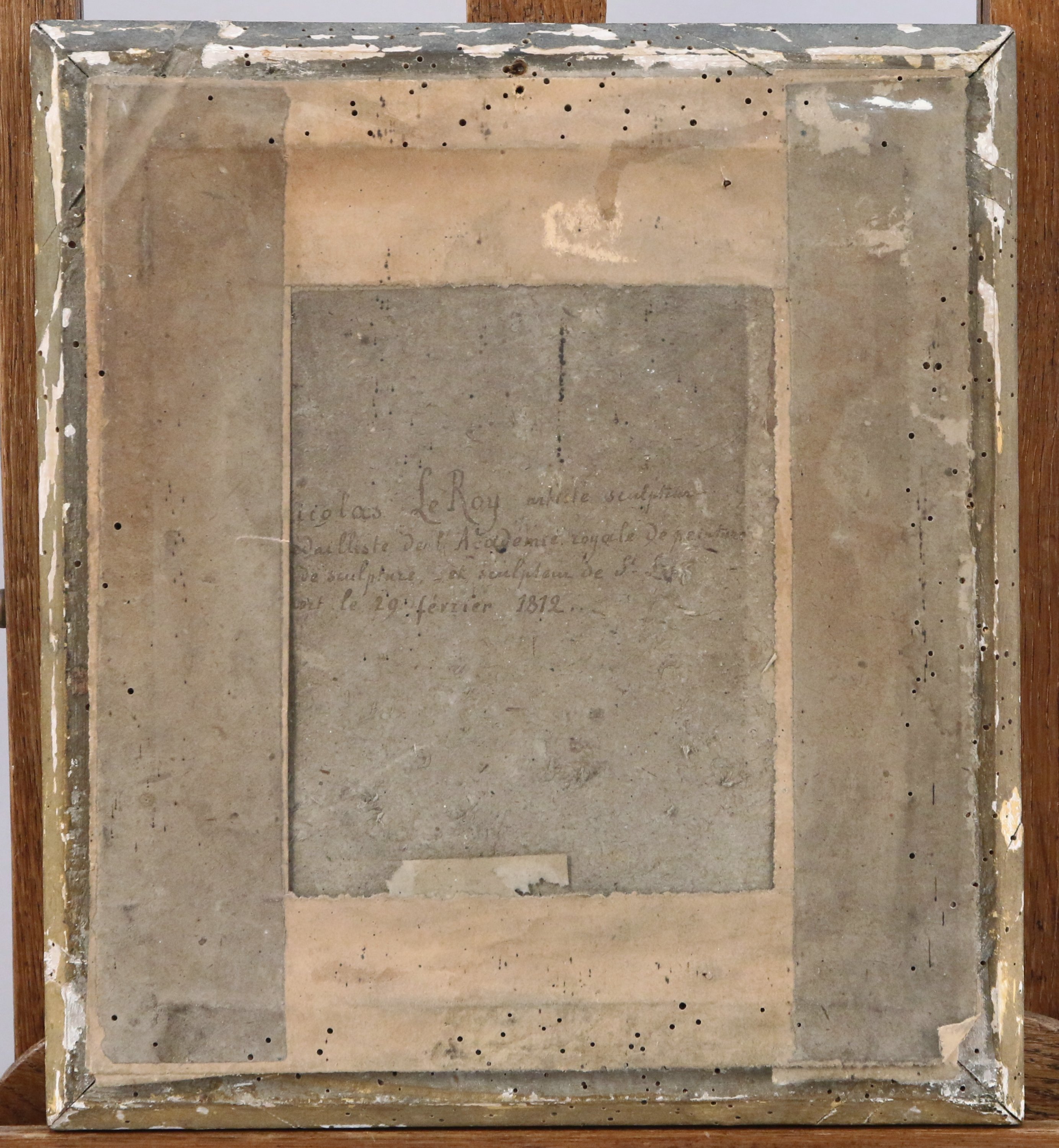 Au dos, porte l'inscription "Nicolas Le Roy artiste sculpteur médailliste de l'académie royale de peinture de sculpture et sculpteur de St Luc, mort le 29 février 1812."