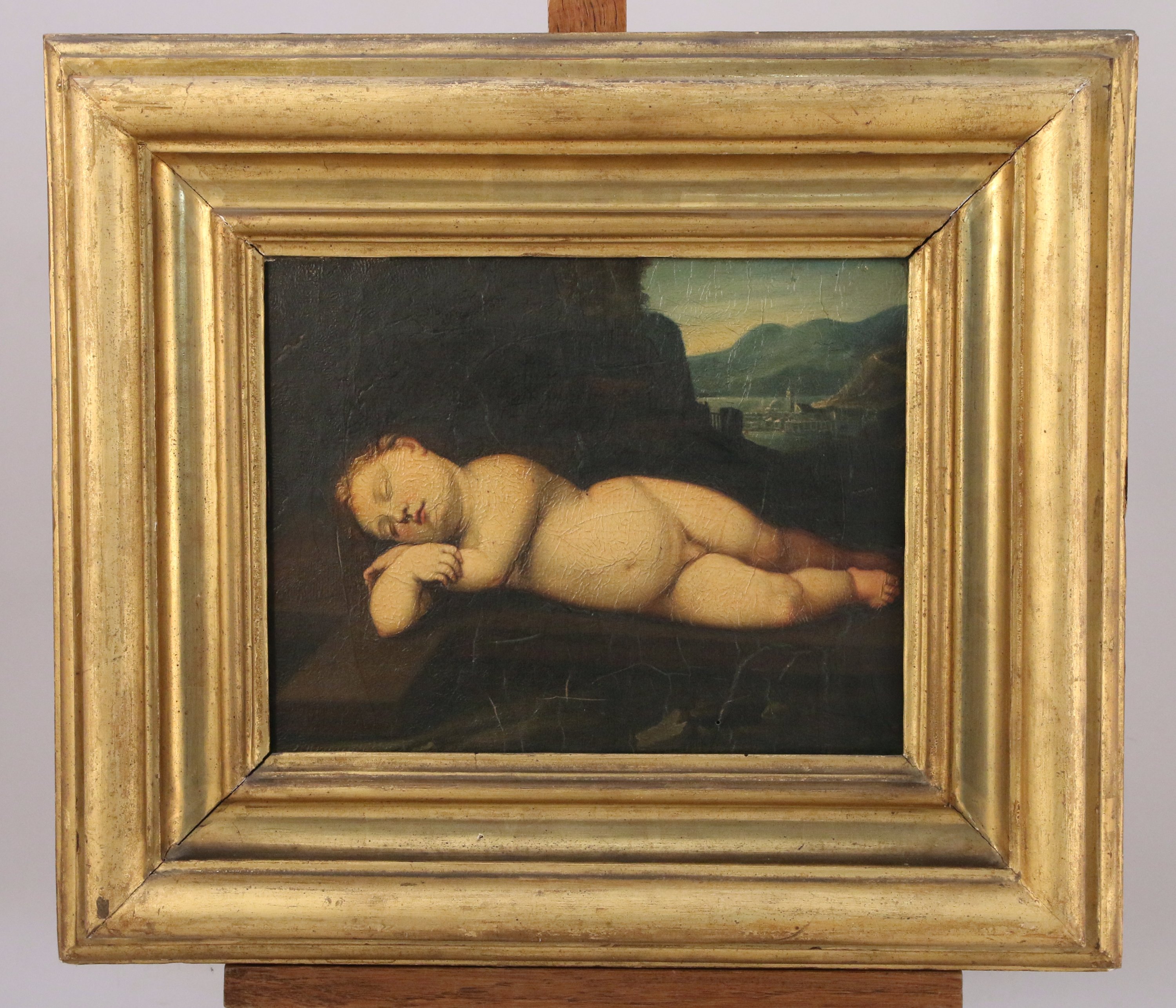 Enfant Jésus dormant sur la croix, vue de Venise au second plan