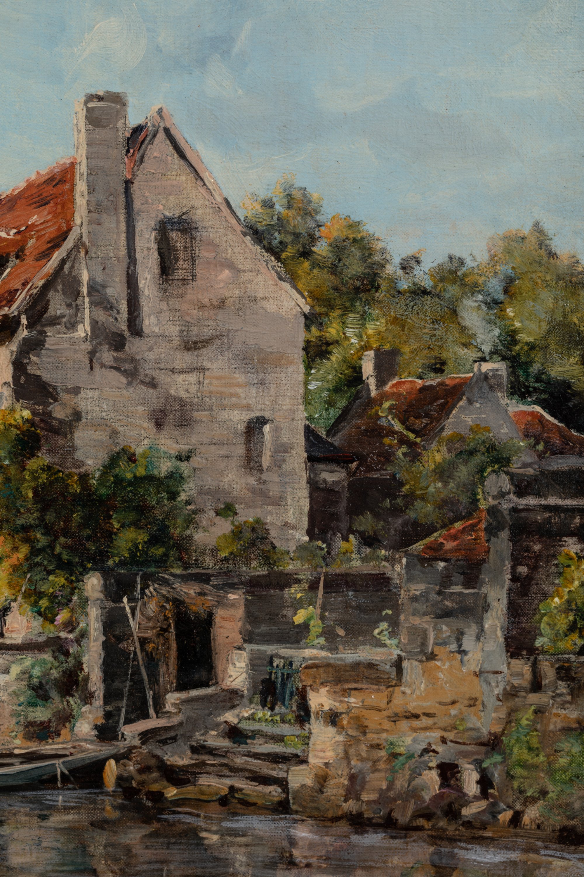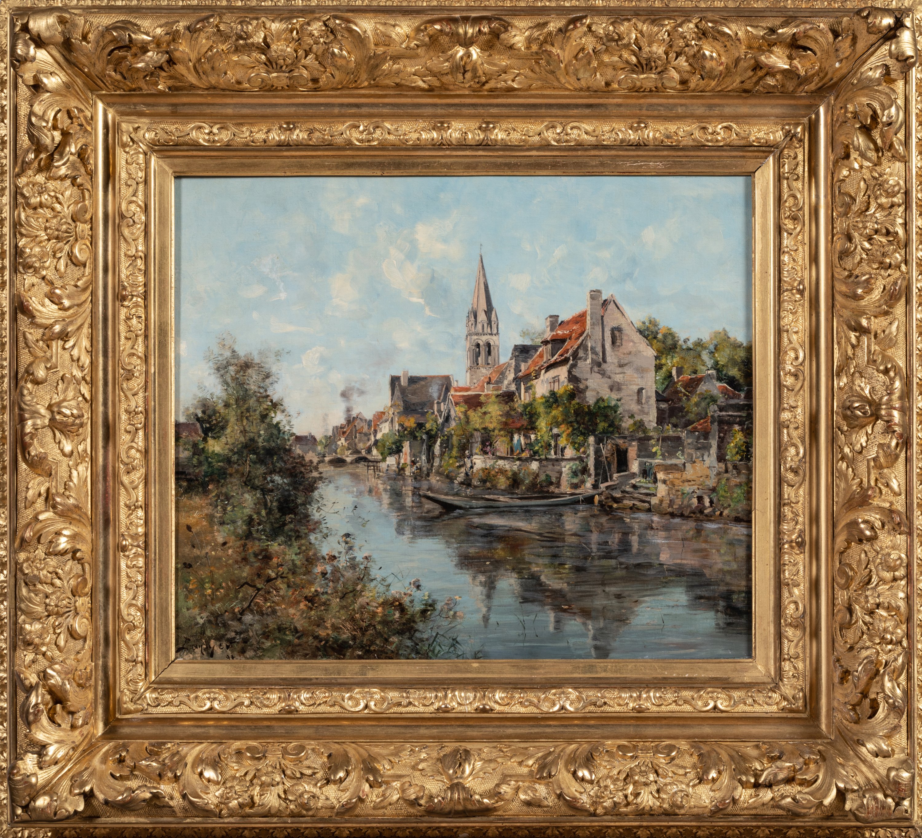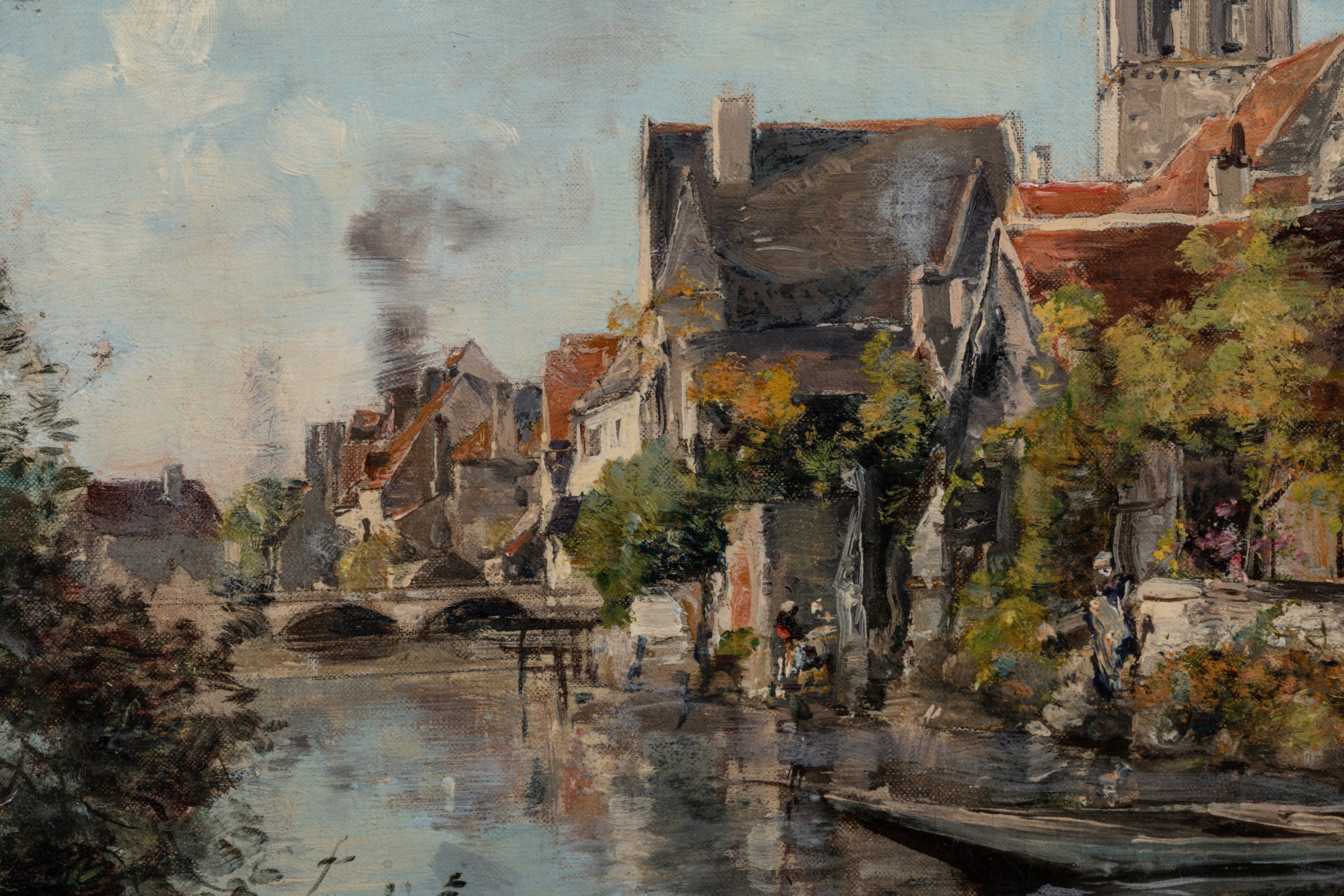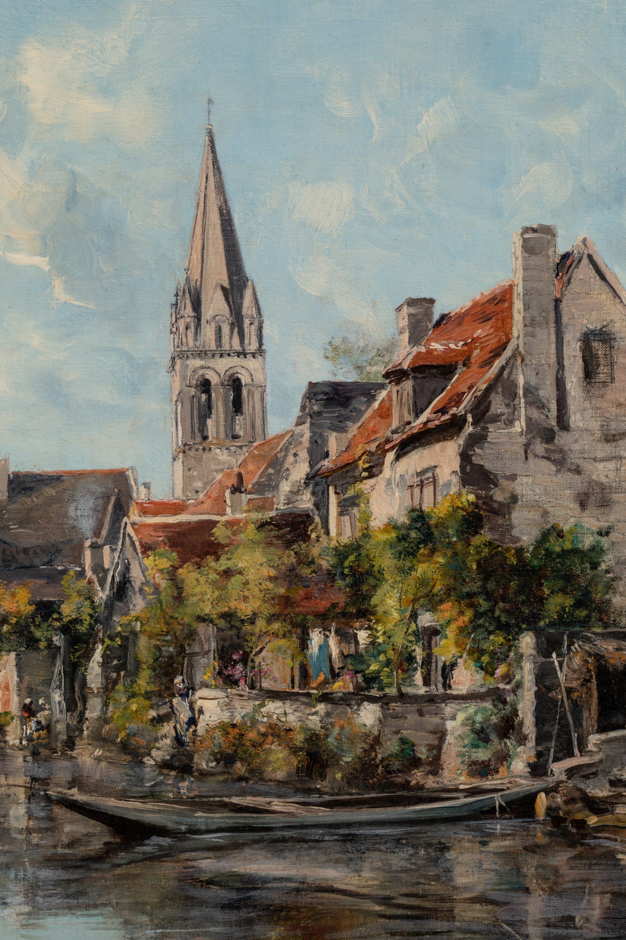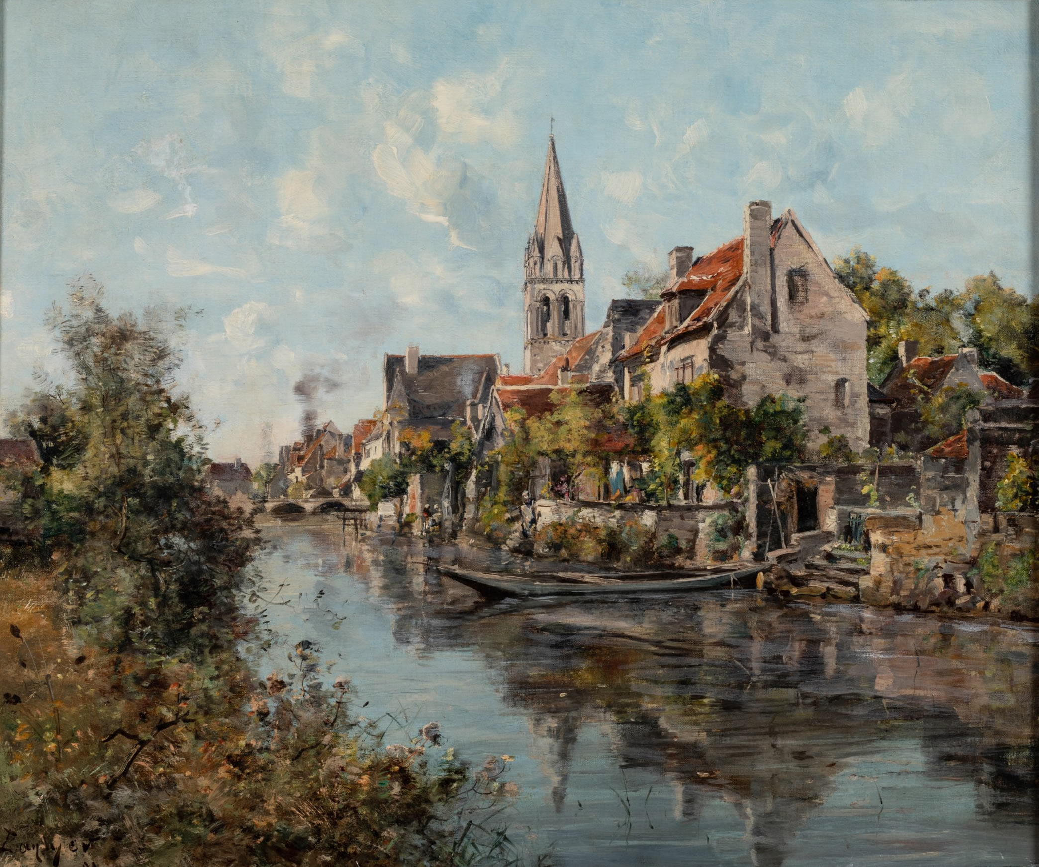 Élève de Gustave Courbet, Emmanuel Lansyer est la figure de proue de l'art en Touraine au XIXe et l'un des plus fameux petits maîtres de l'art français. En ce sens, il est accueilli en vedette à l'exposition nationale de Tours de 1892 et le tableau qu'il présente vendu au trésorier de l'Exposition le 11 août 1892. L'uvre, référencée dans le carnet du musée Emmanuel Lansyer à Loches sous le numéro 1360, correspond à l'inscription apposée sur notre châssis. Il est ainsi décrit: "Le clocher de Beaulieu et vieilles maisons le long du canal. (temps clair). Motif analogue au n° 1157. Vendu à l'Exposition de Tours le 11 août 1892 au trésorier de l'exposition à Tours".