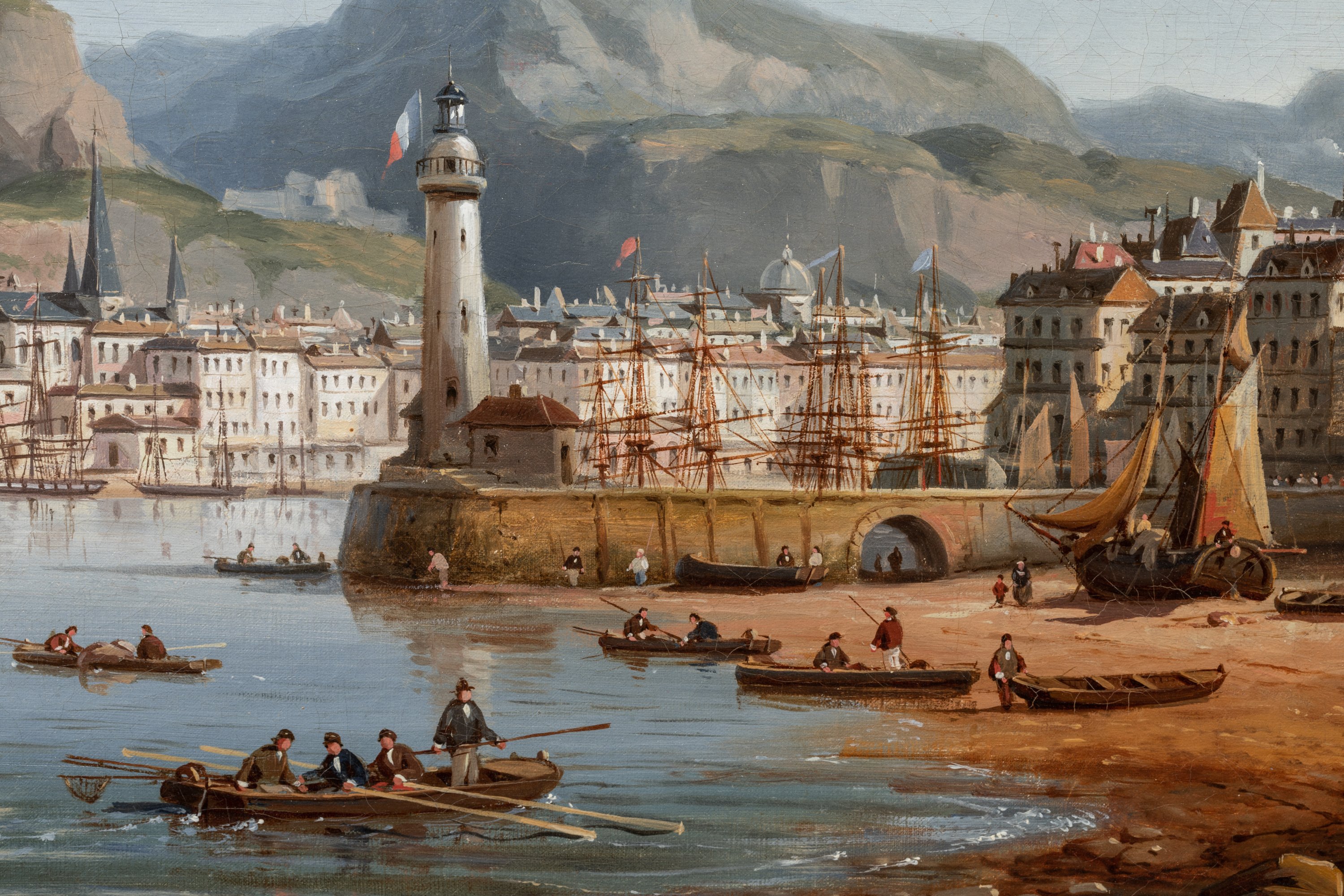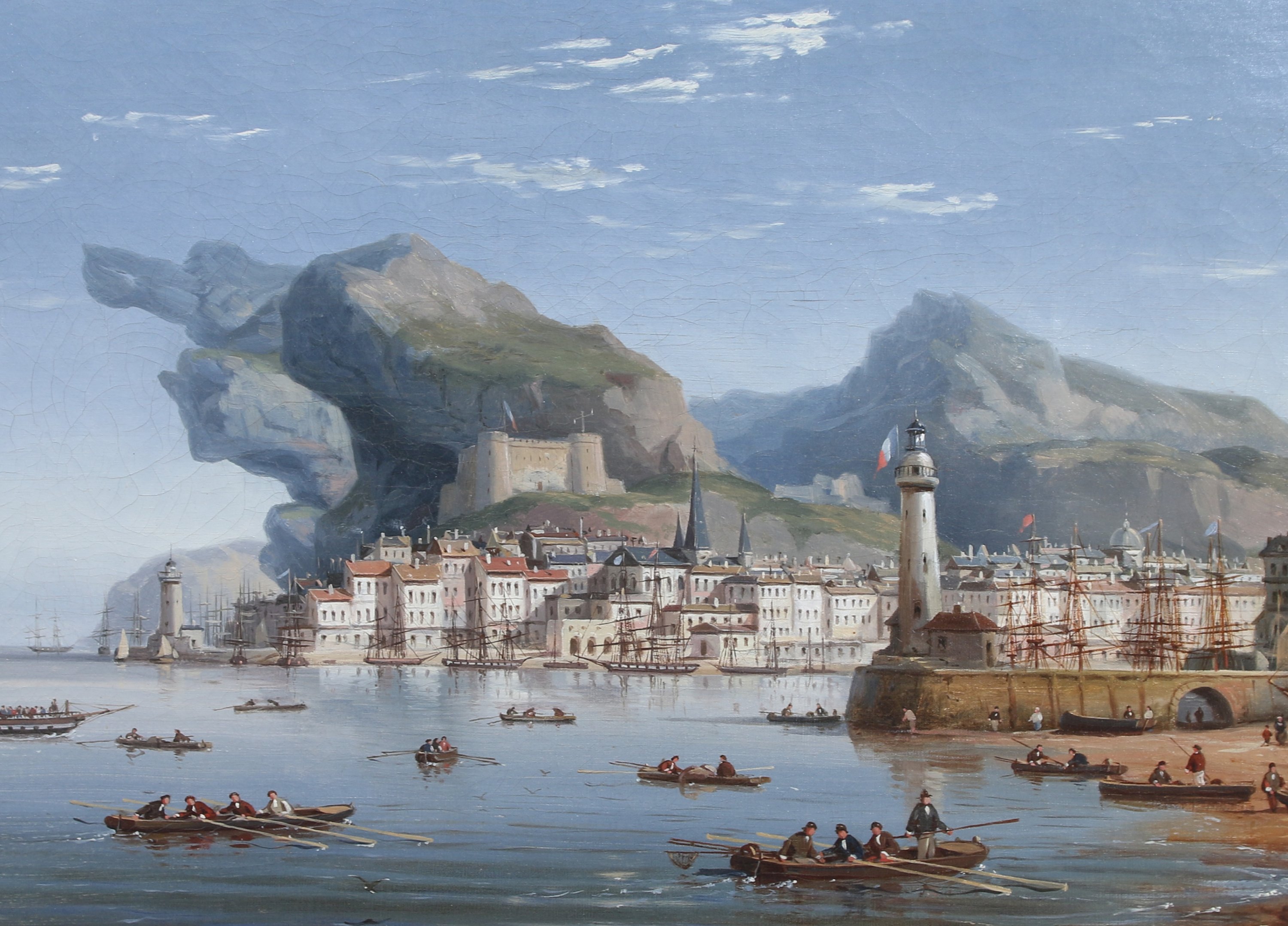 Cette vue imaginaire de l'île volcanique reprend le riche vocabulaire maritime de l'artiste et sa vision romantique des rochers et de la nature. La signature "C Kuwasseg Fils" situe ce tableau avant la mort du père de l'artiste en 1877. La présence de pavillons français indique qu'elle pourrait avoir été réalisée à l'occasion du bi-centenaire de la bataille de Stromboli qui opposa la flotte française à celle des Provinces Unies en 1676.