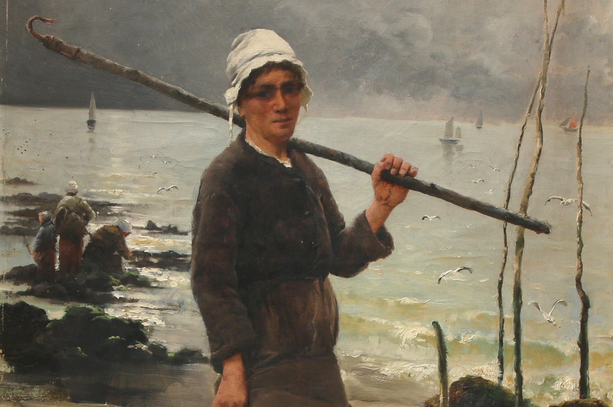 Une pêcheuse revient sur la... portant un croc sur l'épaule gauche et un congre de la main droite.