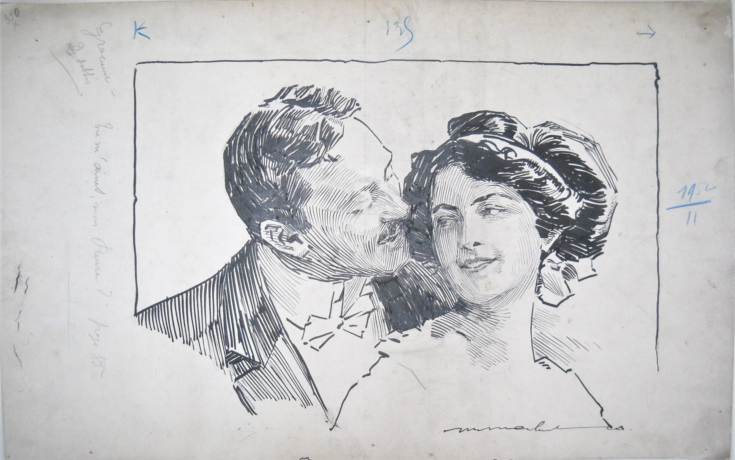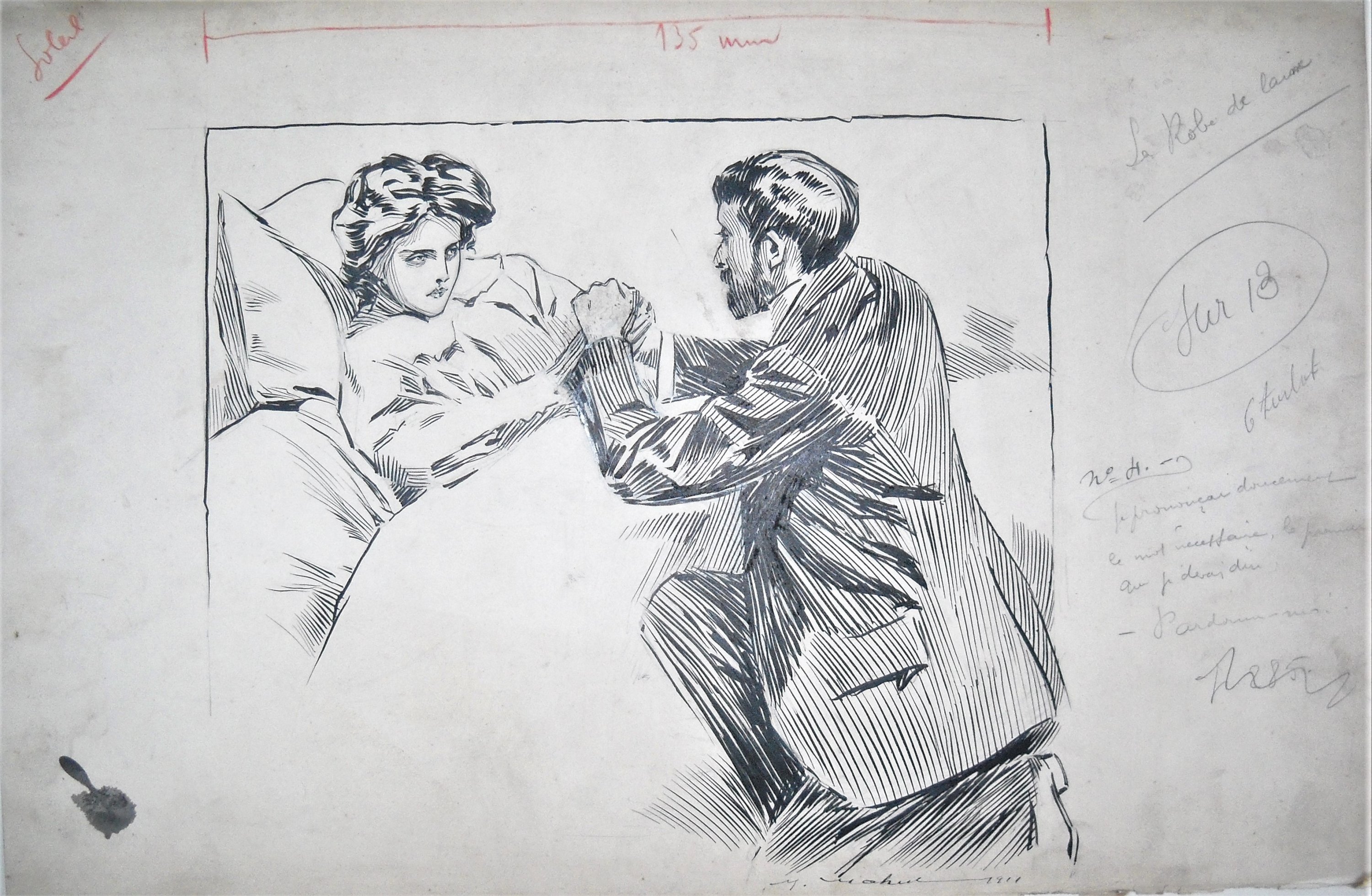 15 planches dessinées à lencre de Chine, chacune reproduisant une scène accompagnée dune légende manuscrite, signées en bas à gauche ou à droite et en majorité datées entre 1908 et 1911. Haut. 30, Larg. 47 cm ; planches destinées à illustrer des feuilletons parus dans les journaux dépoque.