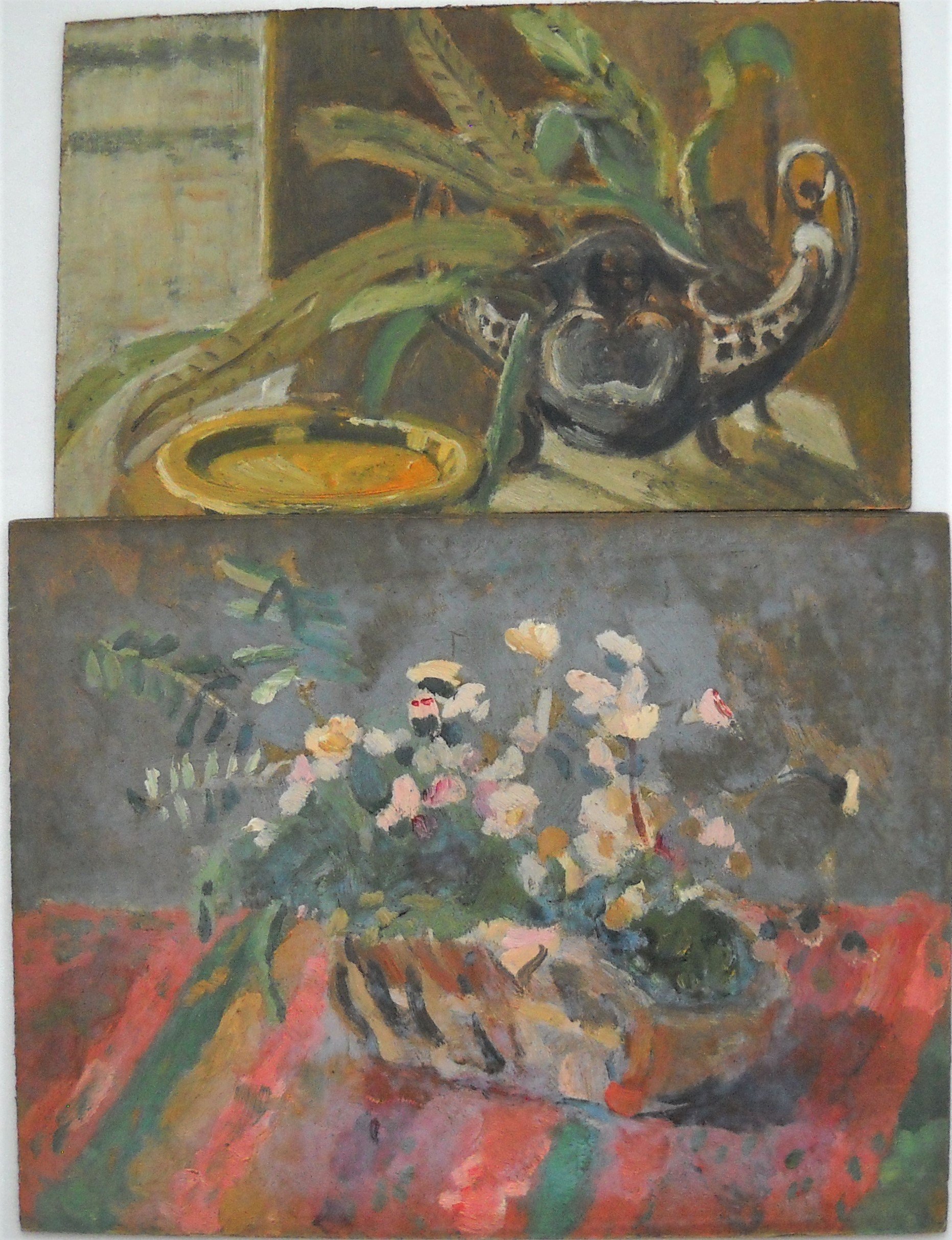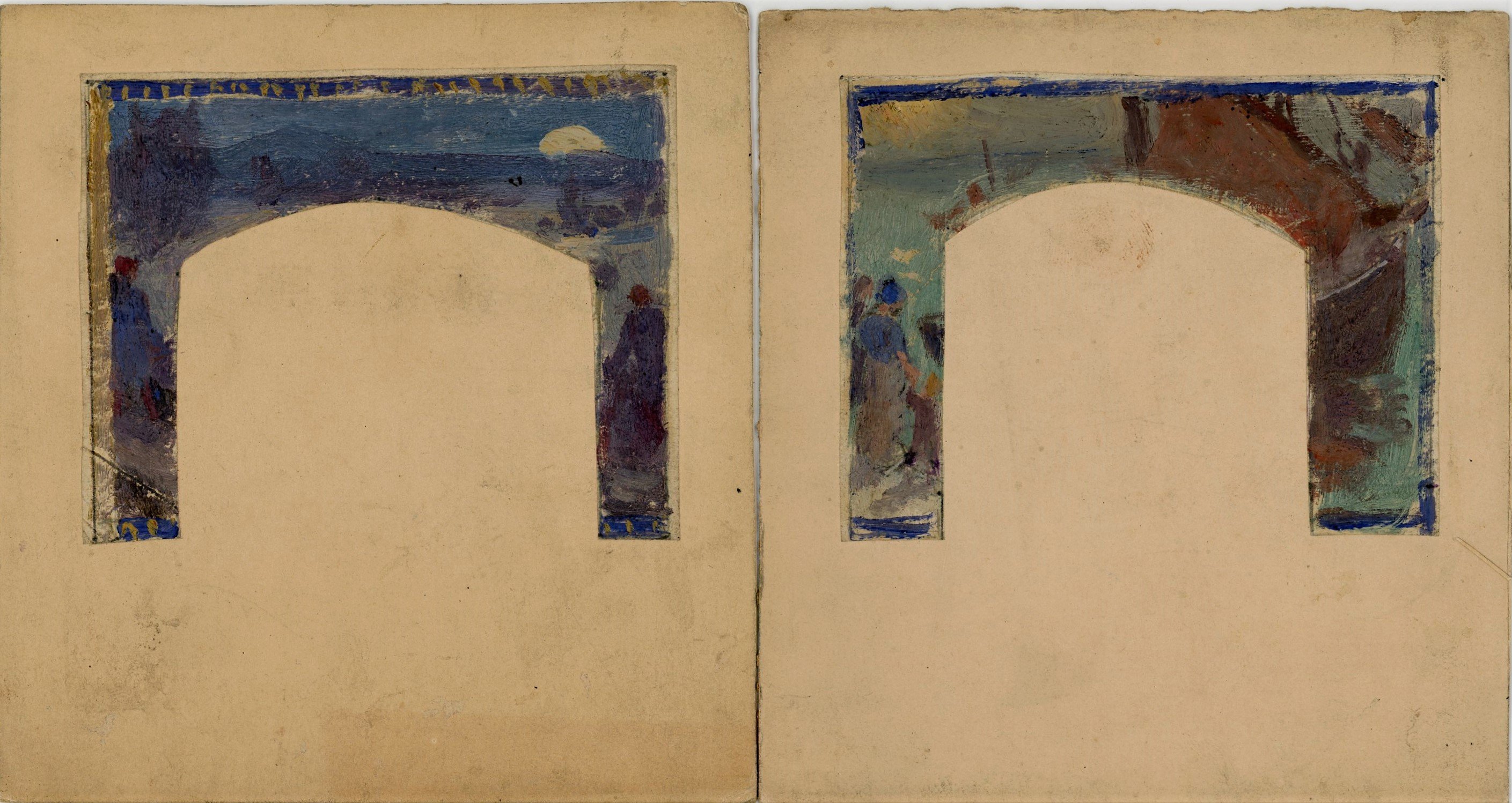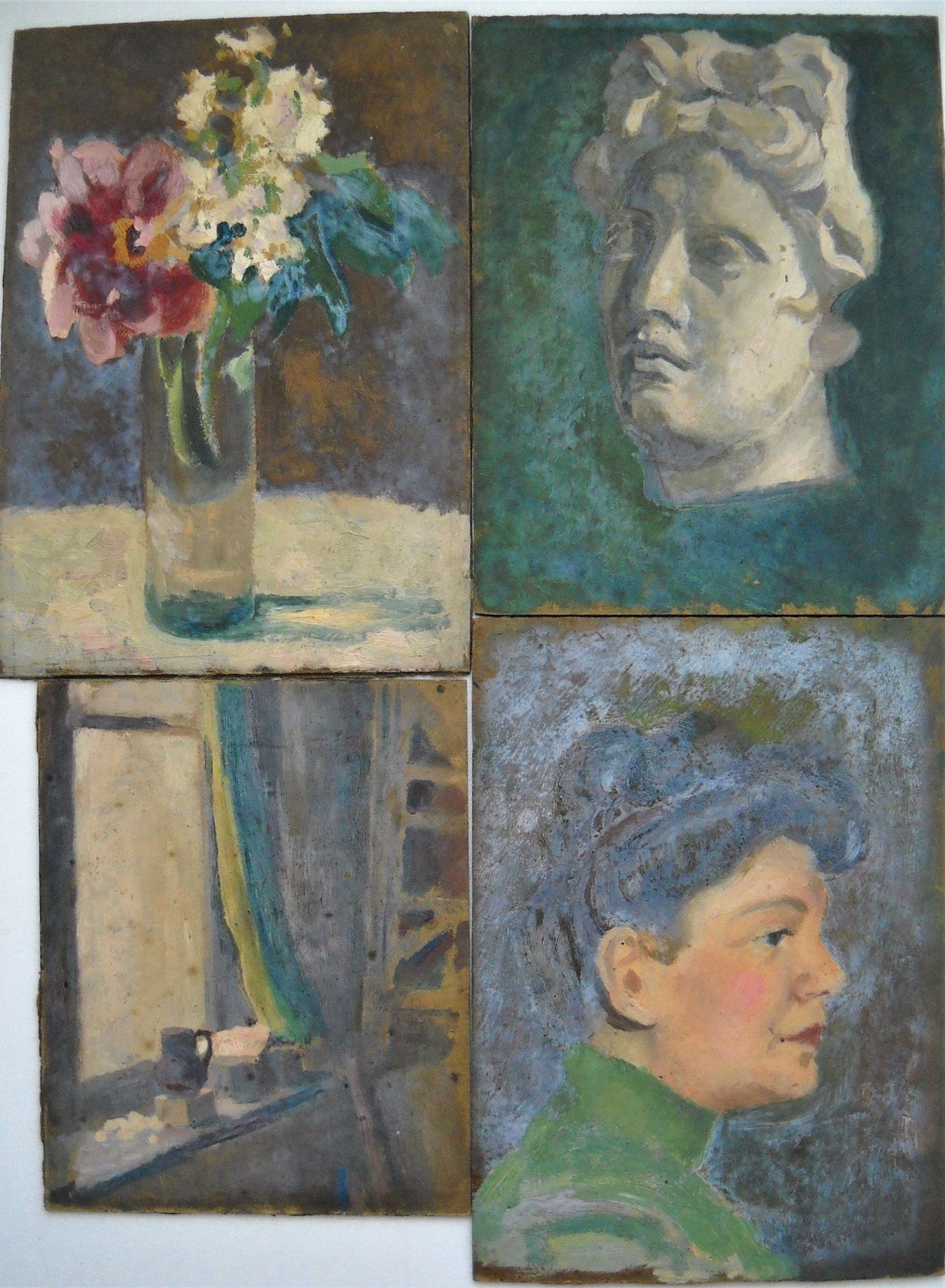 Paysages, décors, portrait et natures mortes à la gouache sur carton.