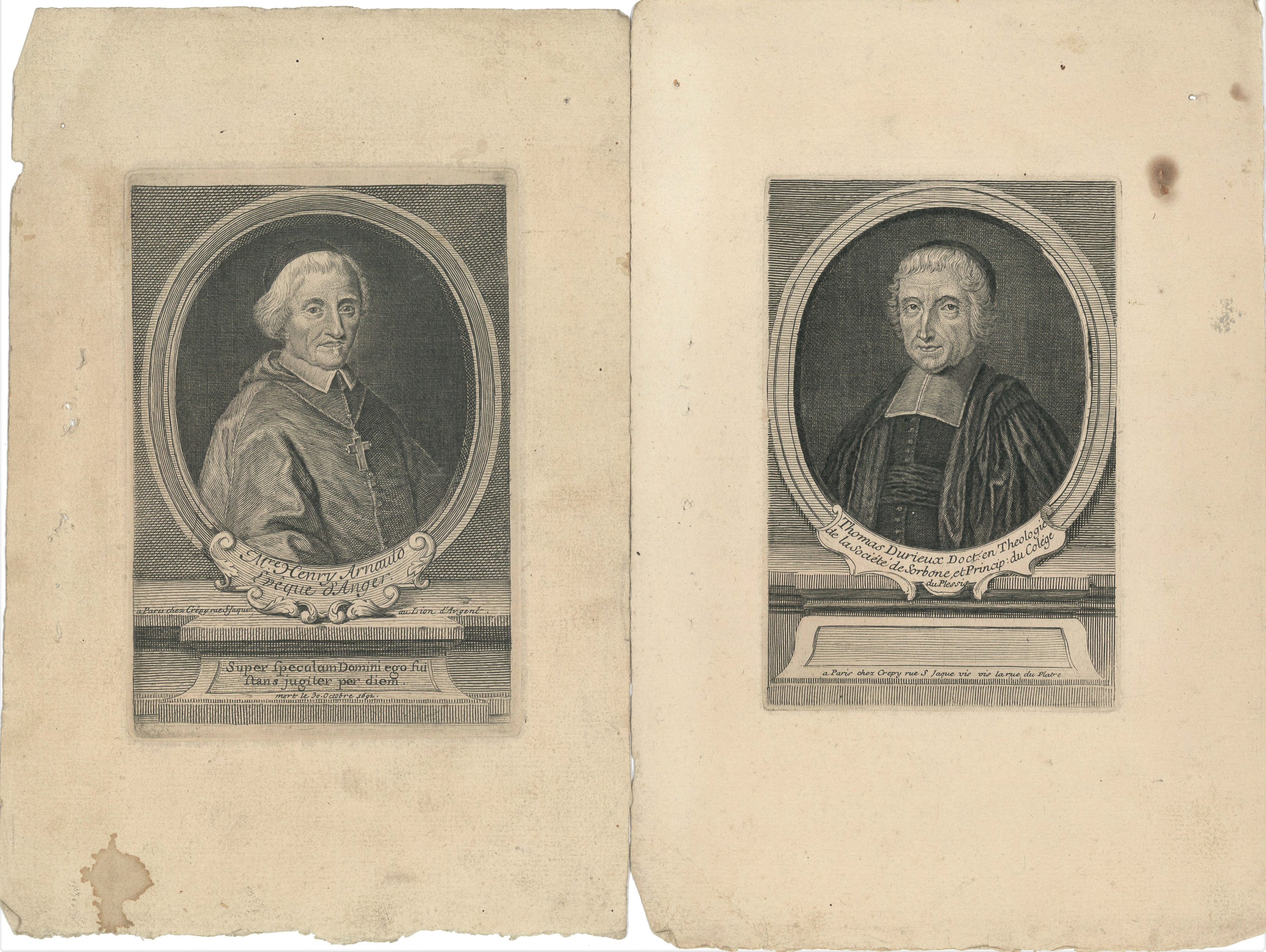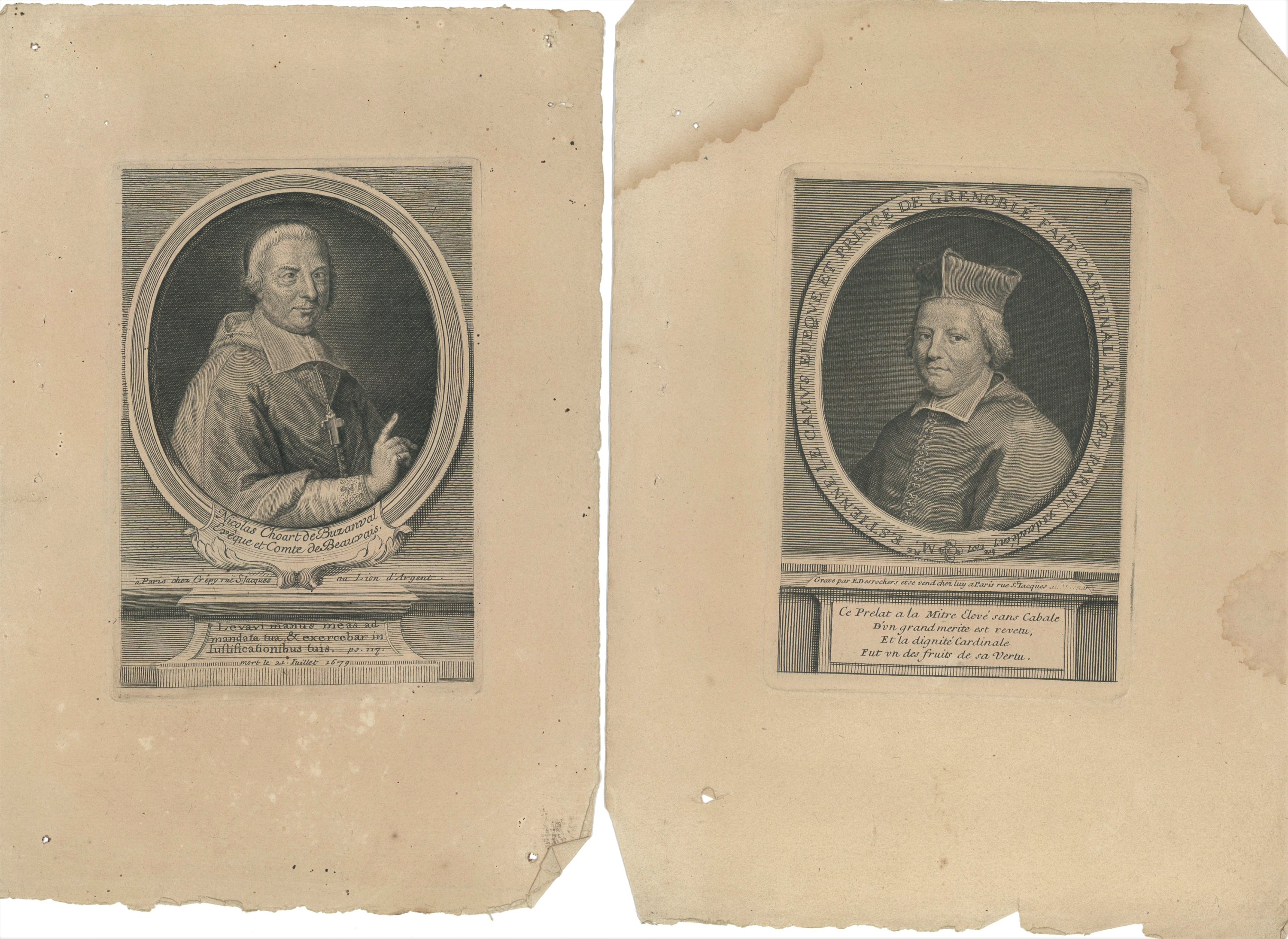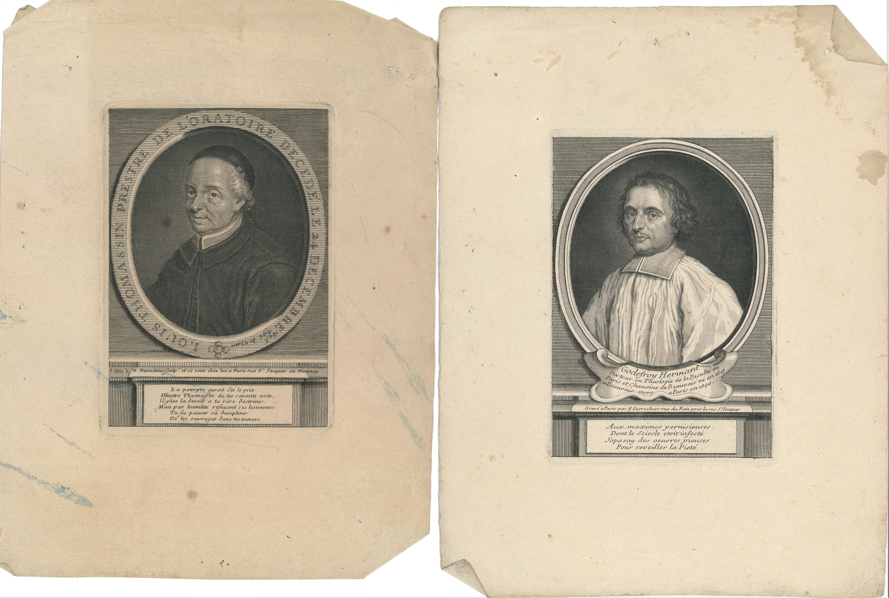 20 portraits de prélats et évêques gravés en taille douce par Crépy et Desroches, imprimeurs rue Saint Jacques à Paris, fin du XVIIe - début du XVIIIe s., formats divers, en létat, dont Louis Thomassin, prêtre de lOratoire ; Nicolas Choart de Buzanval ; évêque et comte de Beauvais ; Isaac Louis Lemaitre de Sacy ; Godefroy Hernant, chanoine de Beauvais ; Henry Arnauld évêque dAngers ; Thomas Durieux, principal du collège du Plessis, etc.