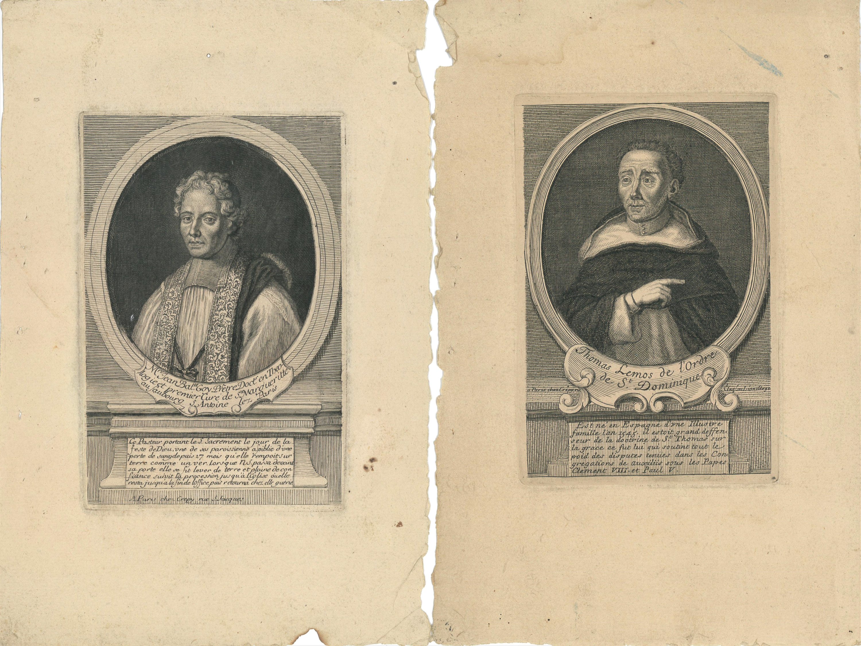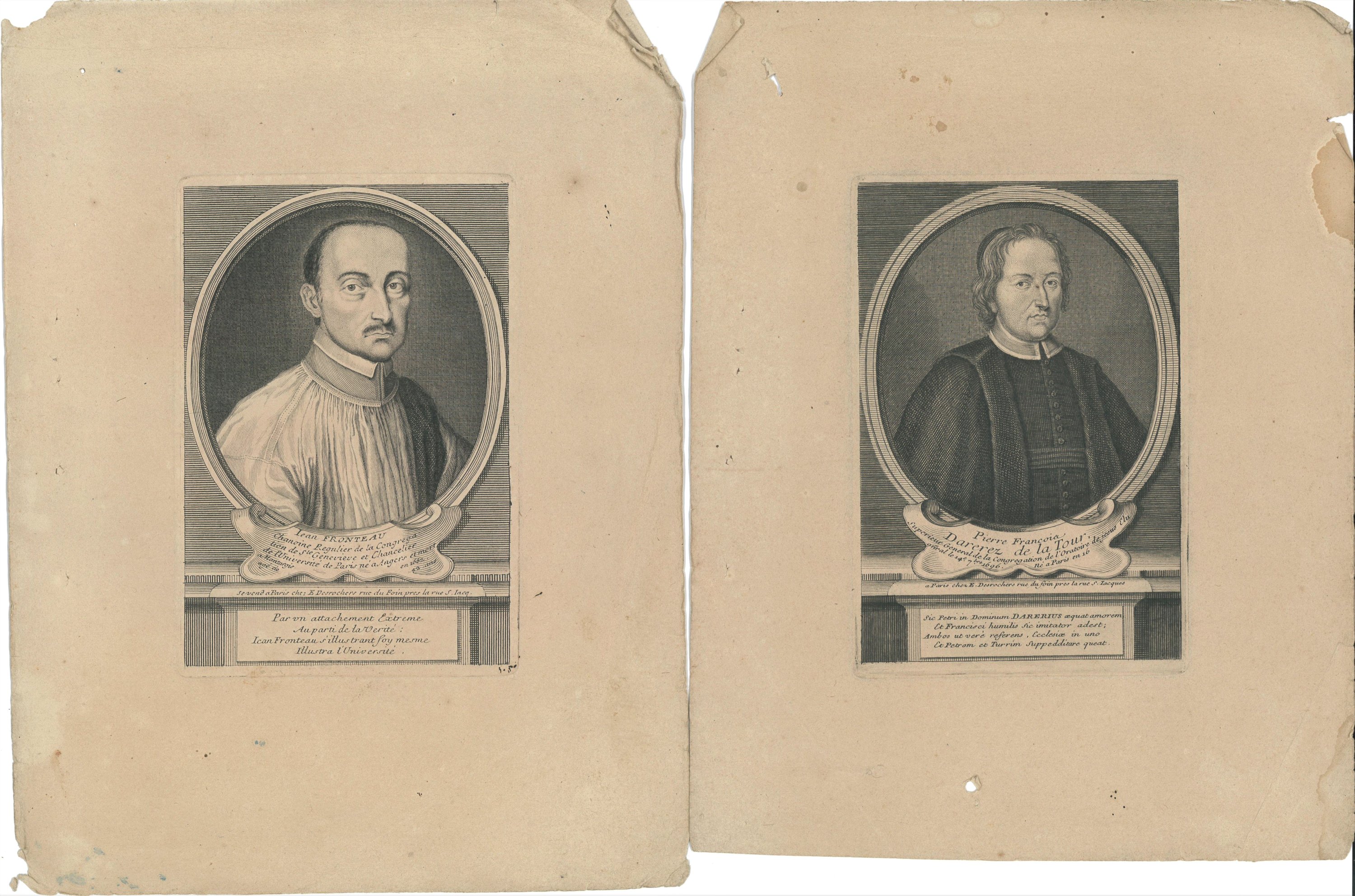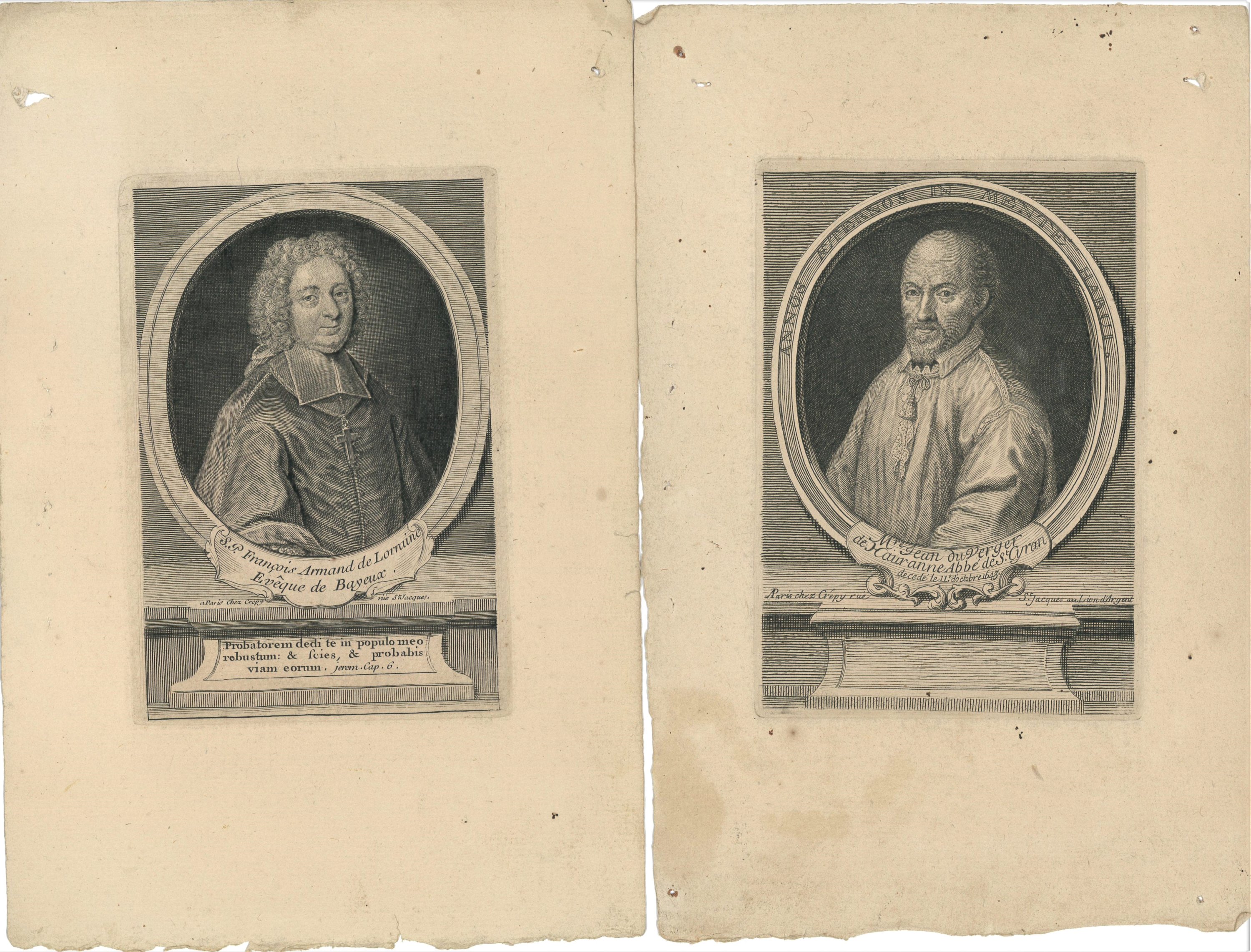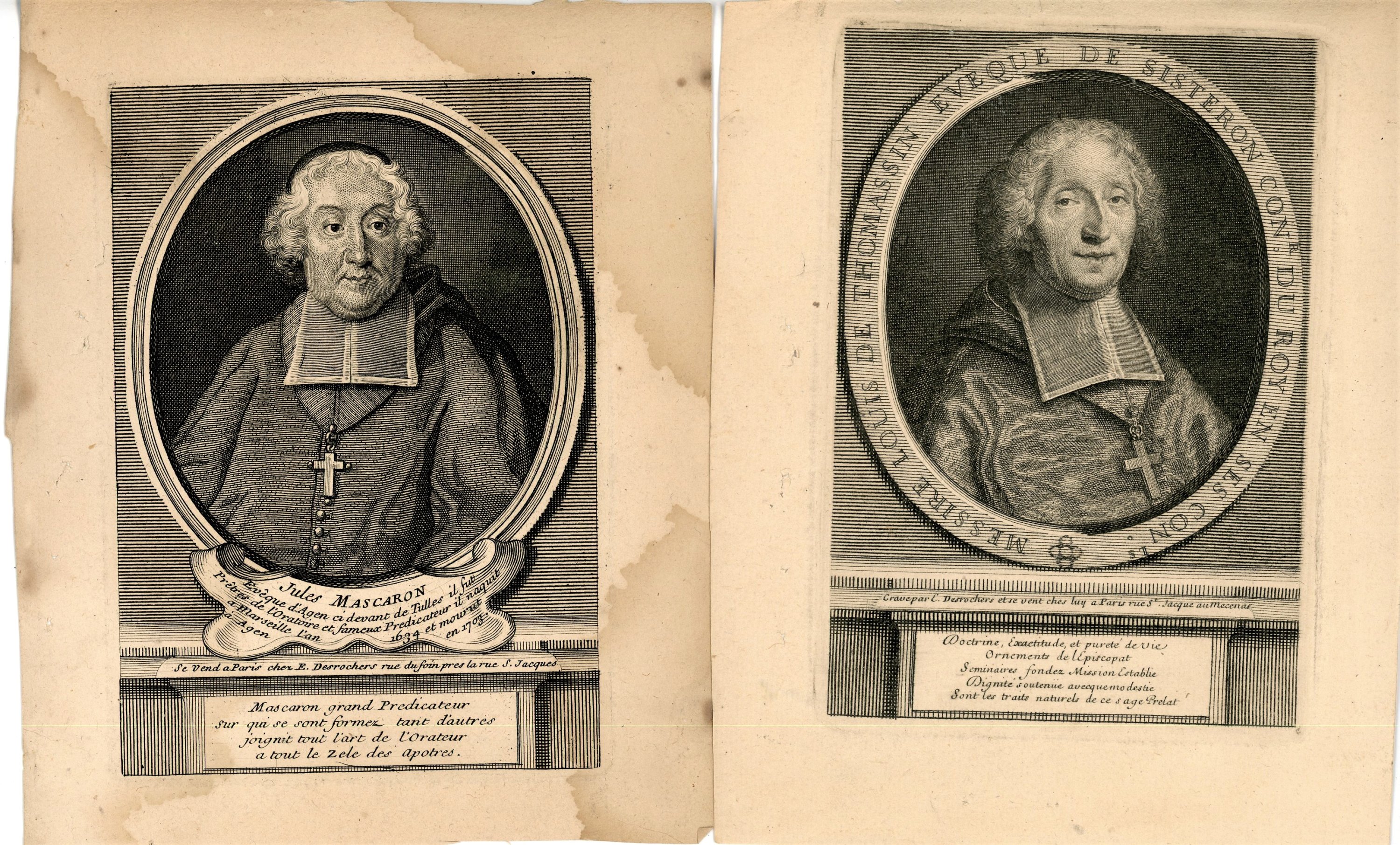 20 portraits de prélats et évêques gravés en taille douce par Crépy et Desroches, imprimeurs rue Saint Jacques à Paris, fin du XVIIe - début du XVIIIe s., formats divers, en létat, dont Louis Thomassin, prêtre de lOratoire ; Nicolas Choart de Buzanval ; évêque et comte de Beauvais ; Isaac Louis Lemaitre de Sacy ; Godefroy Hernant, chanoine de Beauvais ; Henry Arnauld évêque dAngers ; Thomas Durieux, principal du collège du Plessis, etc.