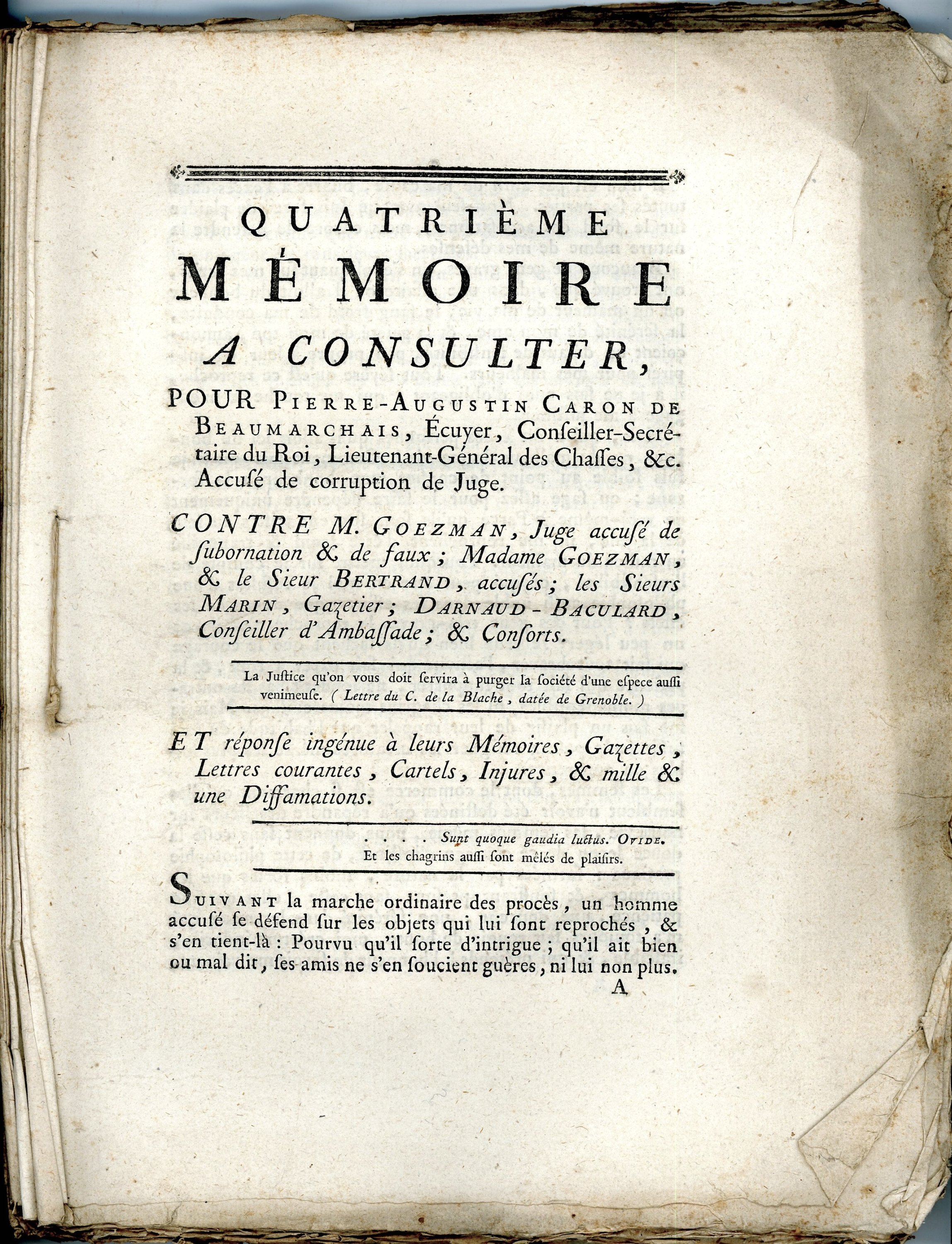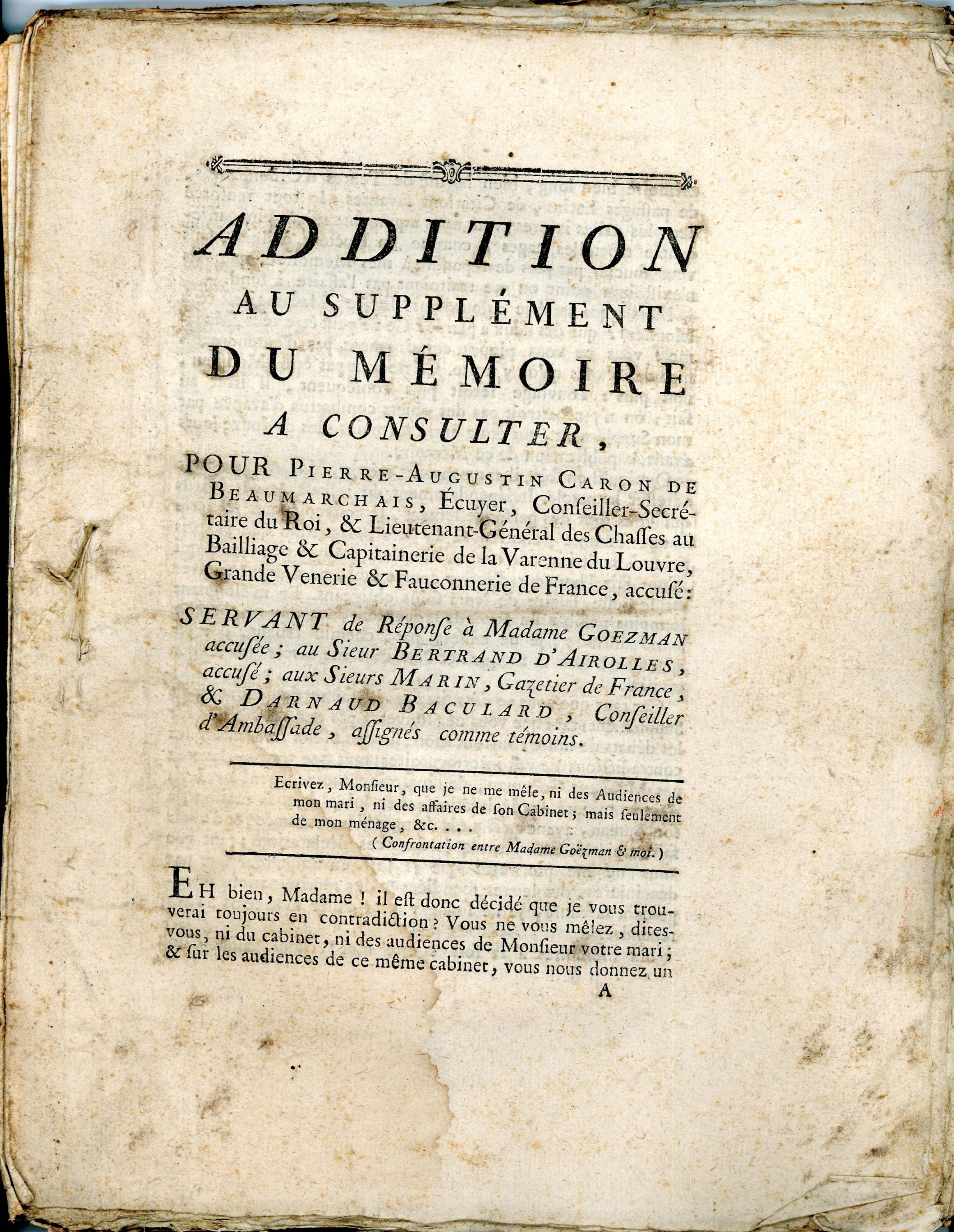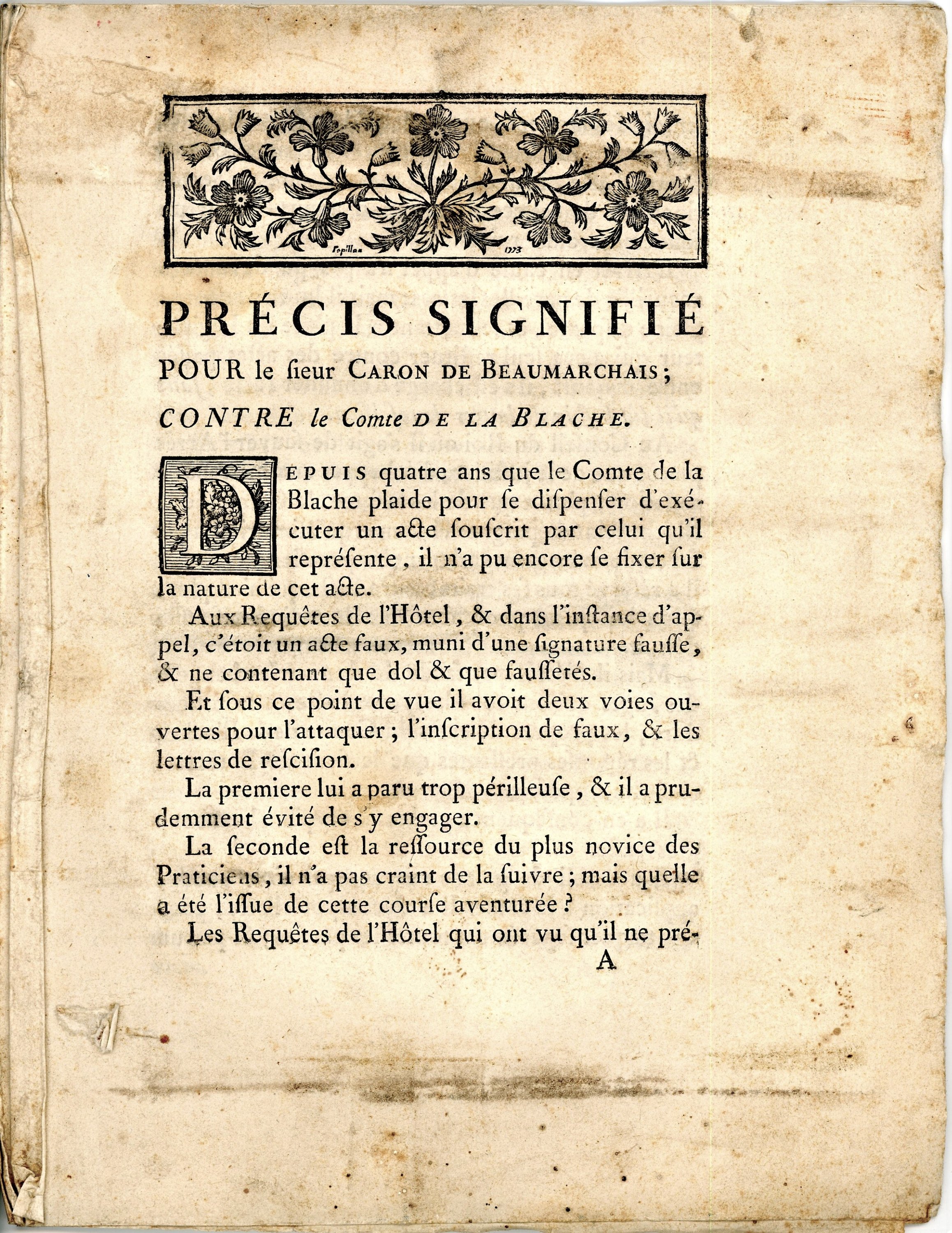 Lot de 8 mémoires, 1773-1775, + de 545 pages in-4, dont 6 relatifs à Pierre-Augustin Caron de BEAUMARCHAIS ; Faire-part de mariage du 23 septembre 1754, église paroissiale de Saint-Roch.