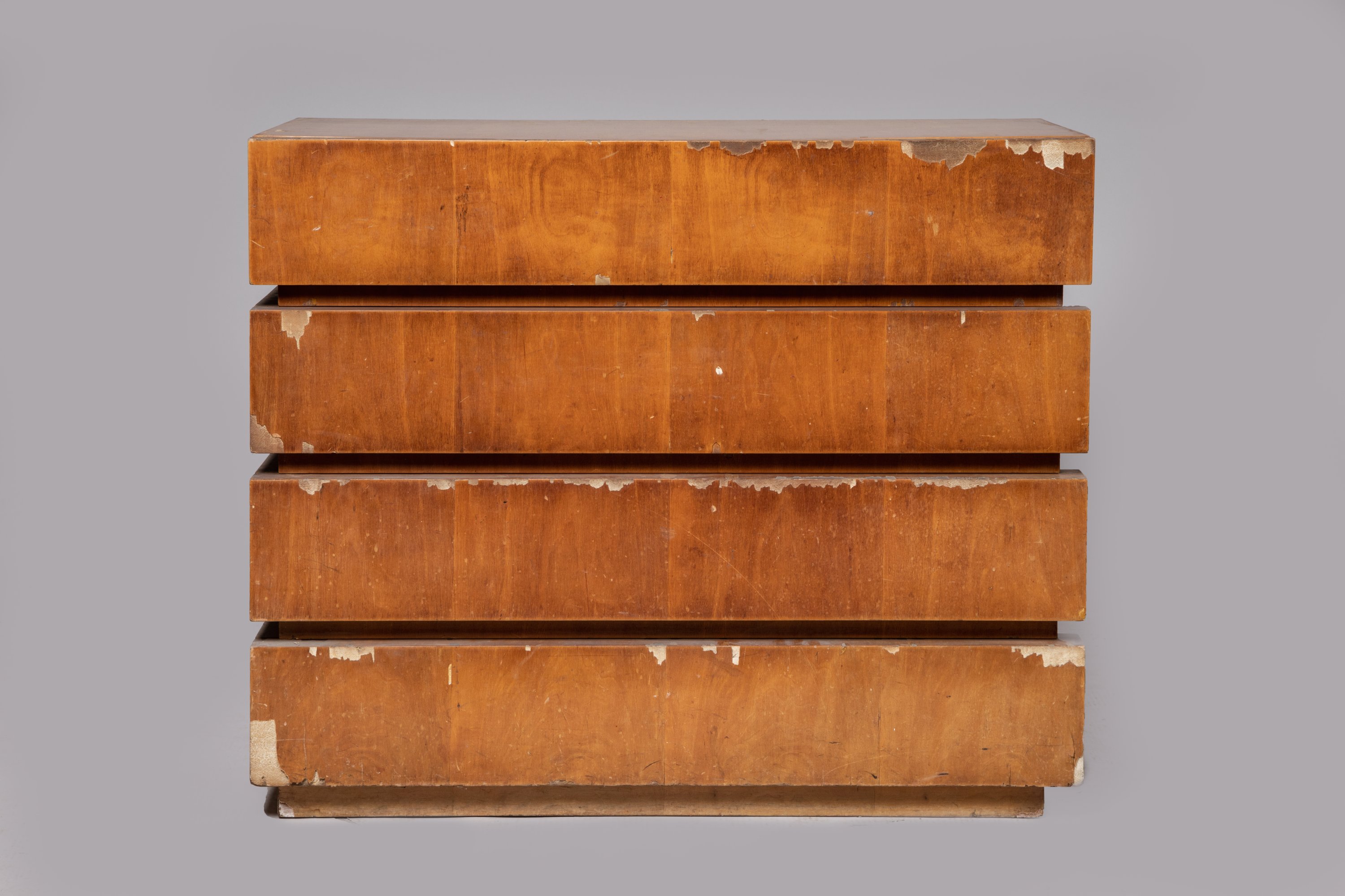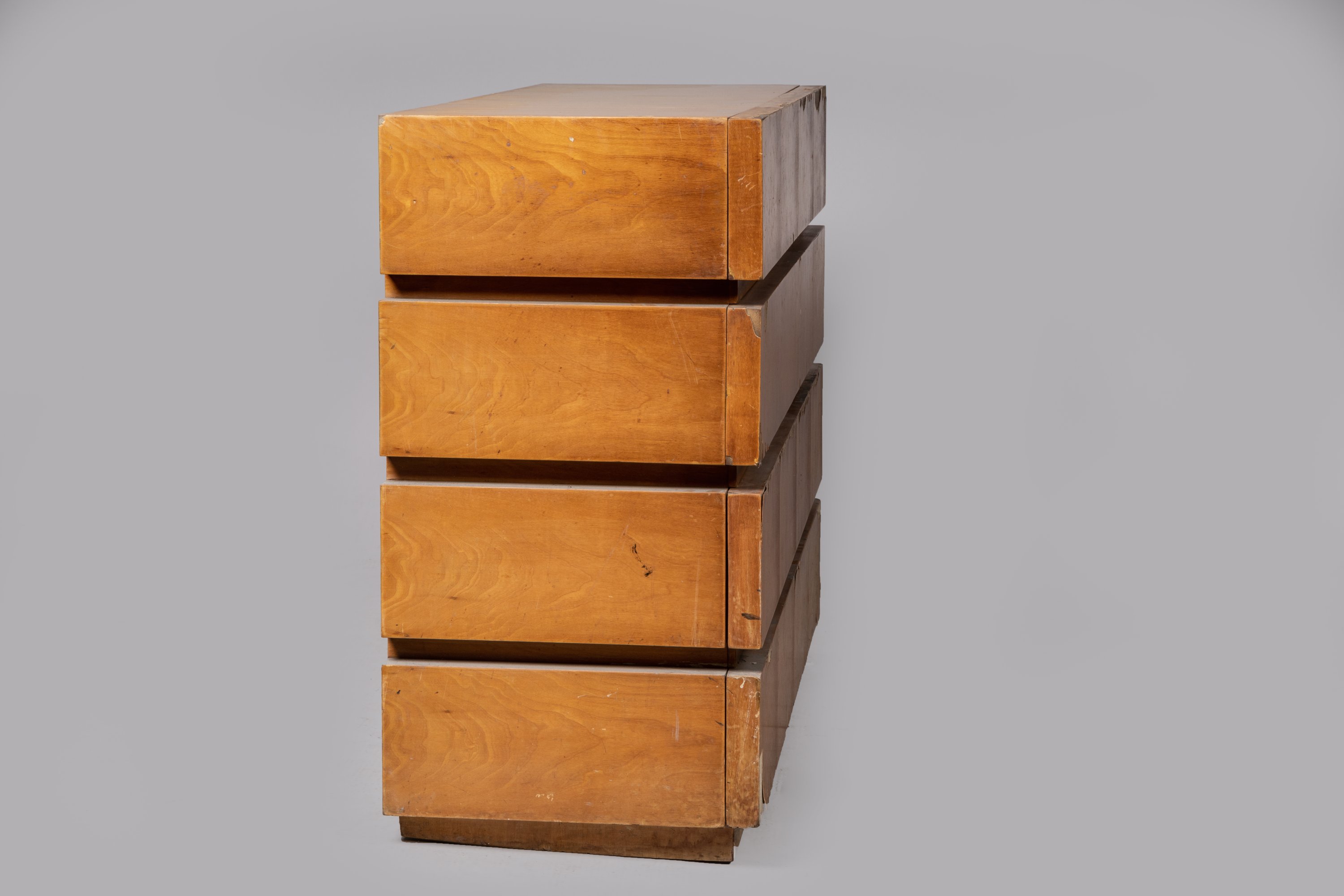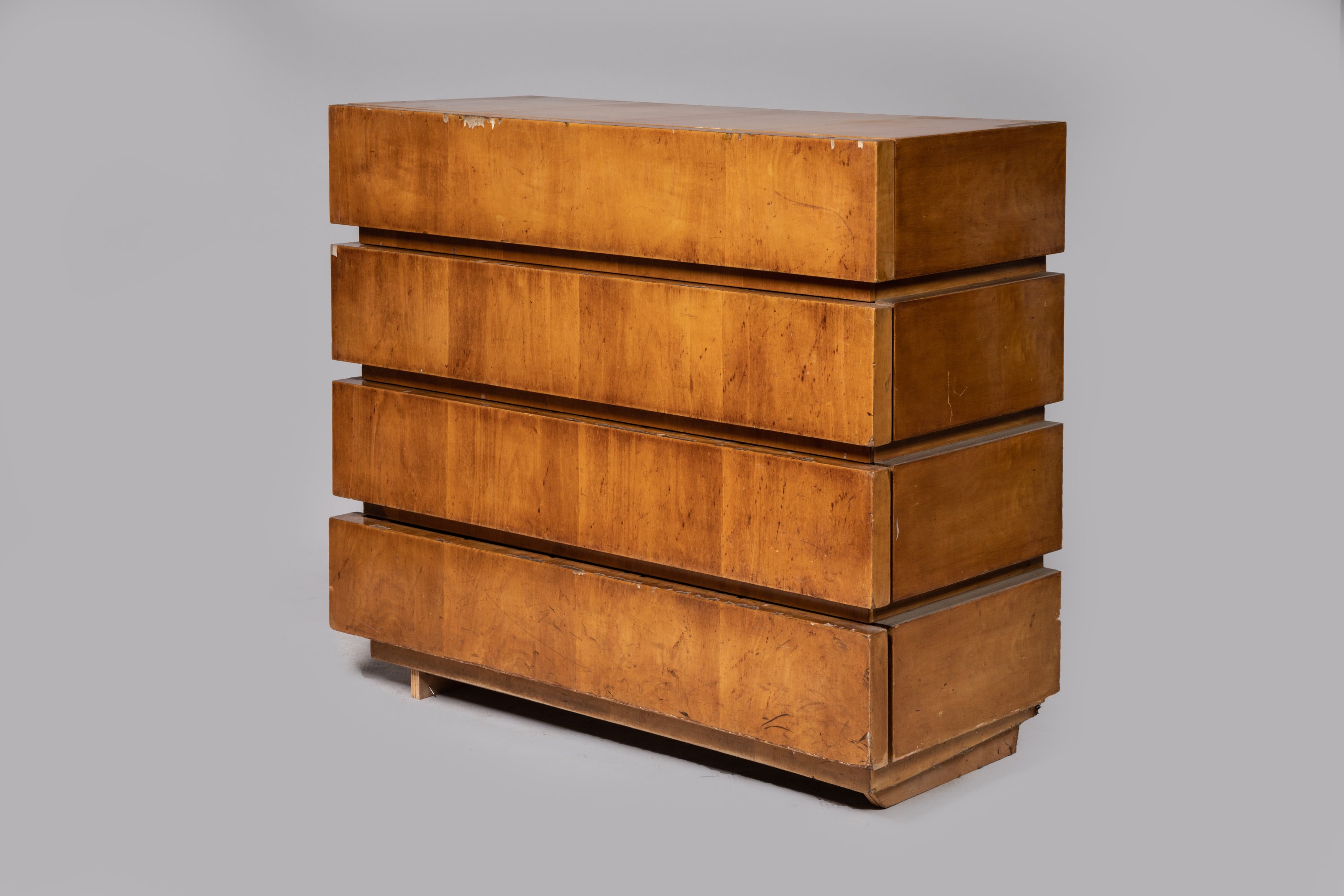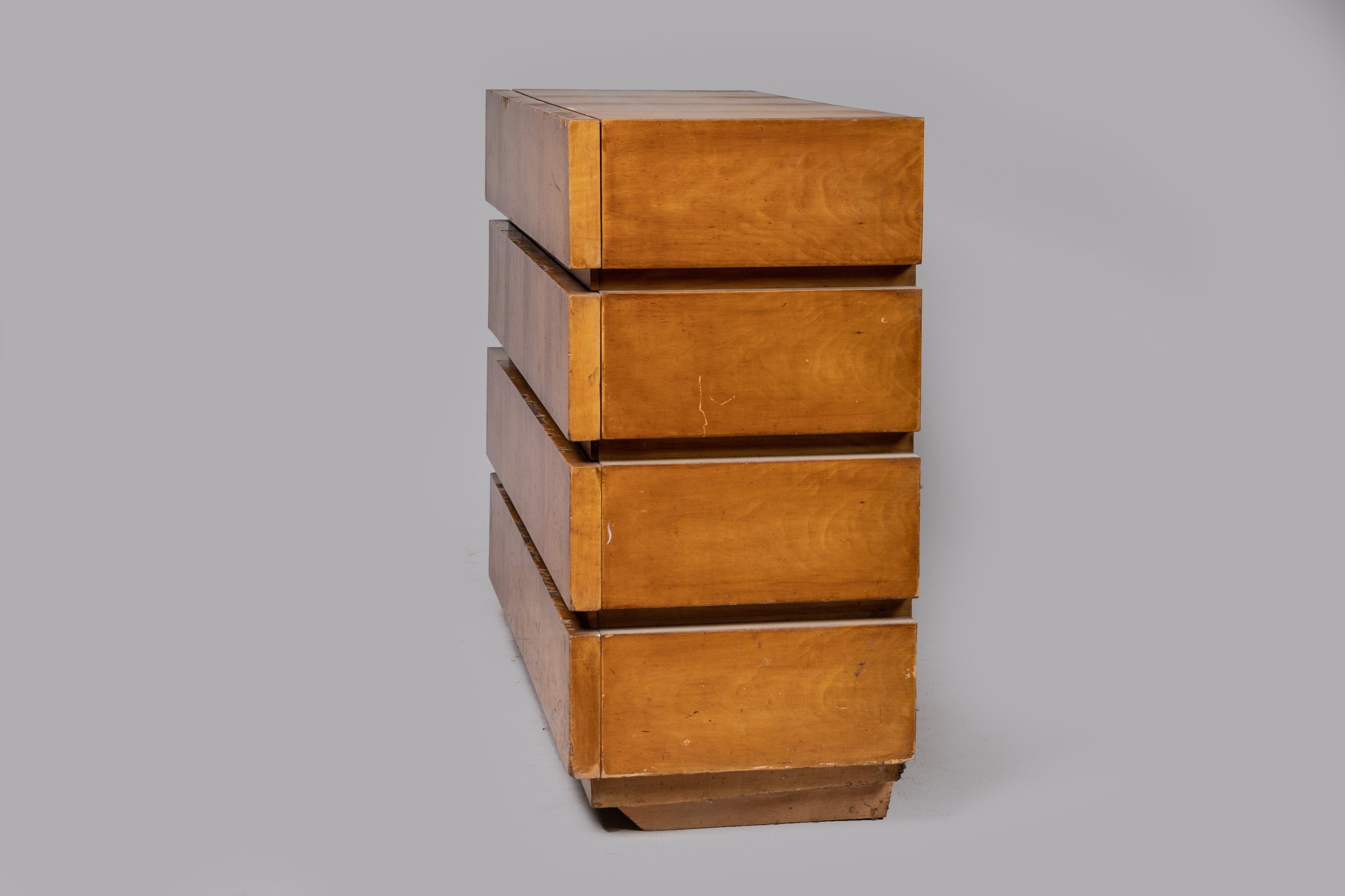 En placage de sycomore. De forme rectangulaire, la surface constituée de quatre bandes en relief sur la façade et un côté, dévoilant quatre tiroirs.