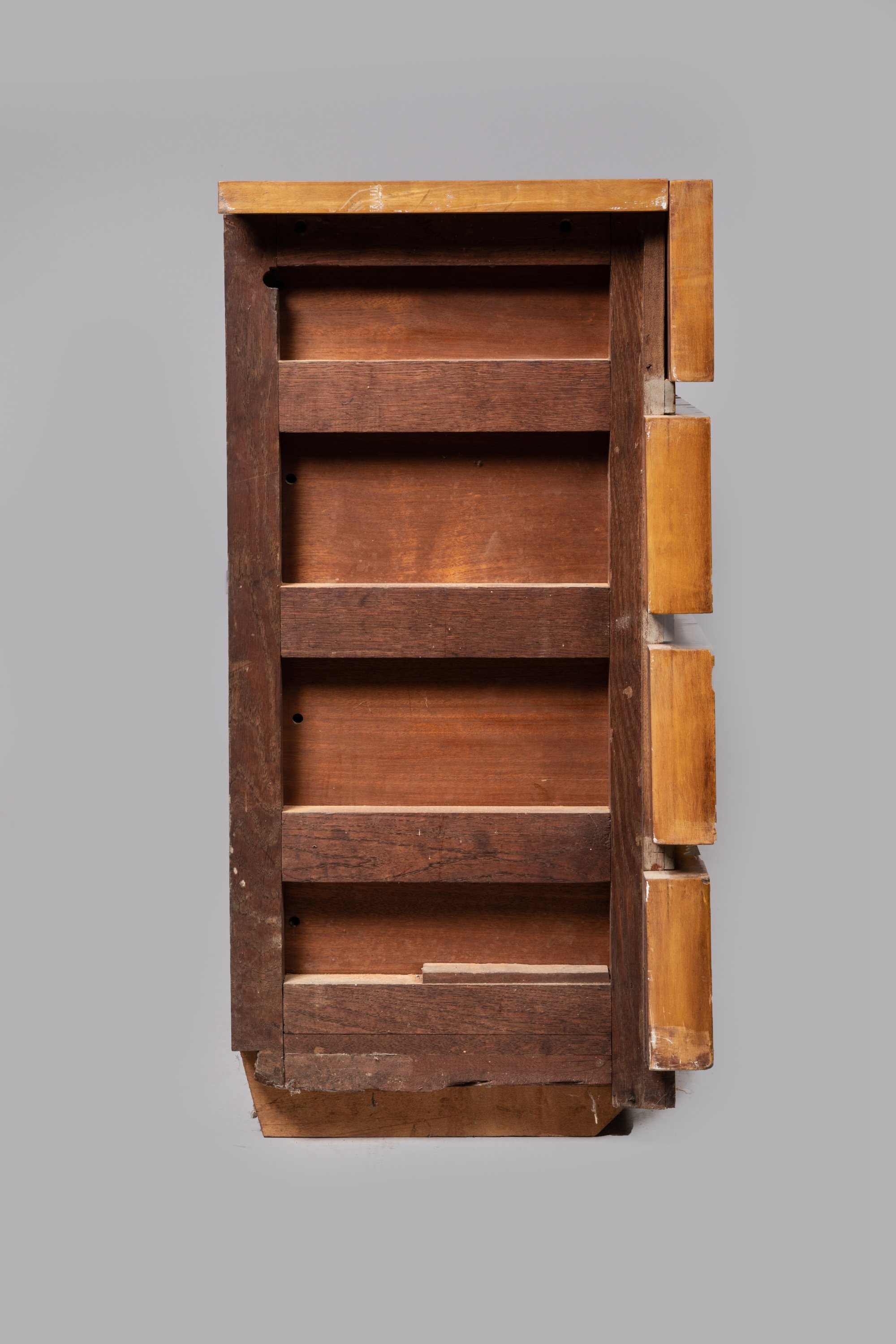 Dans cet appartement de lavenue Pierre Ier de Serbie, chaque meuble du décorateur apparaît à sa place, sur mesure, pour lentrée, le bureau, la chambre ou lun des deux salons. Imaginés avant-guerre, notre armoire et ces commodes étaient destinés à garnir la chambre du couple Bensaude. Le choix du sycomore, un érable géant, pour cette pièce intime est un aussi un symbole délévation spirituelle. Devenu veuf prématurément, le docteur Bensaude se remarie et déménage avenue Bugeaud à Paris. Sauvegardé pendant la guerre, lensemble est progressivement dispersé. On retrouve certains artefacts sur le marché, à linstar dune armoire présentée par la galerie Jacques Lacoste. Nos meubles ont été conservés, pour leur part, dans la descendance du docteur Bensaude.