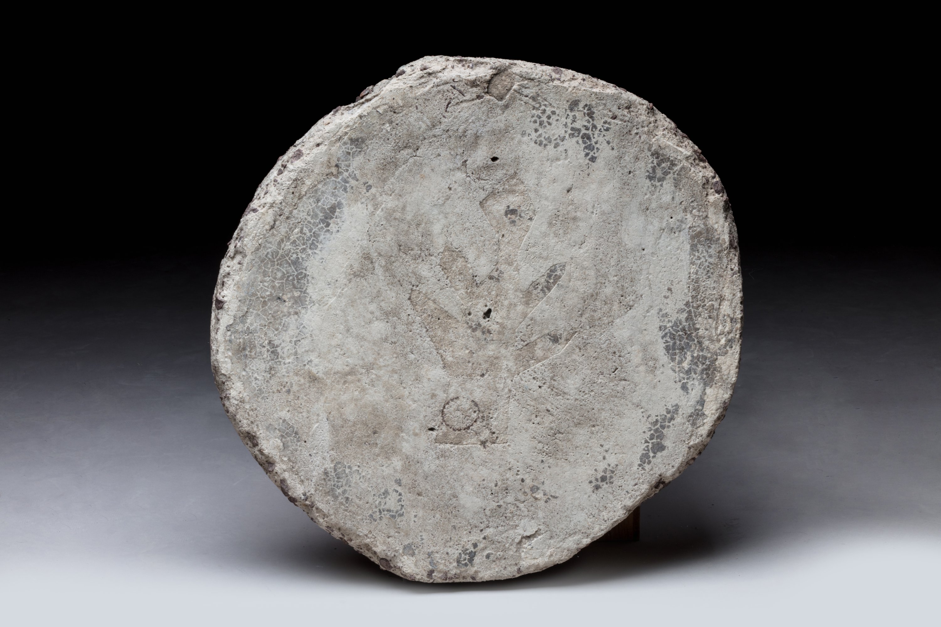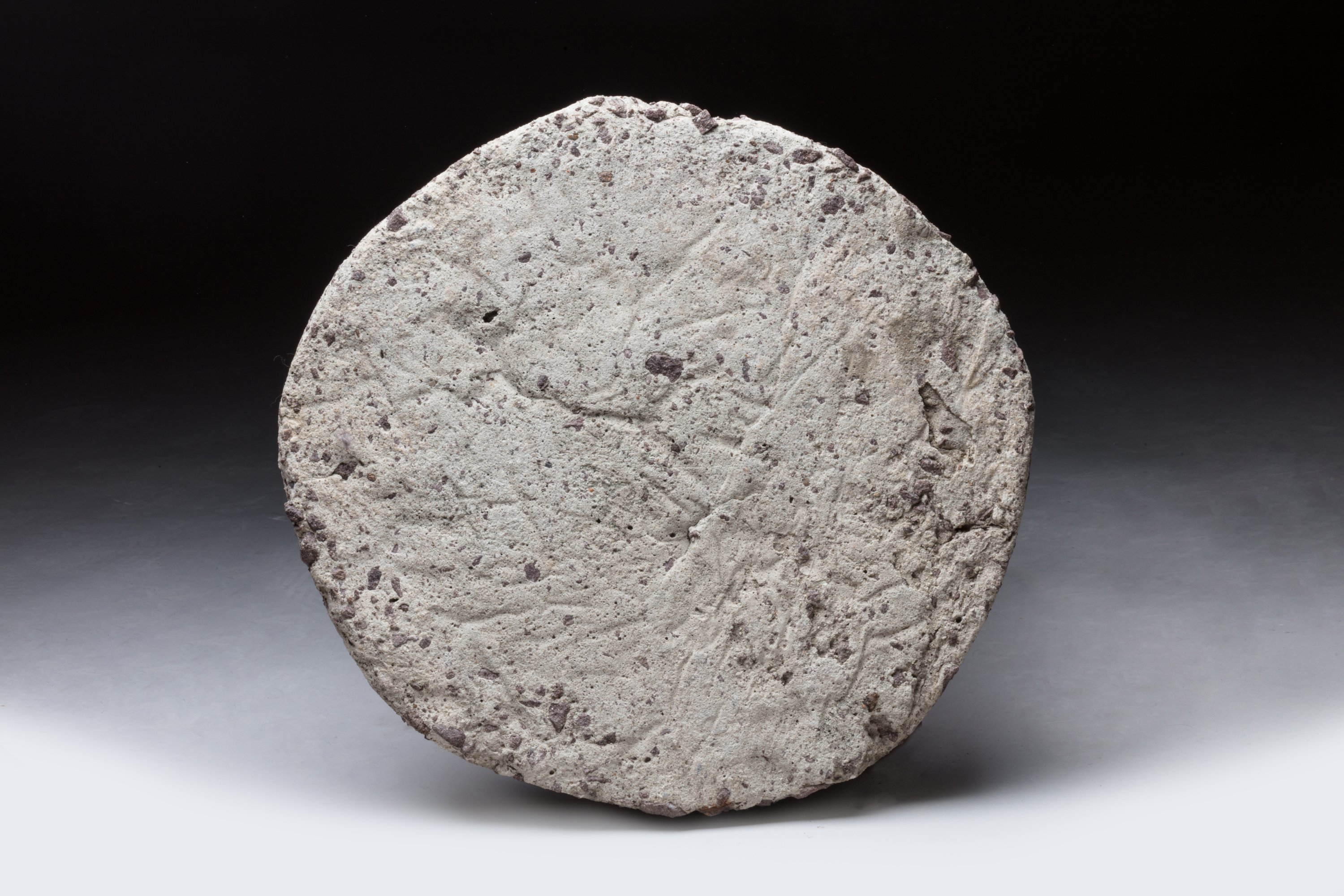 Pièce unique. Béton de forme libre brut, orné au centre d'une empreinte de feuille fossilisée.