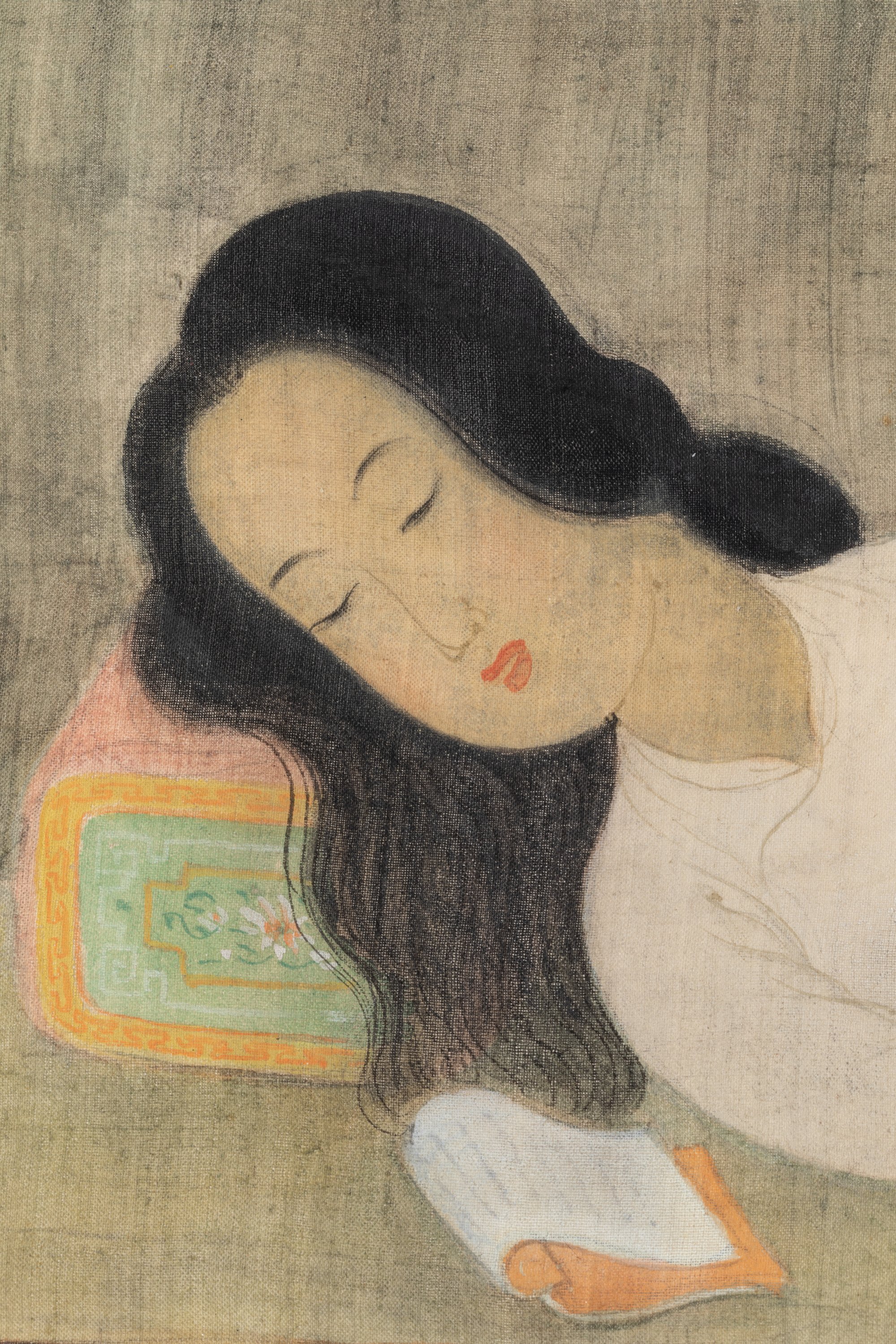 Réalisée dans cette année féconde de 1942 où Mai-Thu tout juste libéré s’engage dans une nouvelle aventure artistique, notre peinture sur soie représente une jeune femme vêtue d'une veste traditionnelle blanche, dite "ao dai", portée sur un pantalon noir. Les cheveux dénoués, elle est allongée sur un lit en bois sculpté et laqué rouge. Assoupie, elle tient un éventail alors qu'un livre retourné sur la page délaissée repose à ses côtés. Le peintre réalise ici la synthèse entre l'Orient et l'Occident, puisant son inspiration dans les Vénus européennes des 17e au 19e siècle, appliquée à la beauté retenue et idéalisée d'une jeune annamite. Le savant jeu de rideaux et de tentures de couleur à l'arrière plan conforte la mise en scène tout en laissant passer la douceur et les bruits de l'après-midi.