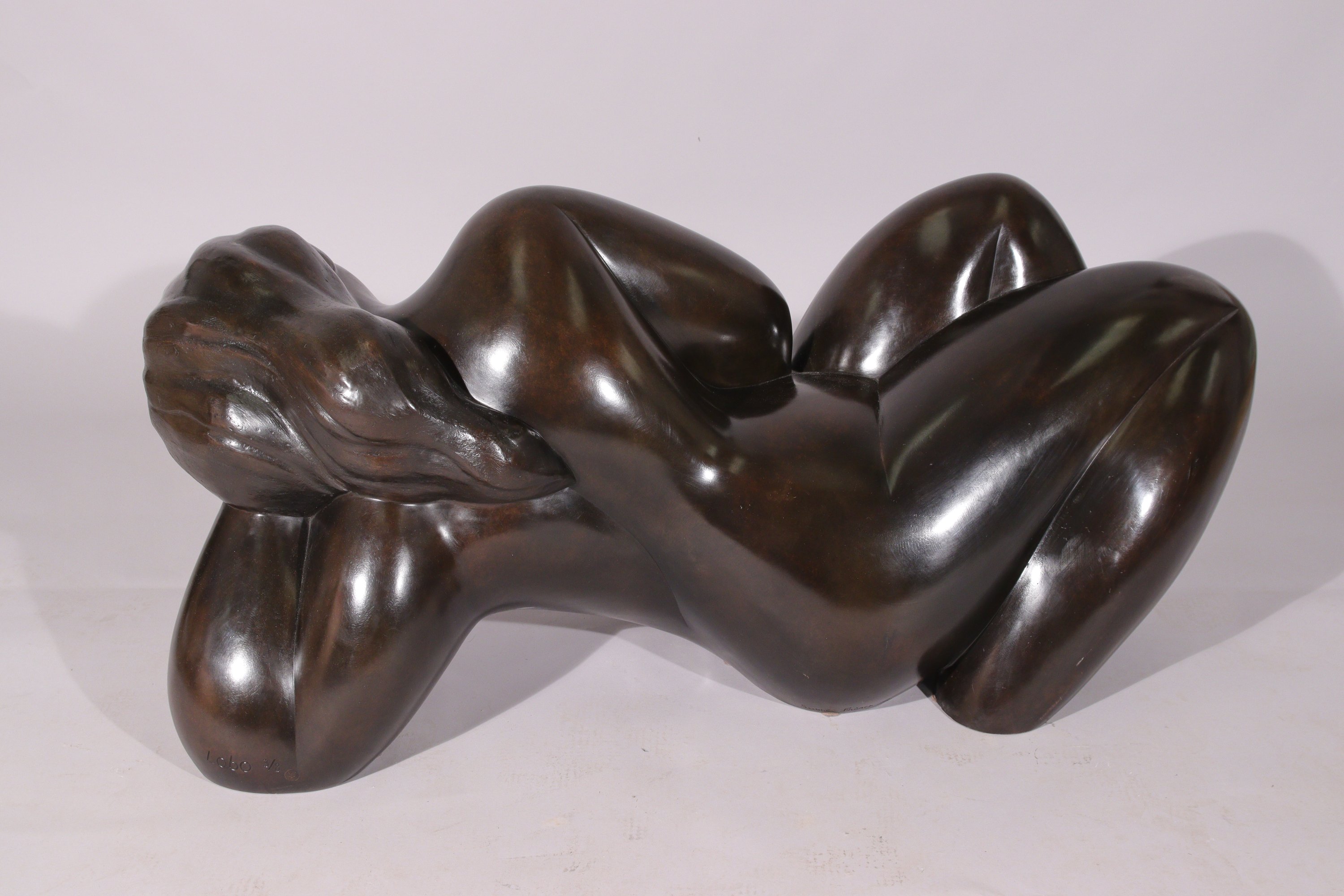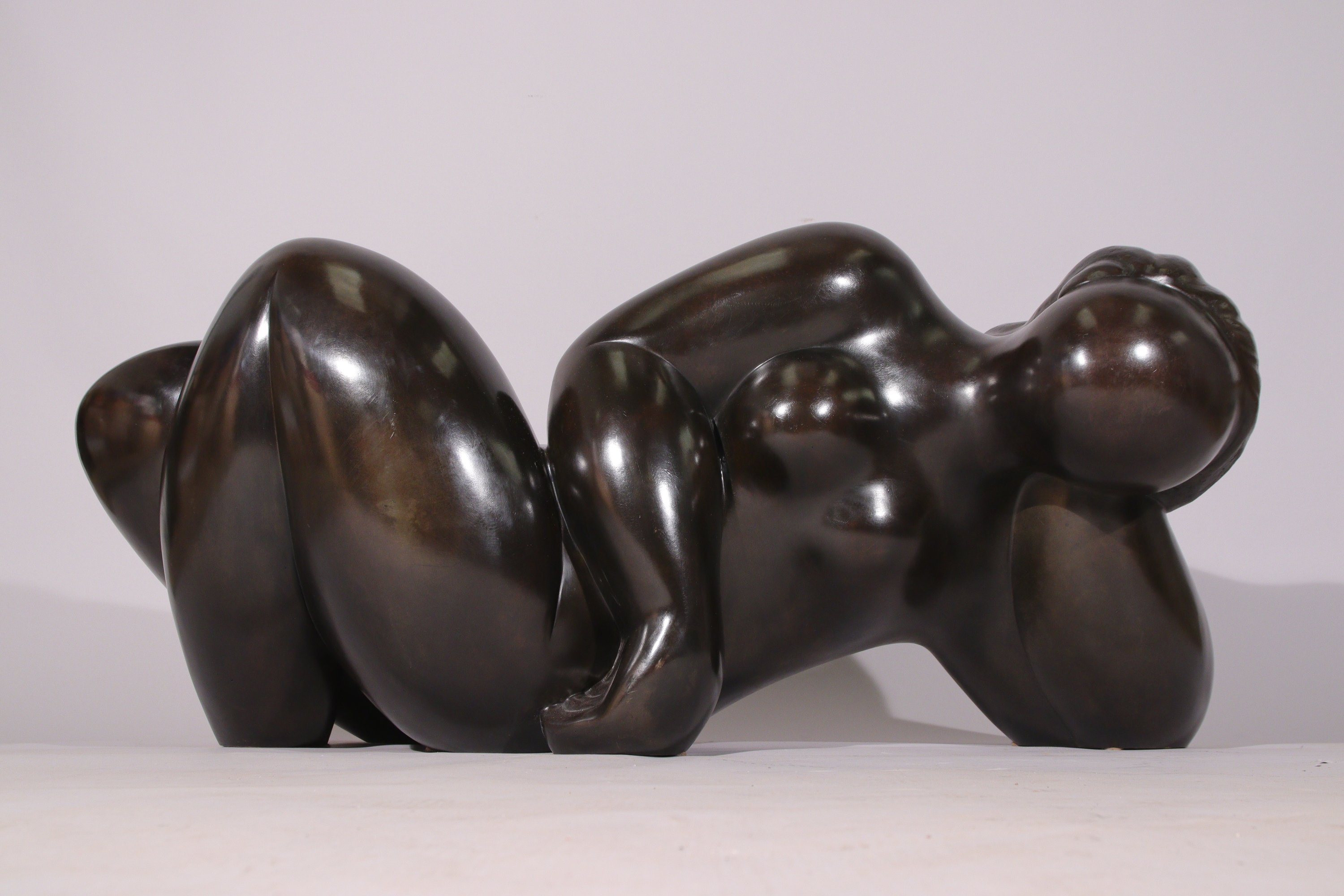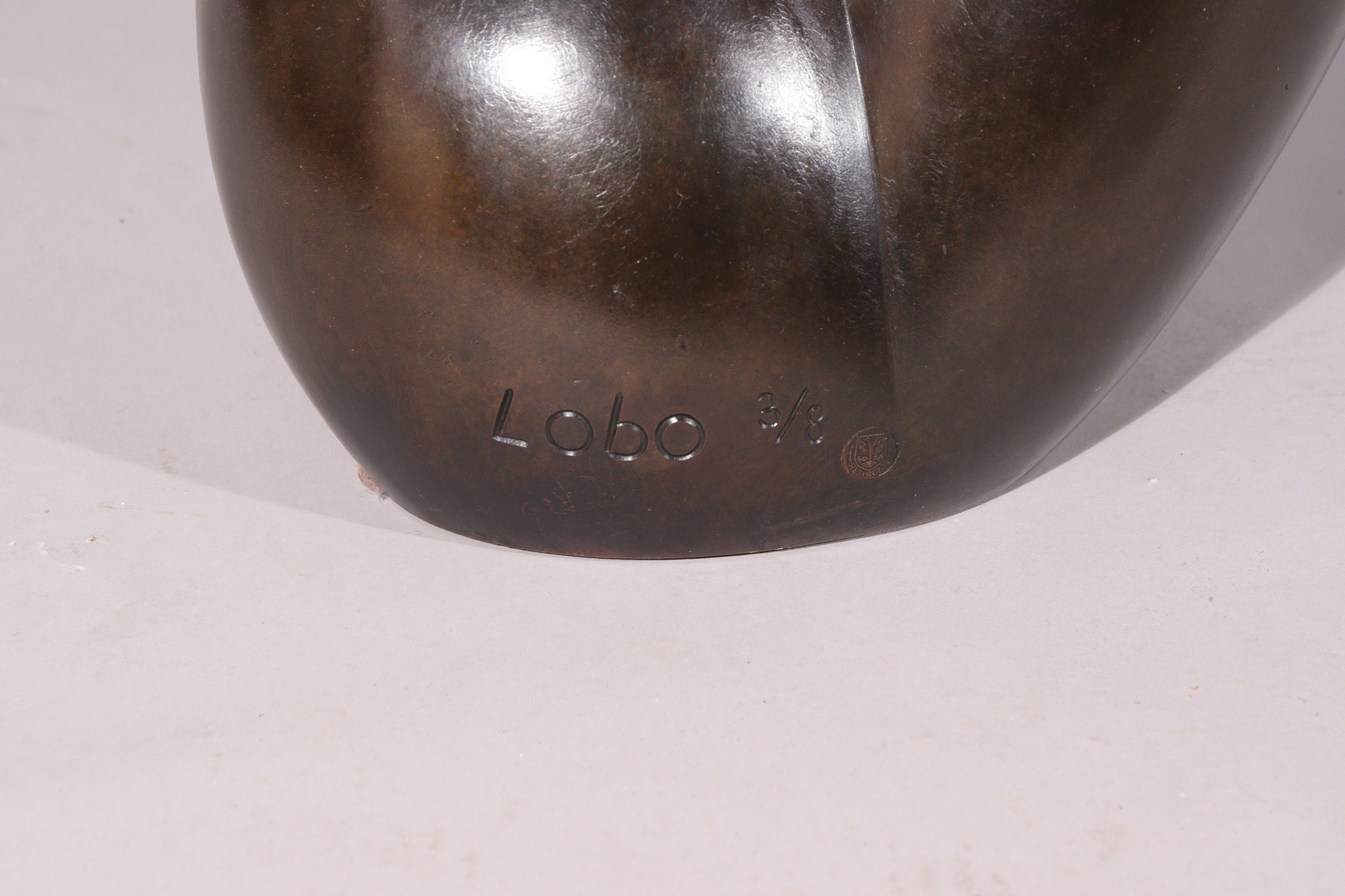 Notre version de « À la source » surprend par ses dimensions muséales. Le sujet se pare ici de tous ses attributs ; à lexception des pieds, le corps de la femme est traité dans son intégralité. Trois versions, de 36, 42 et 52 centimètres de long illustrent ce modèle en marbre et en bronze à partir de 1982. Notre version, remarquablement fondue par Susse à Paris, explore le thème grandeur nature. Aussi synthétiques et primitives que les sculptures dHenry Moore et aussi sensuelles que celles dAristide Maillol, Lobo réussit miraculeusement à préserver la beauté de la femme de sa déchirante modernité.