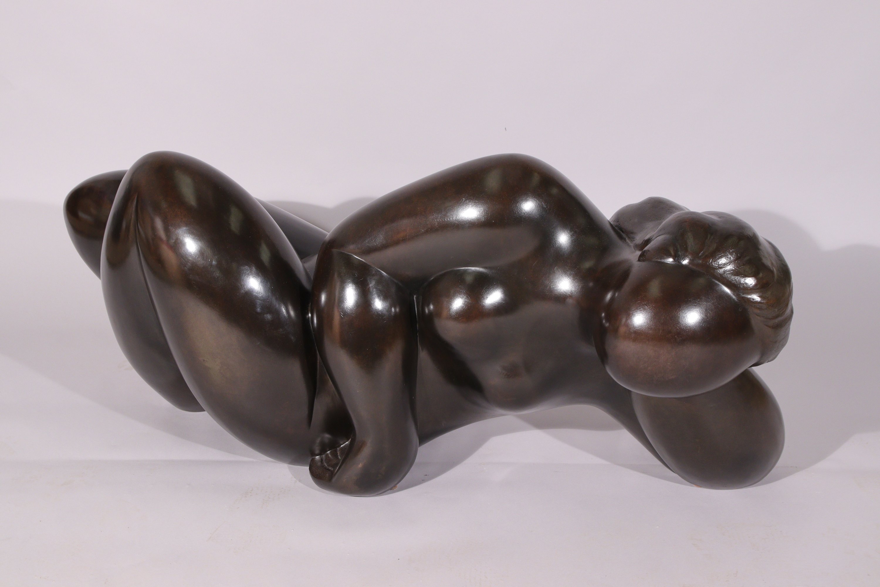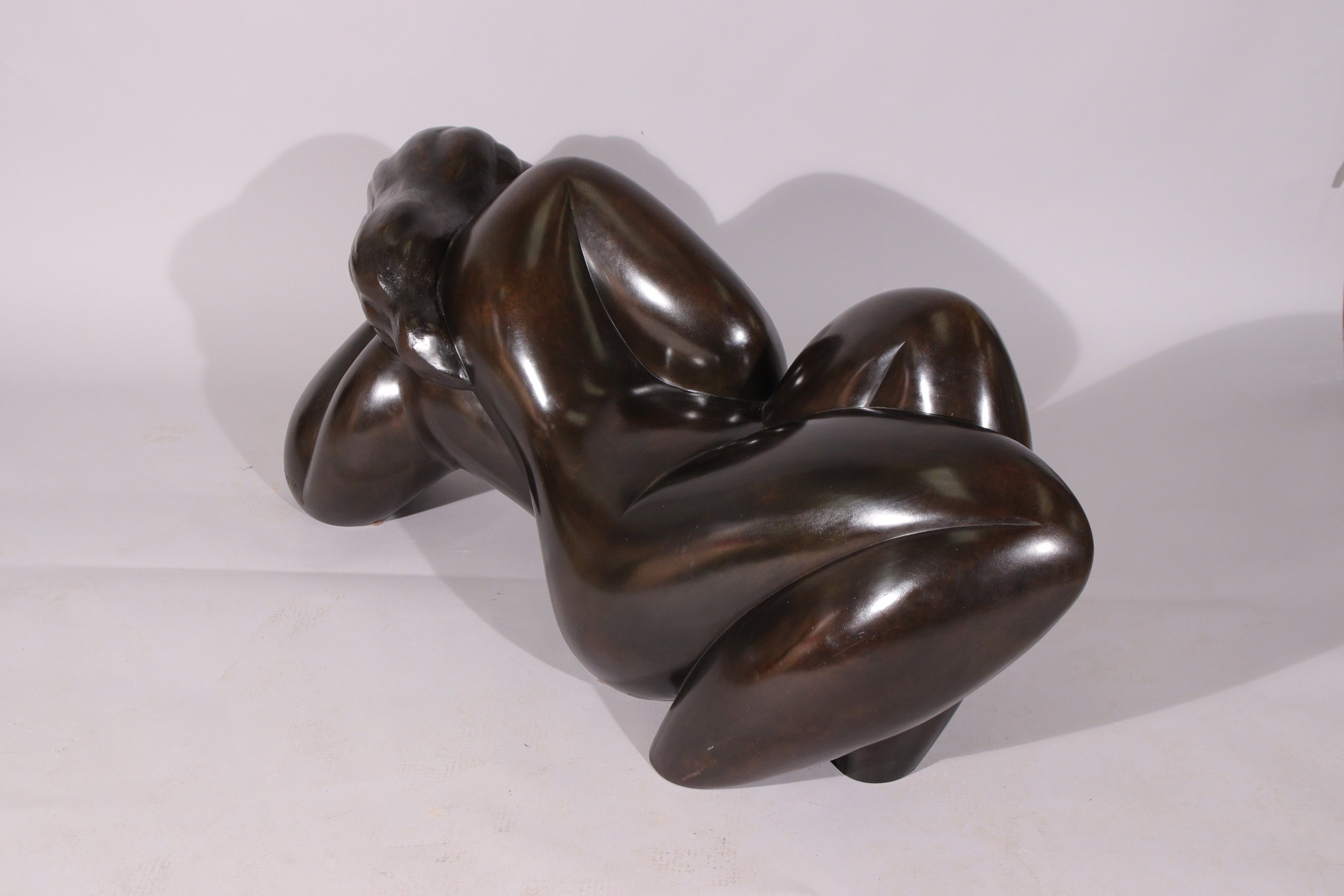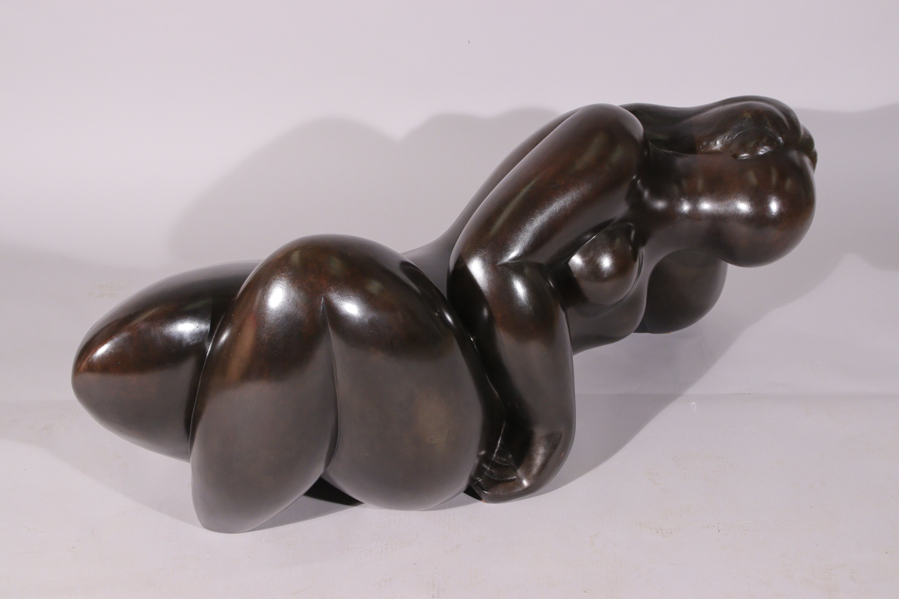 Notre version de « À la source » surprend par ses dimensions muséales. Le sujet se pare ici de tous ses attributs ; à lexception des pieds, le corps de la femme est traité dans son intégralité. Trois versions, de 36, 42 et 52 centimètres de long illustrent ce modèle en marbre et en bronze à partir de 1982. Notre version, remarquablement fondue par Susse à Paris, explore le thème grandeur nature. Aussi synthétiques et primitives que les sculptures dHenry Moore et aussi sensuelles que celles dAristide Maillol, Lobo réussit miraculeusement à préserver la beauté de la femme de sa déchirante modernité.