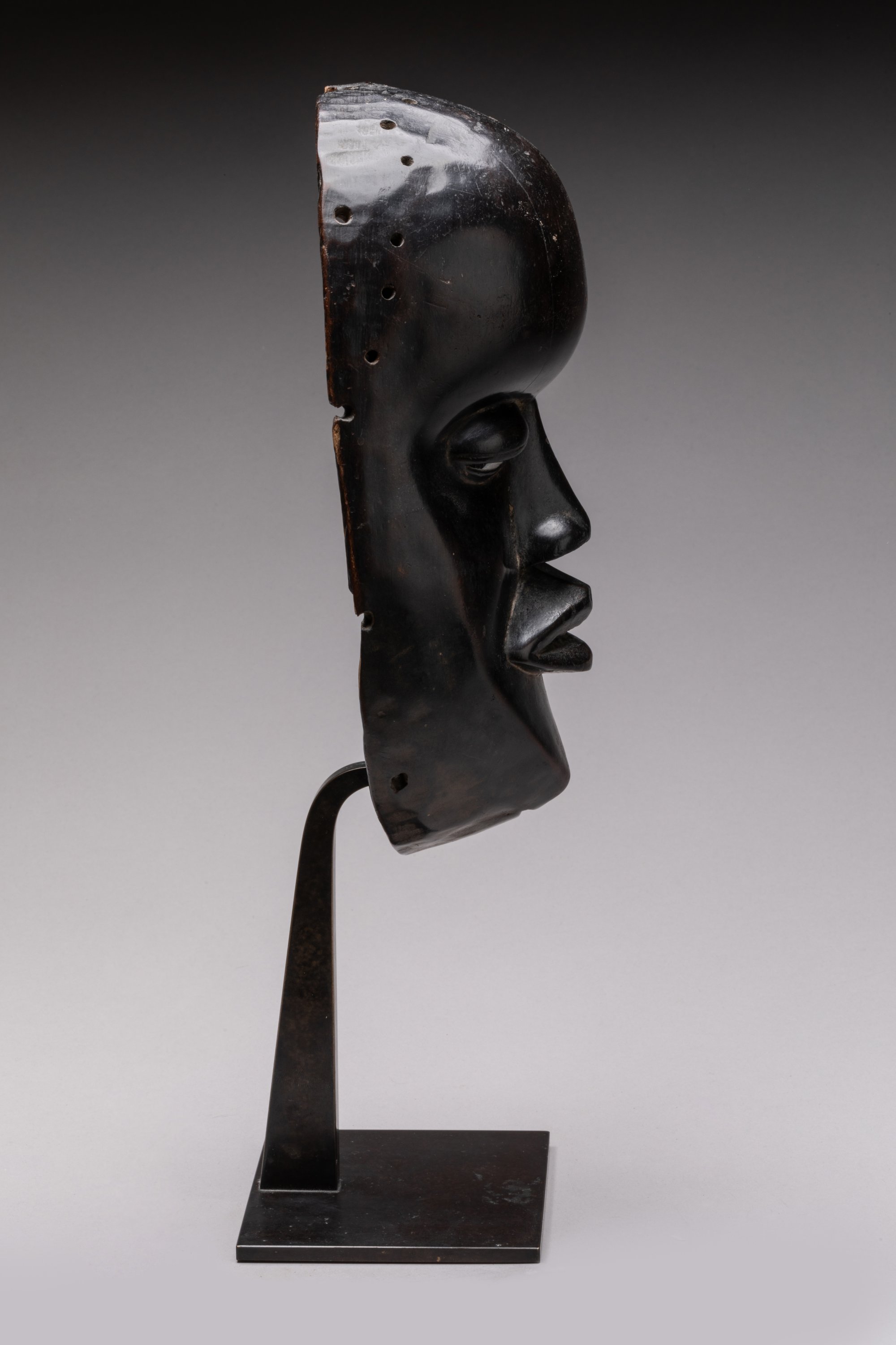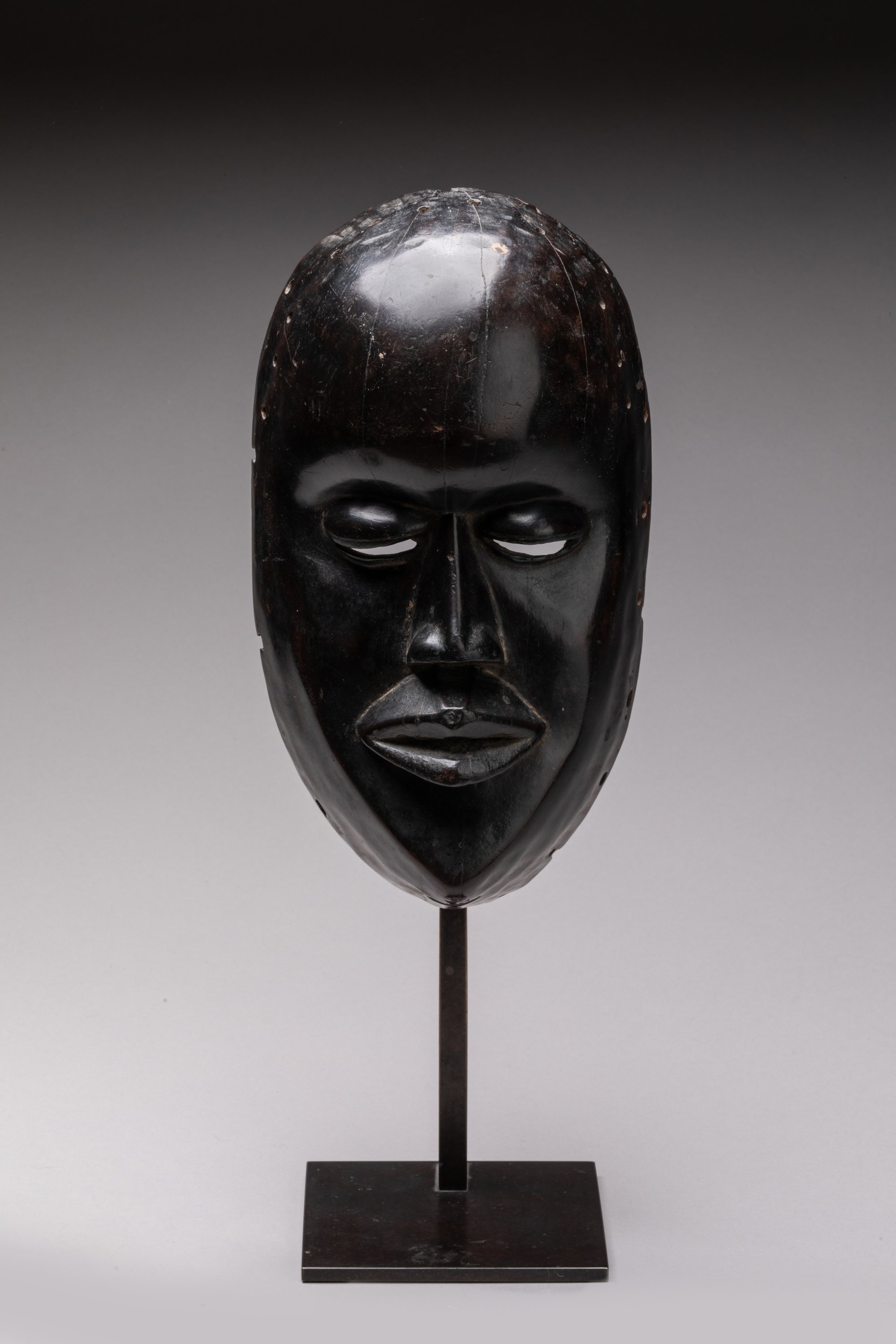 Beau masque au visage ovale, les yeux fendus en amande, la bouche entrouverte, les lèvres bien dessinées, le tout surmonté d'un front bombé, le rebord du masque percé de trous de fixation, belle patine ancienne intérieure et extérieure laquée noire.