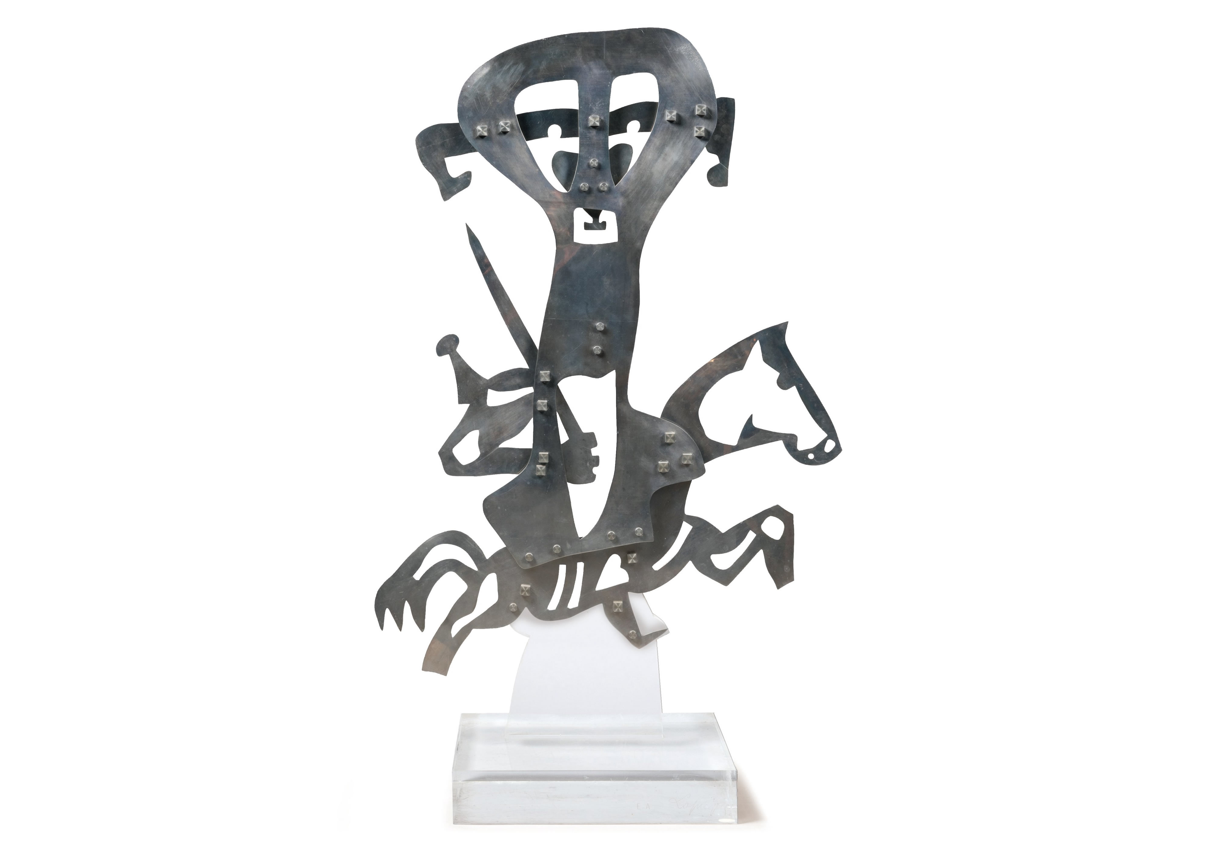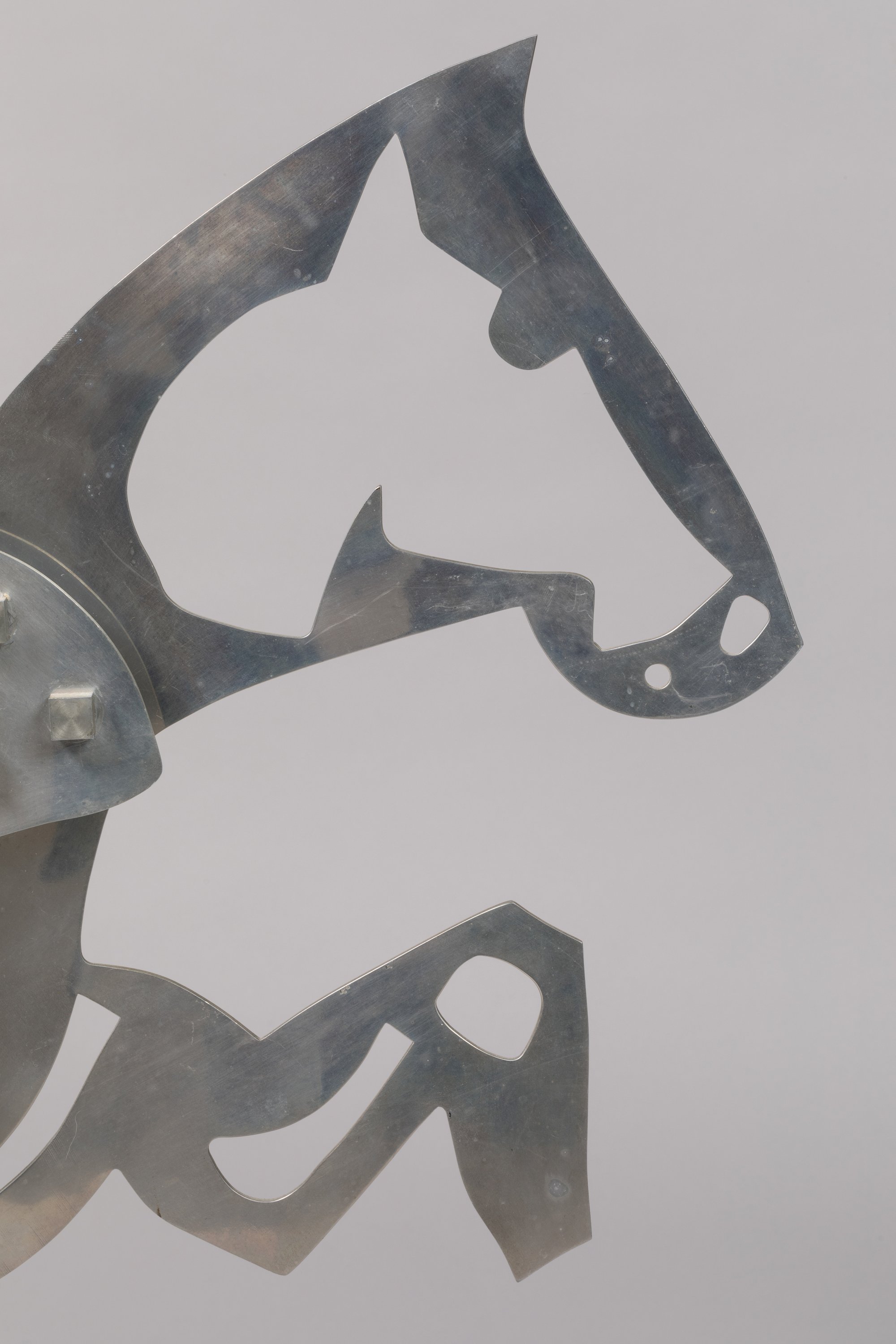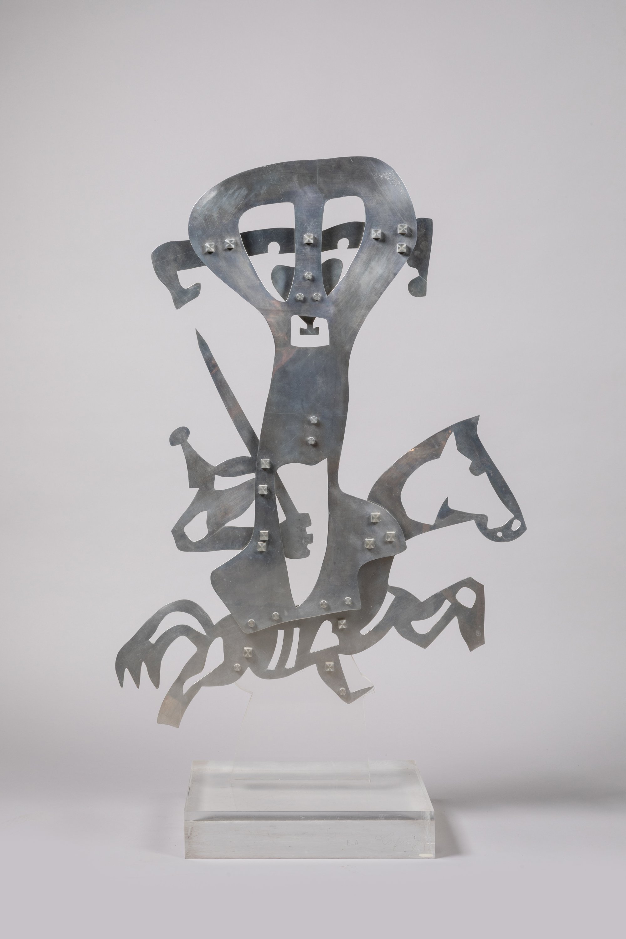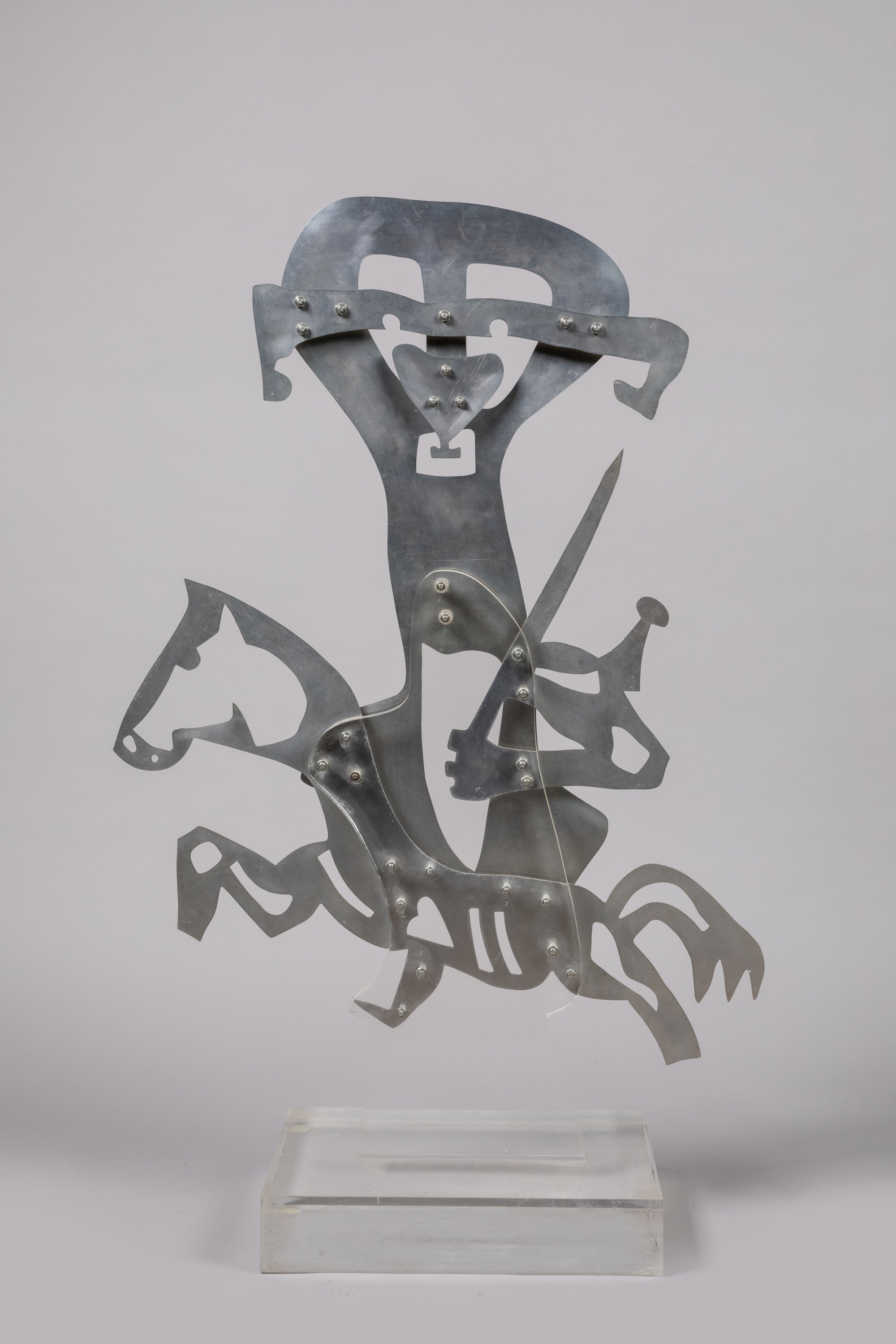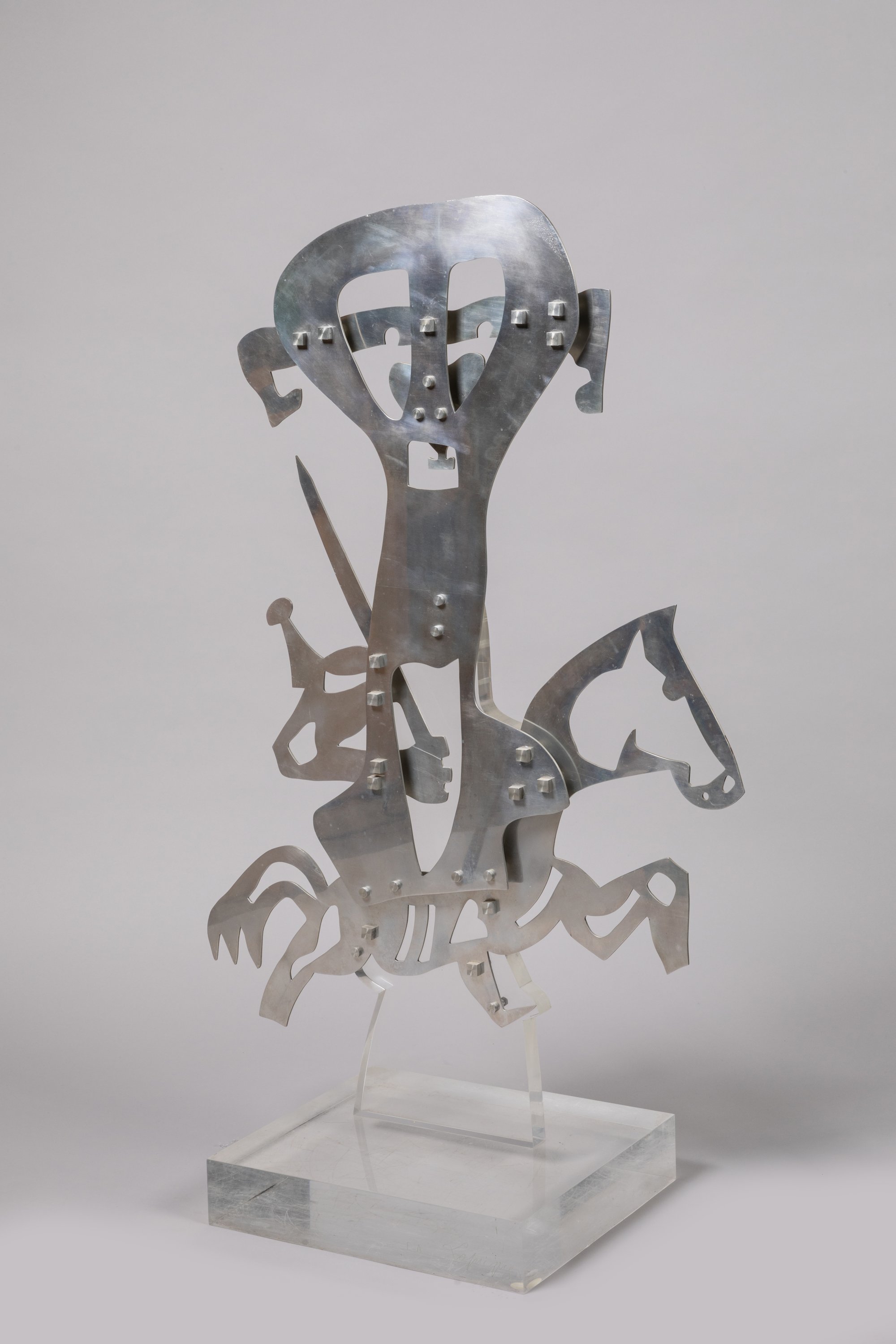 Métal poli découpé et assemblé reposant sur un socle en plexiglas.
