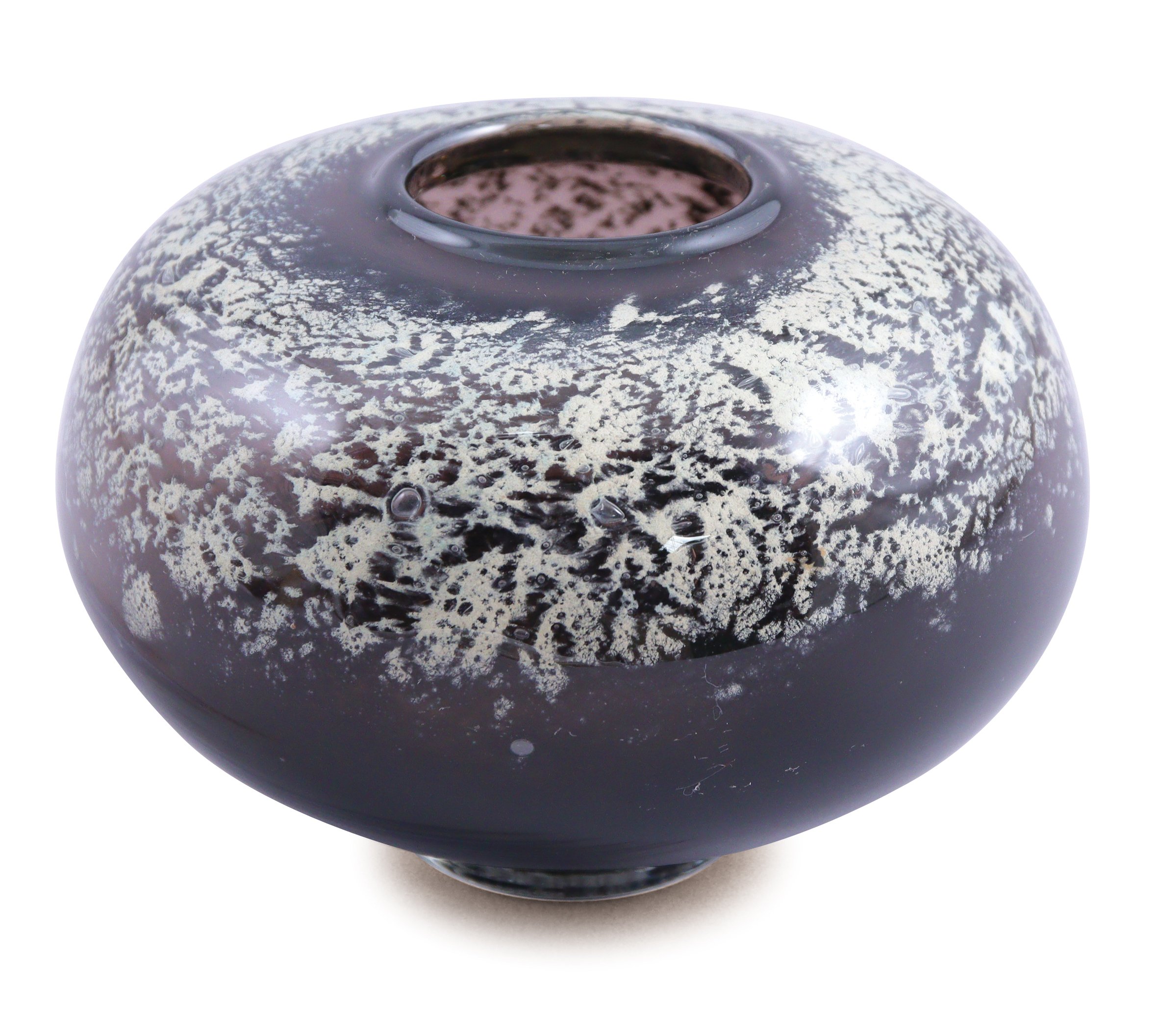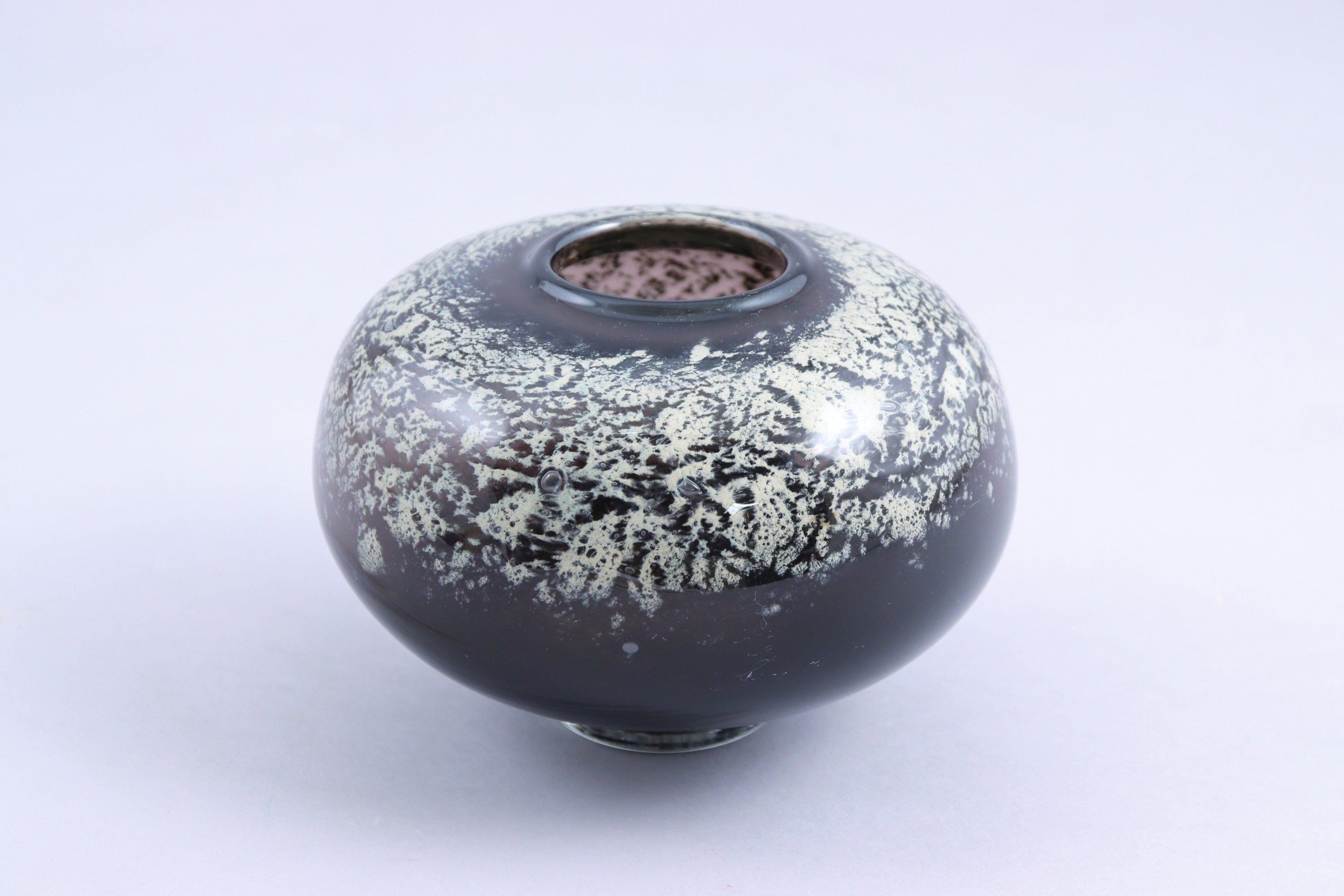 Verre de forme aplatie à fond noir avec décor tigré blanc et vert.