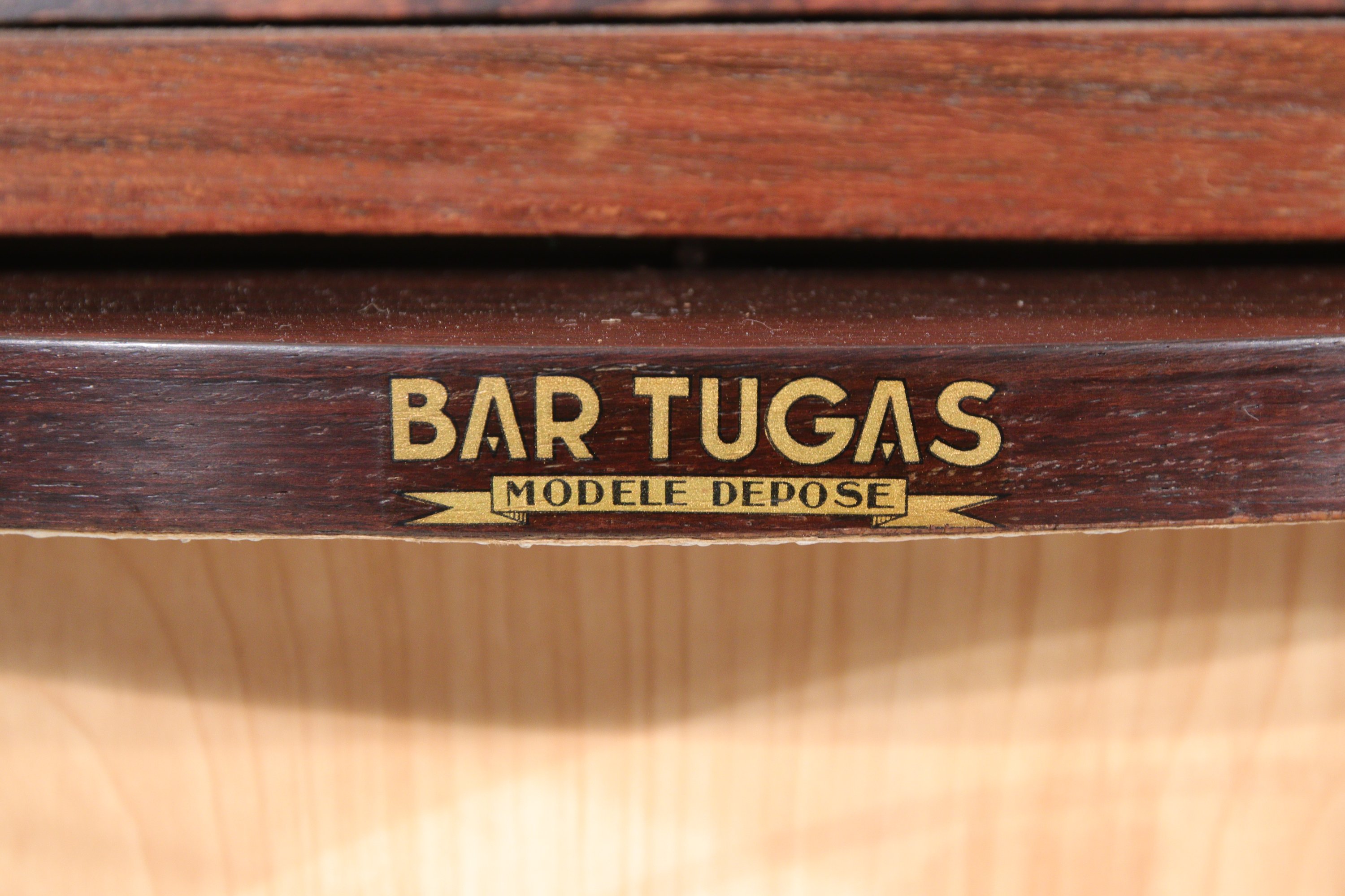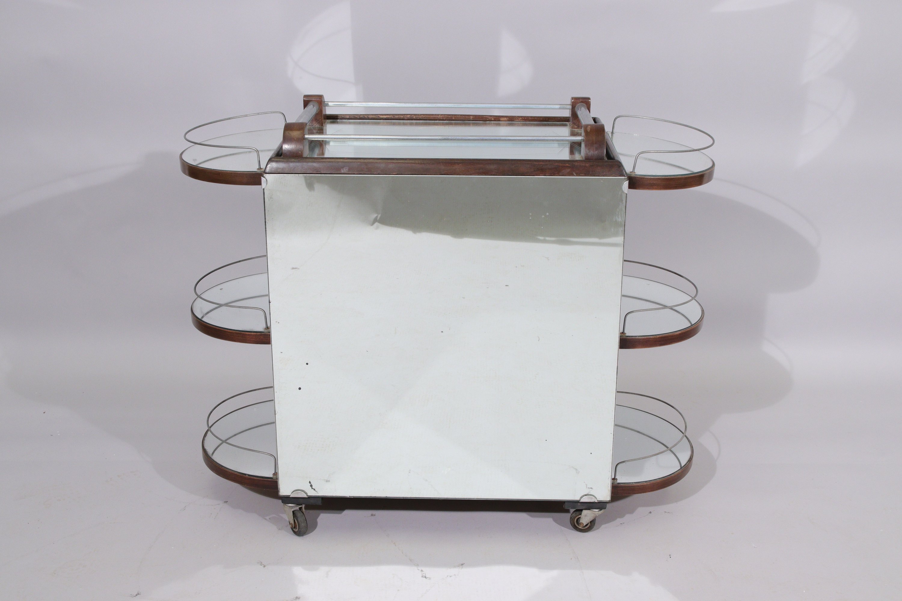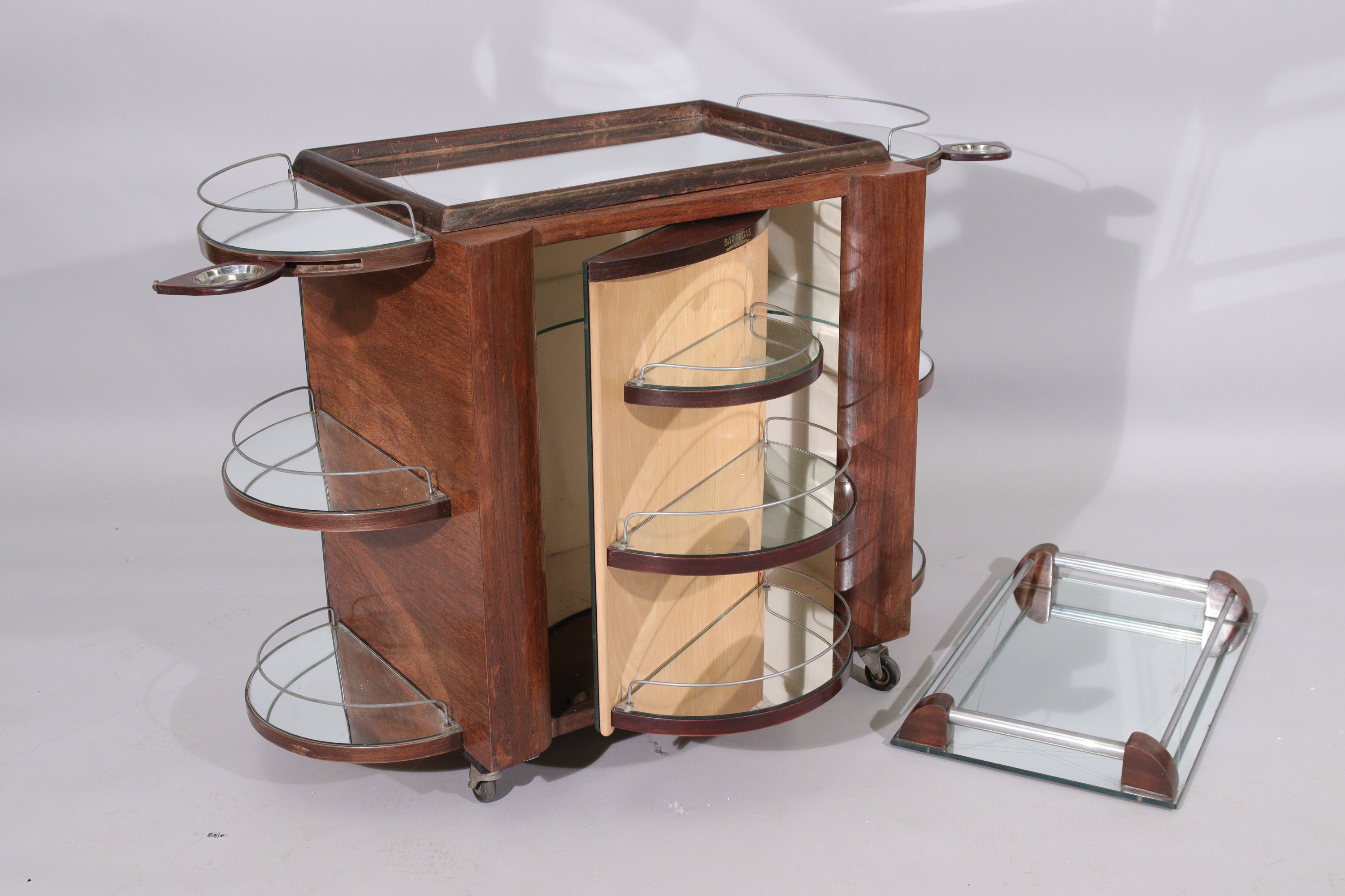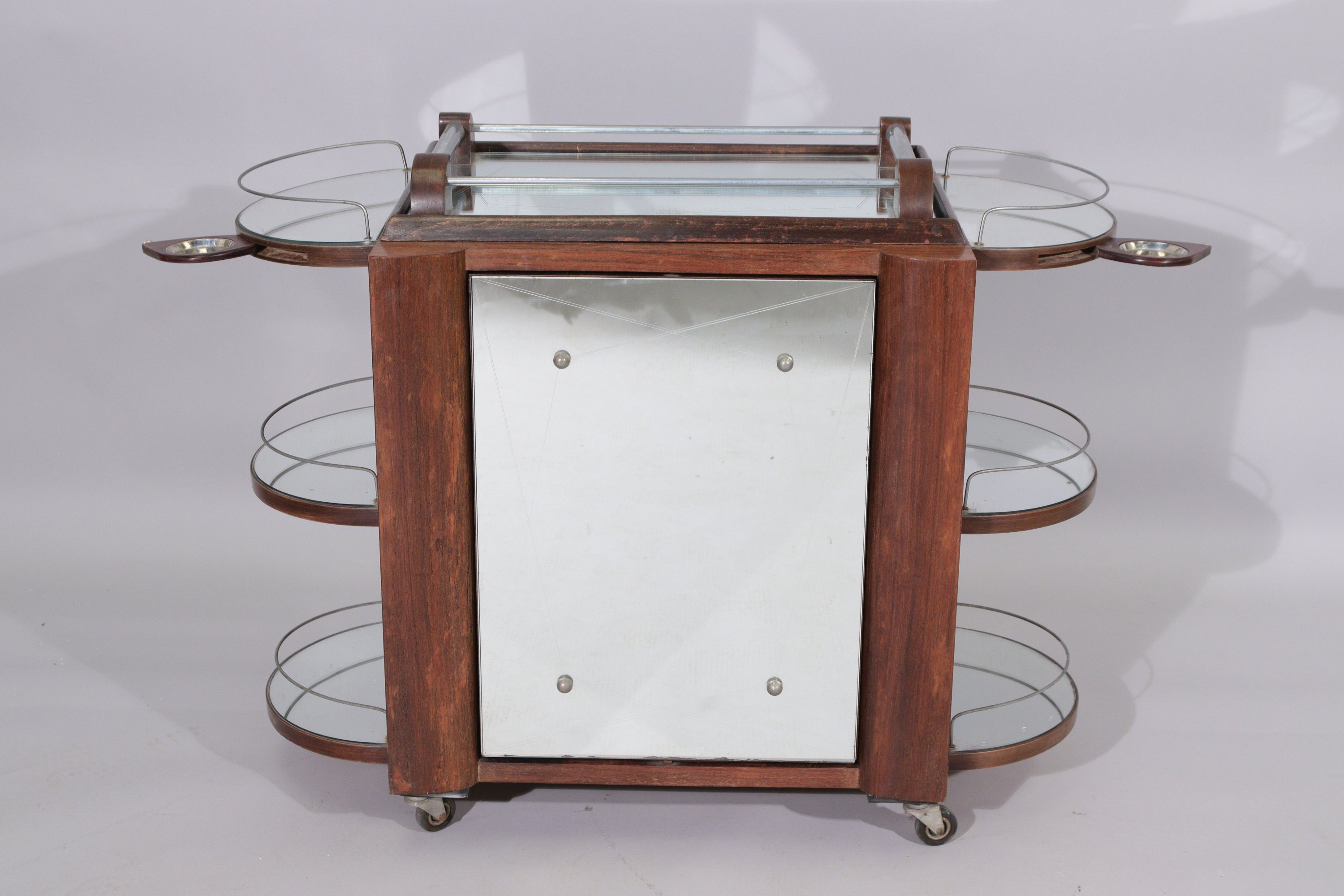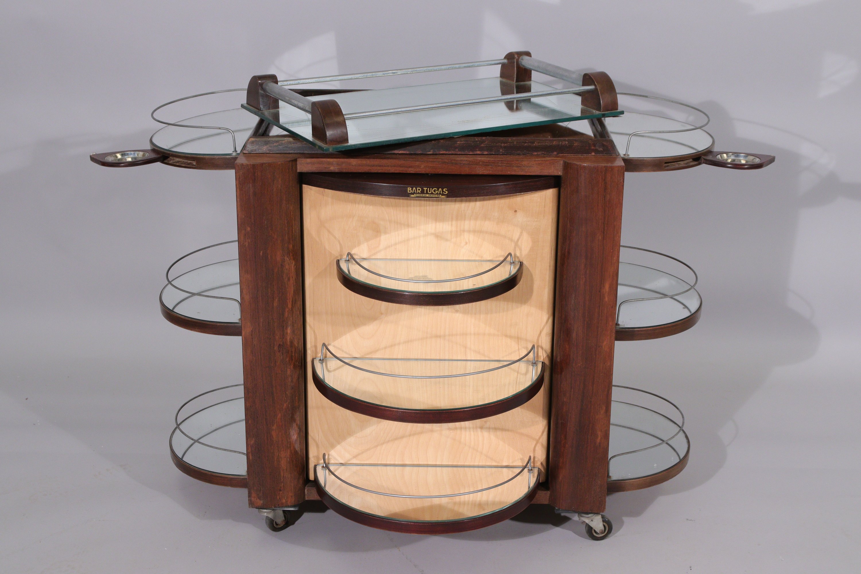 Bois de placage, miroirs et tubes métalliques sur roulettes. Avec trois tablettes de service de chaque côté, le meuble ouvrant par une porte miroitée dévoilant trois étagères. Signé à l'intérieur "Bar Tugas, modèle déposé". Cendriers amovibles.