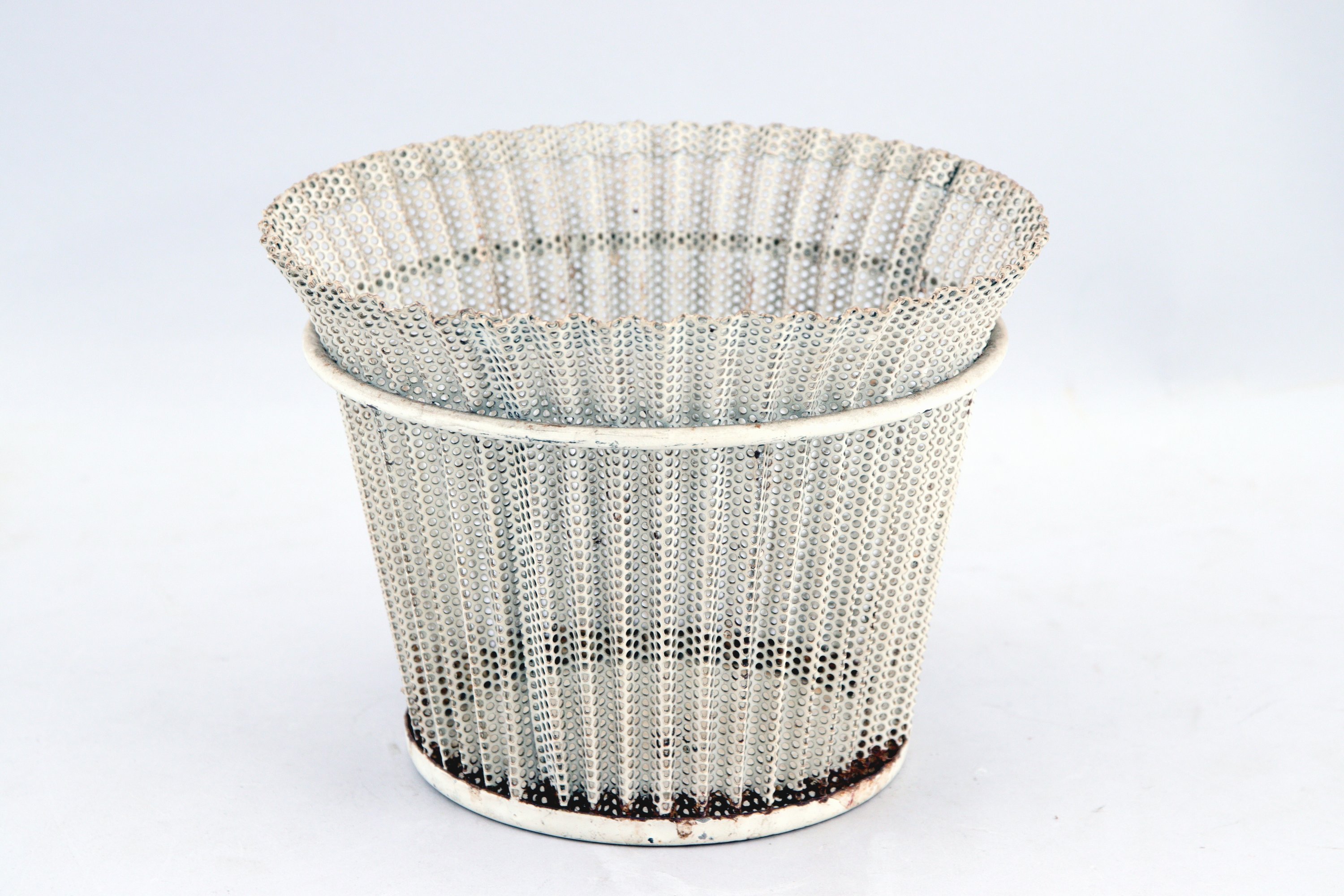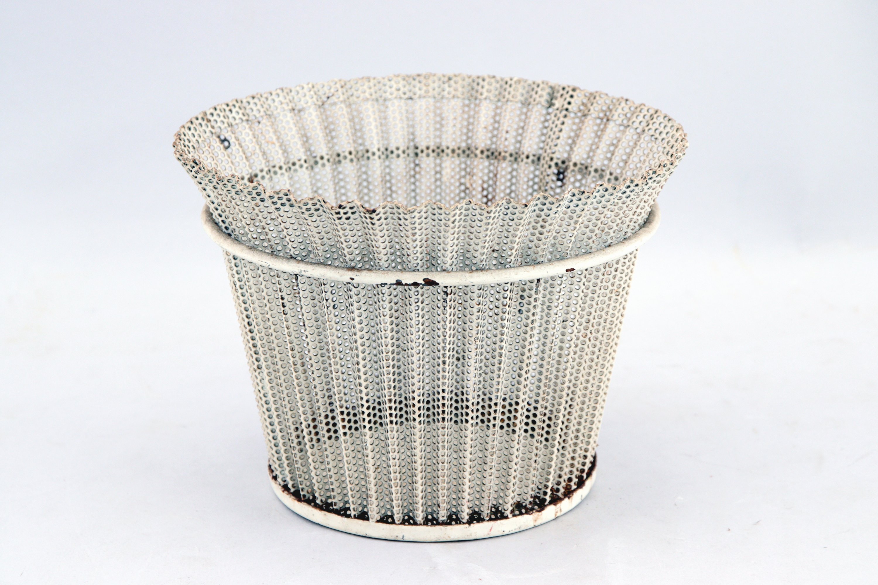 Rigitule laqué blanc d’origine, tôle perforée plissée, un anneau de maintien et fond en tôle laquée blanche d’origine.