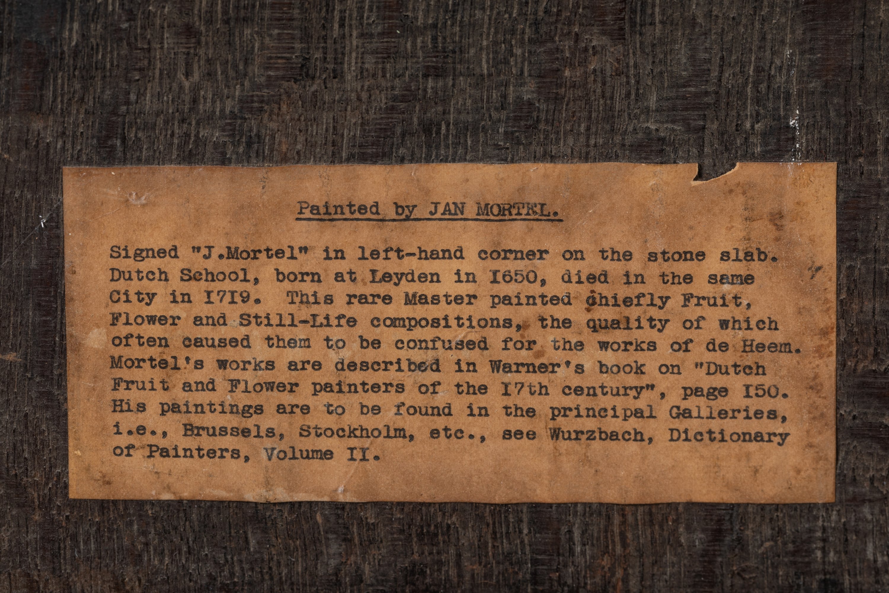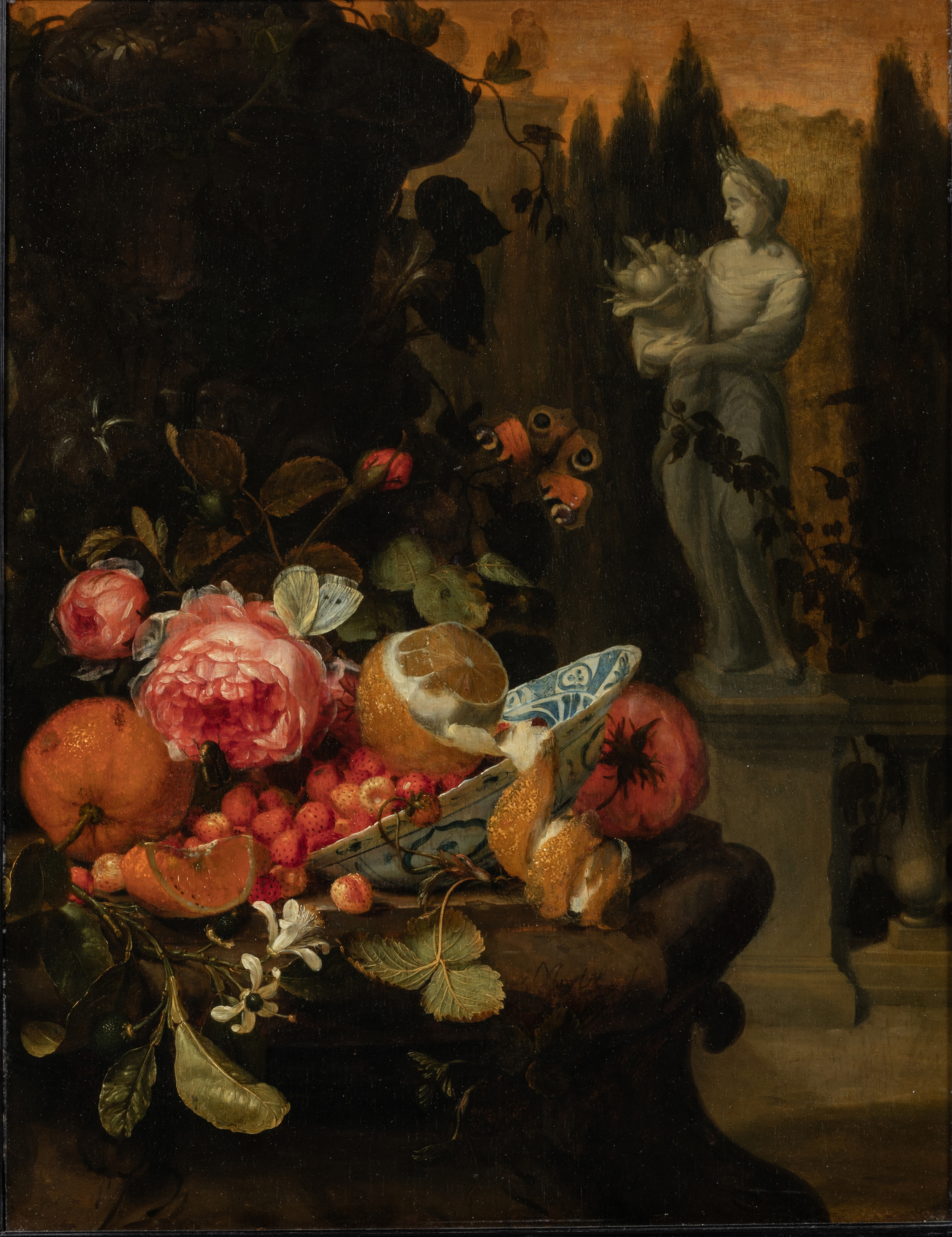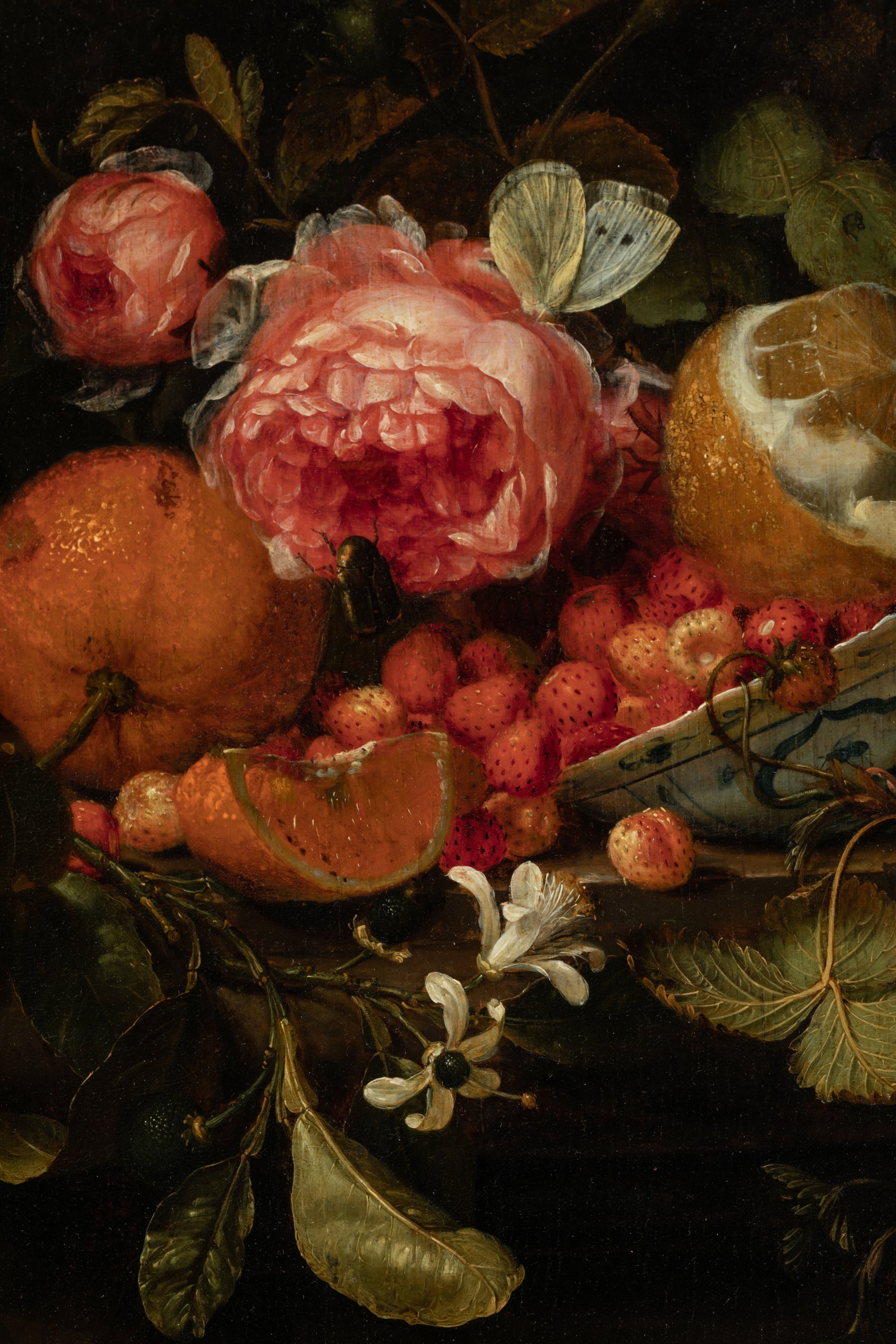 A still life by Jan Mortel depicting roses, raspberries, orange, lemon and pomegranate. Panel painting. Signed "Mortel fec."