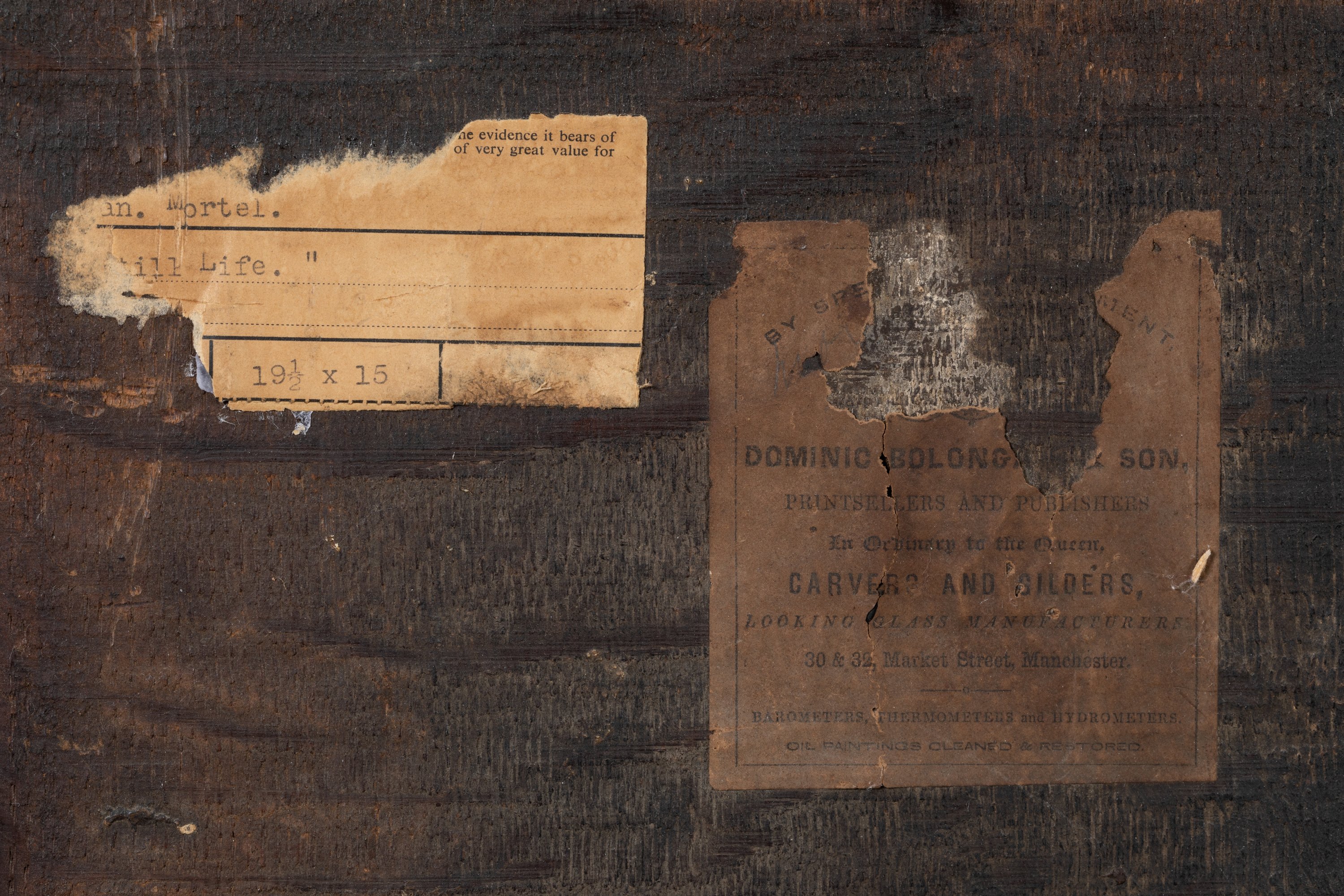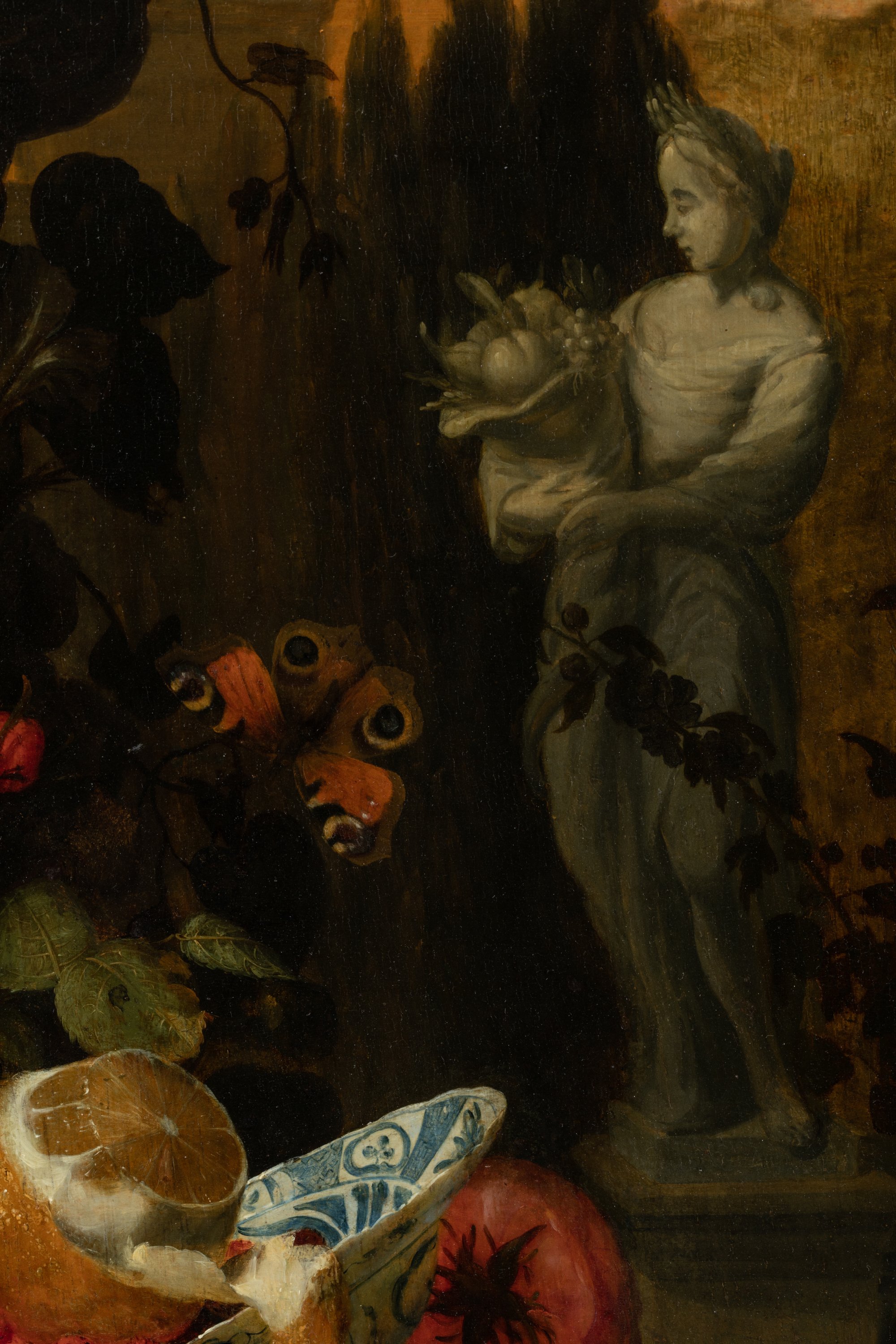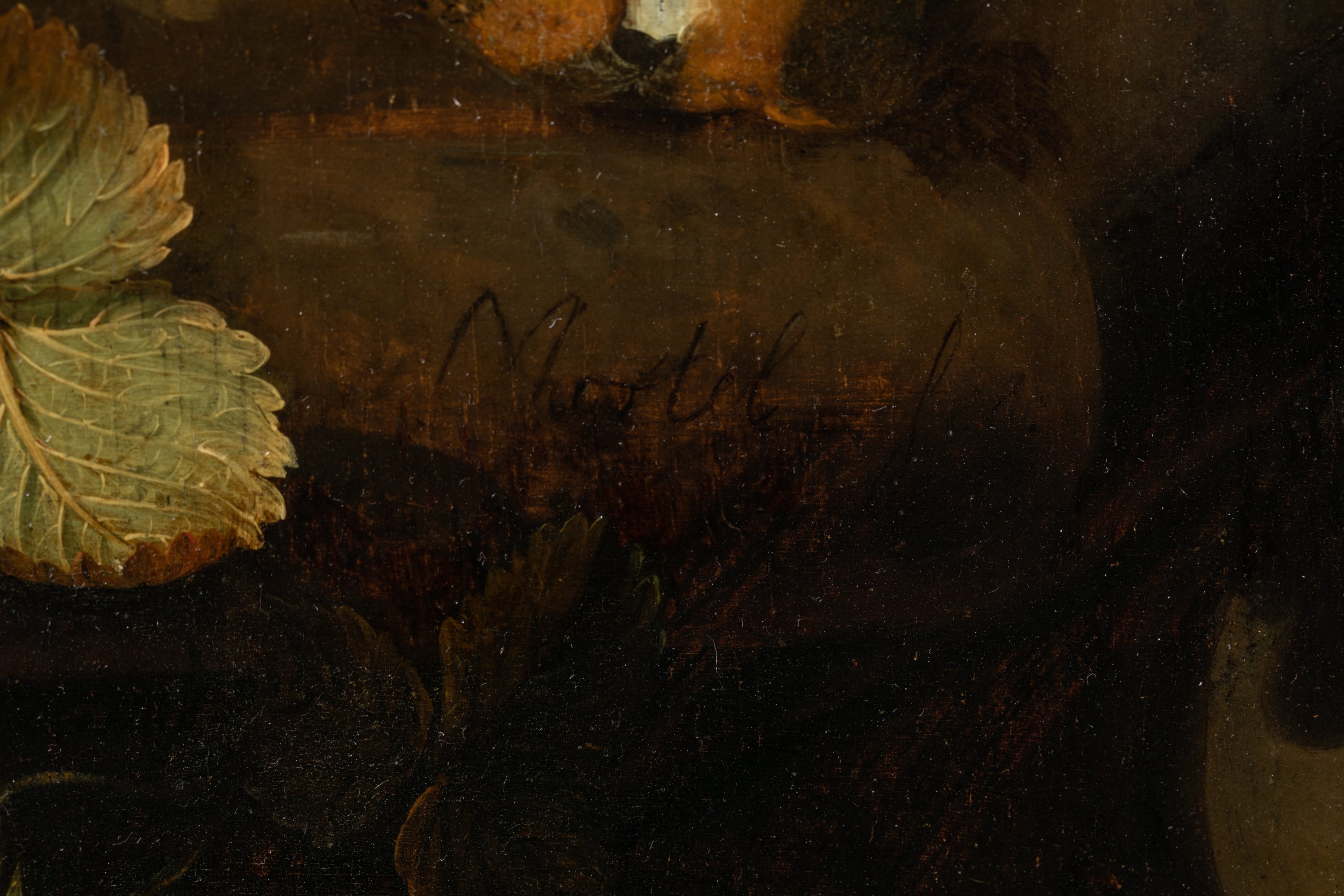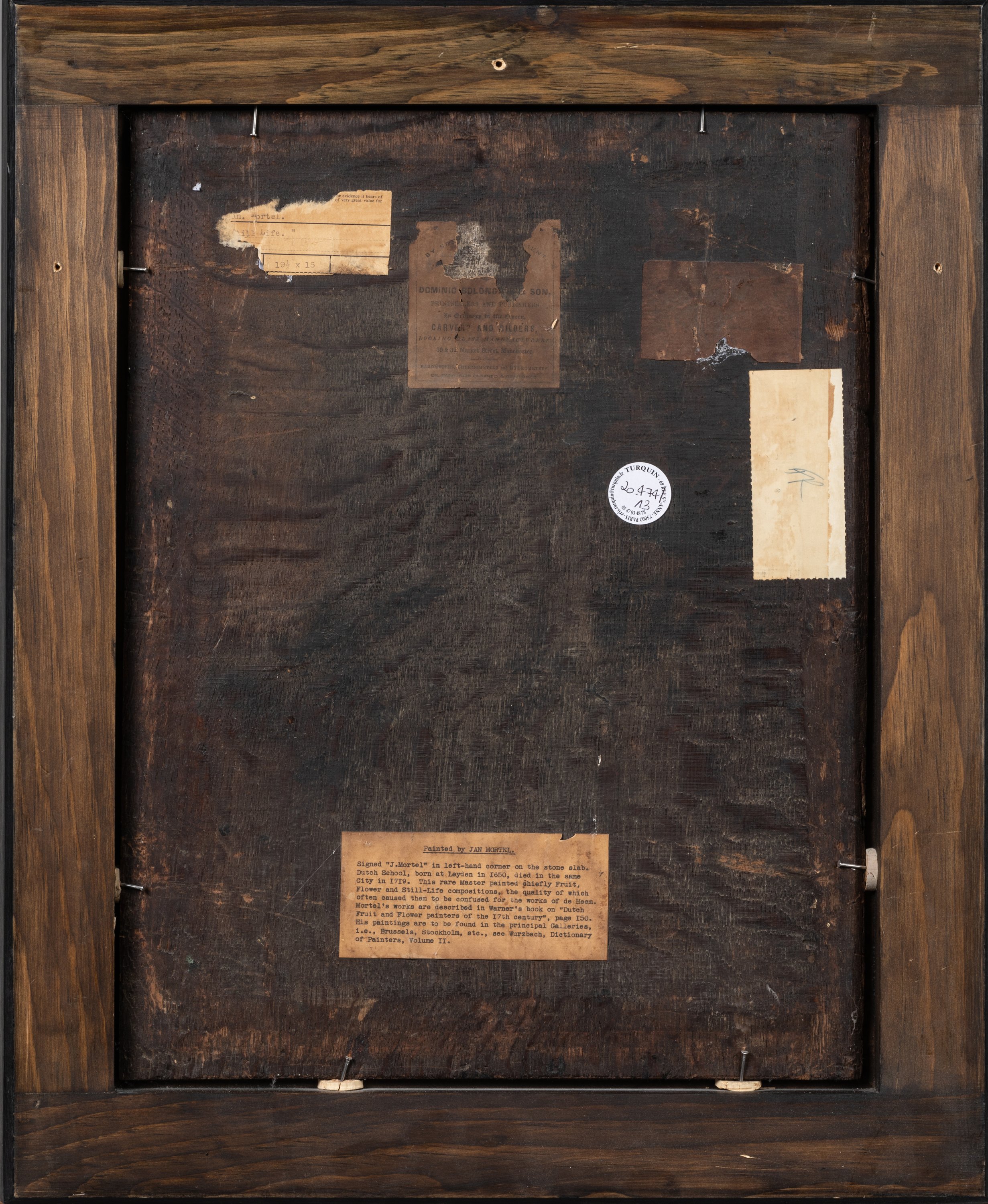 A still life by Jan Mortel depicting roses, raspberries, orange, lemon and pomegranate. Panel painting. Signed "Mortel fec."