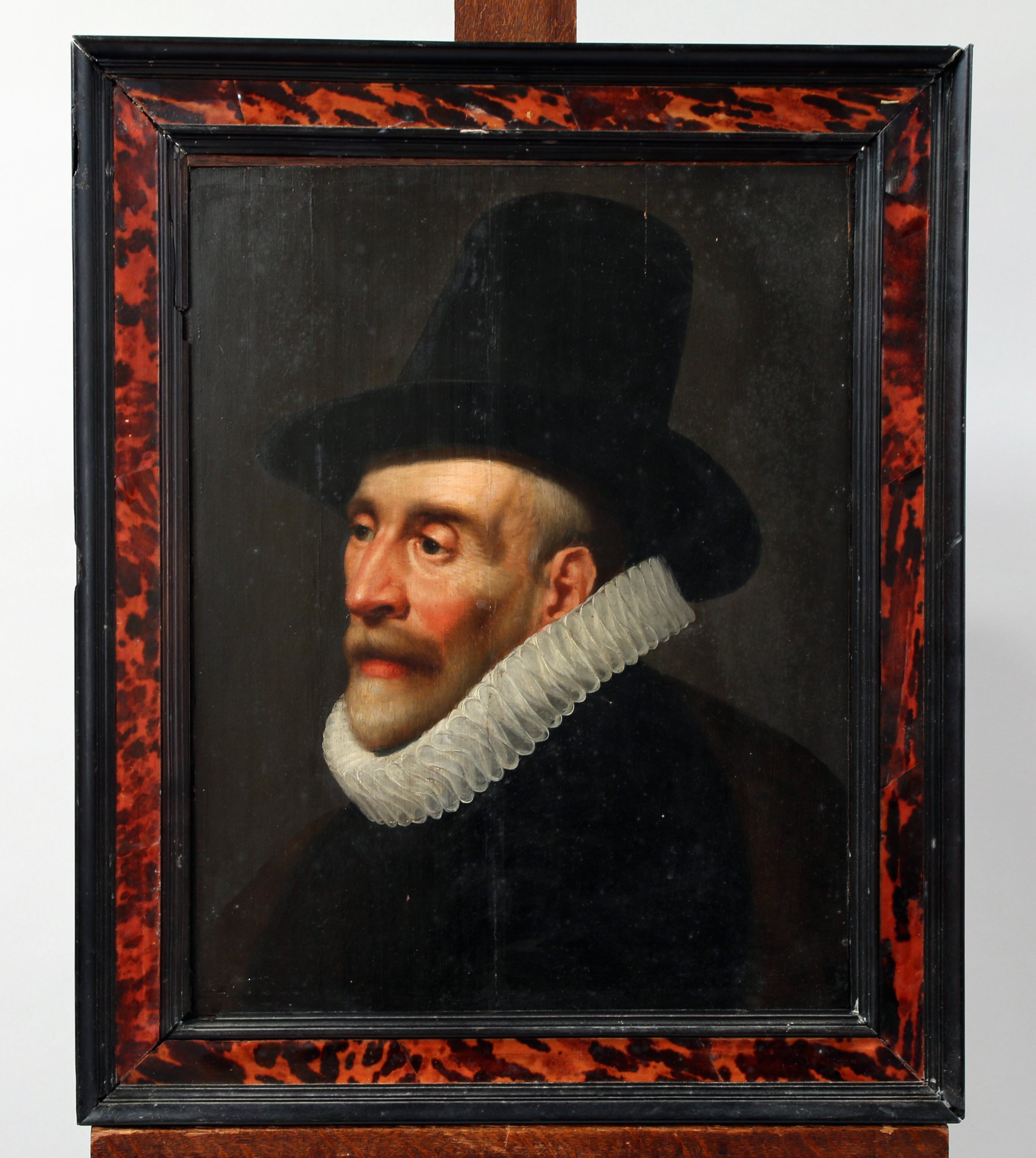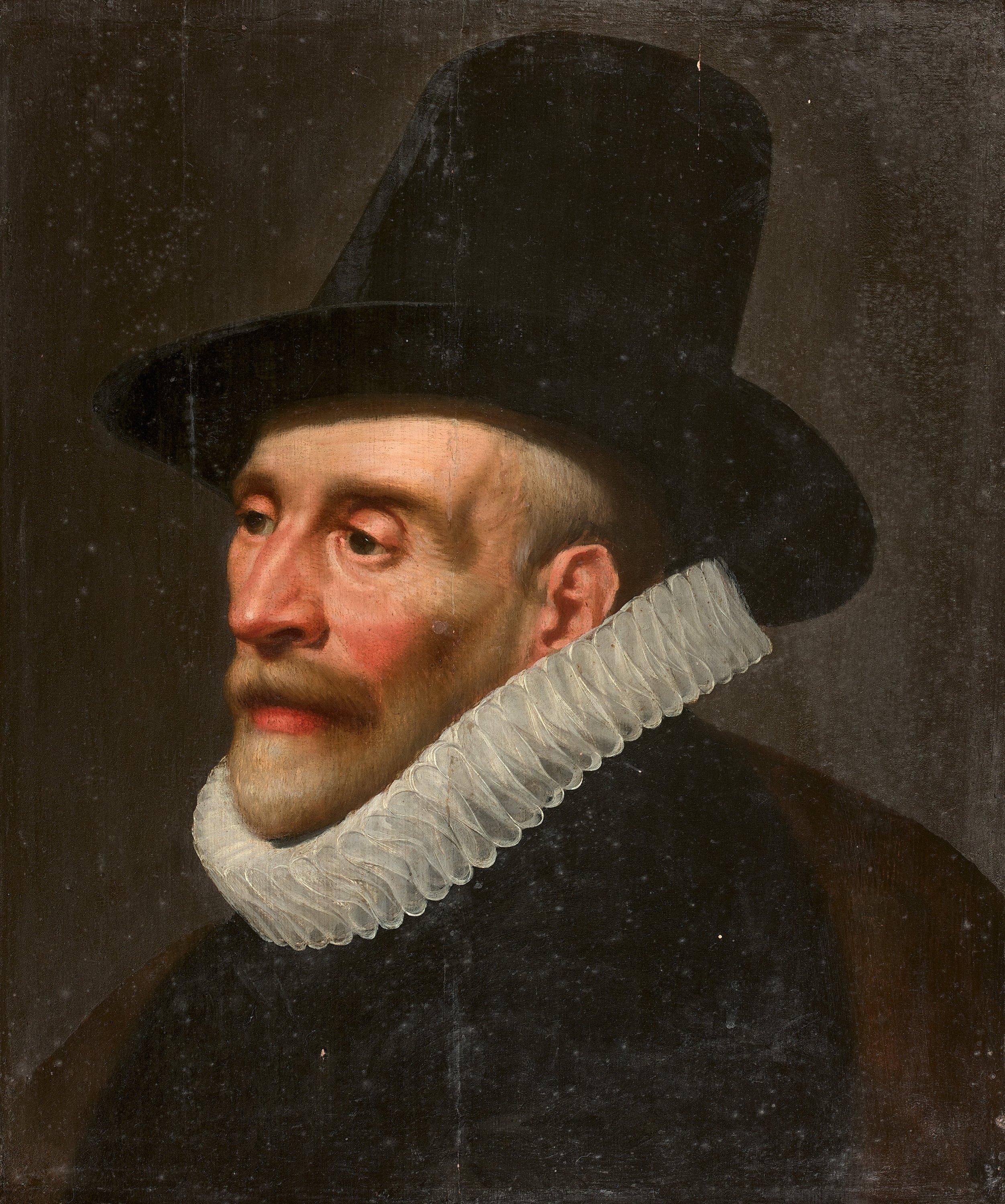 A portrait of a man in a hat attributed to Thomas de Keyser. Reinforced panel painting.