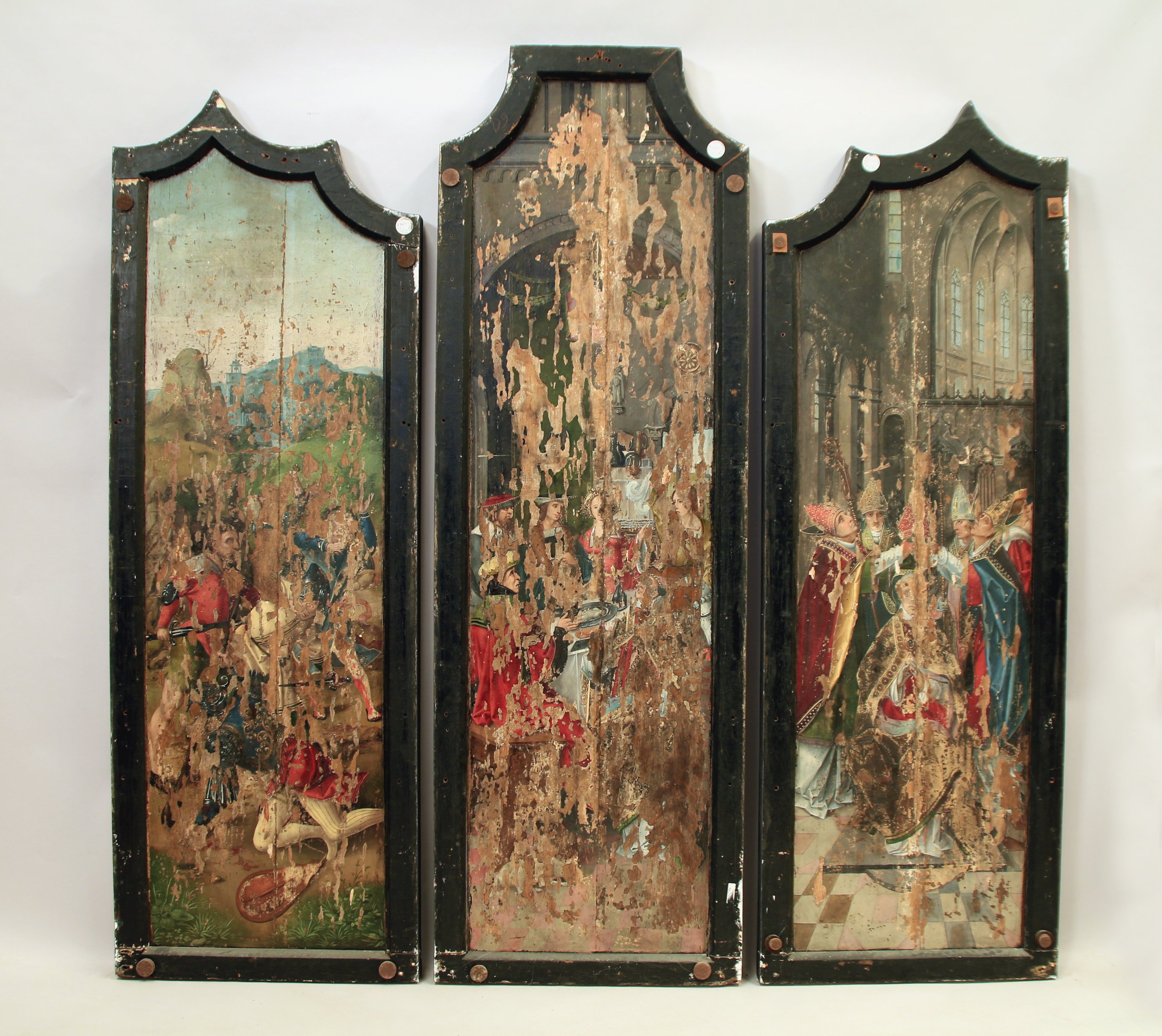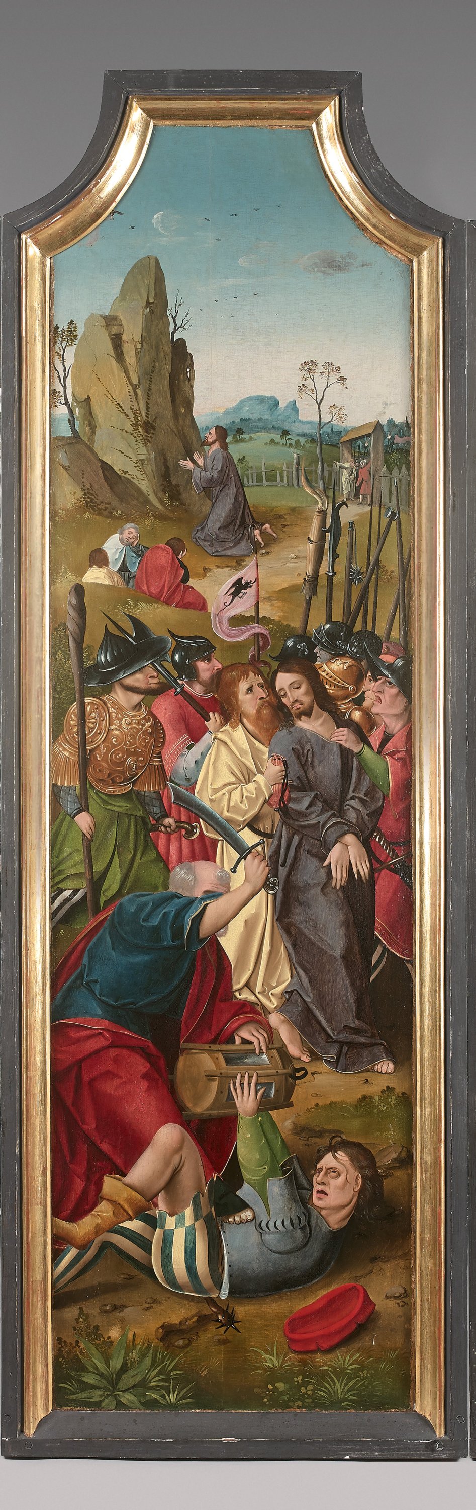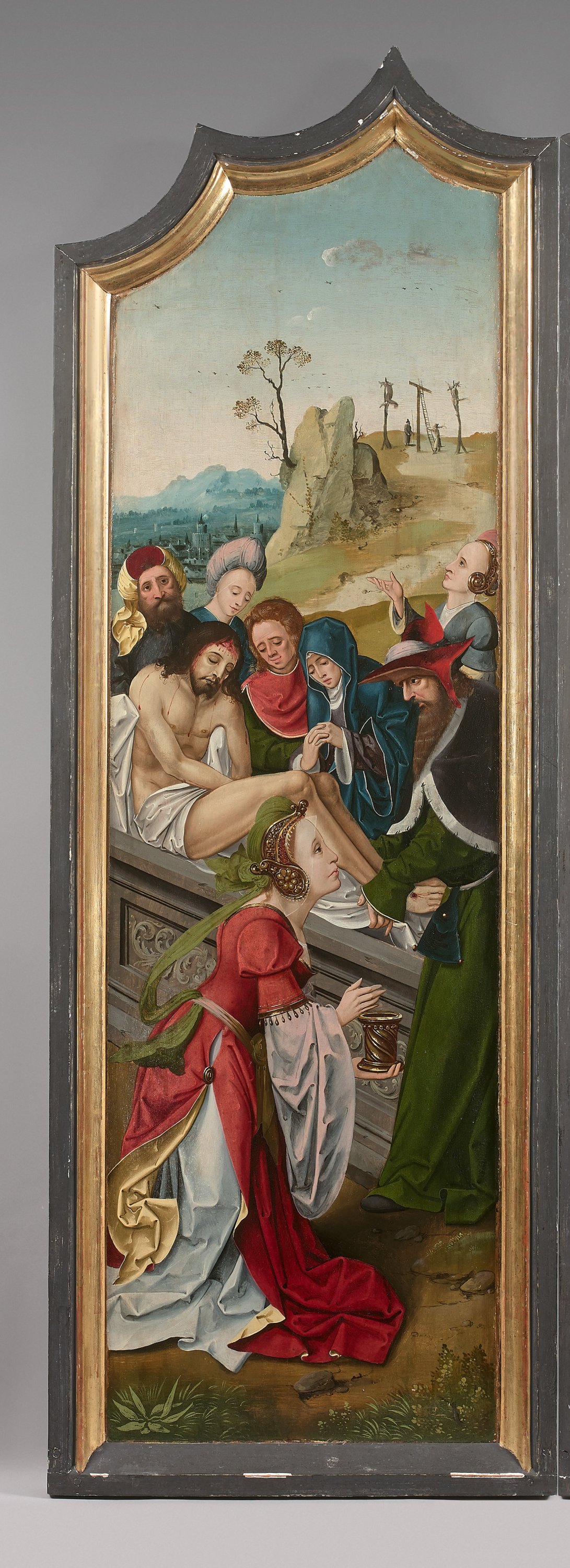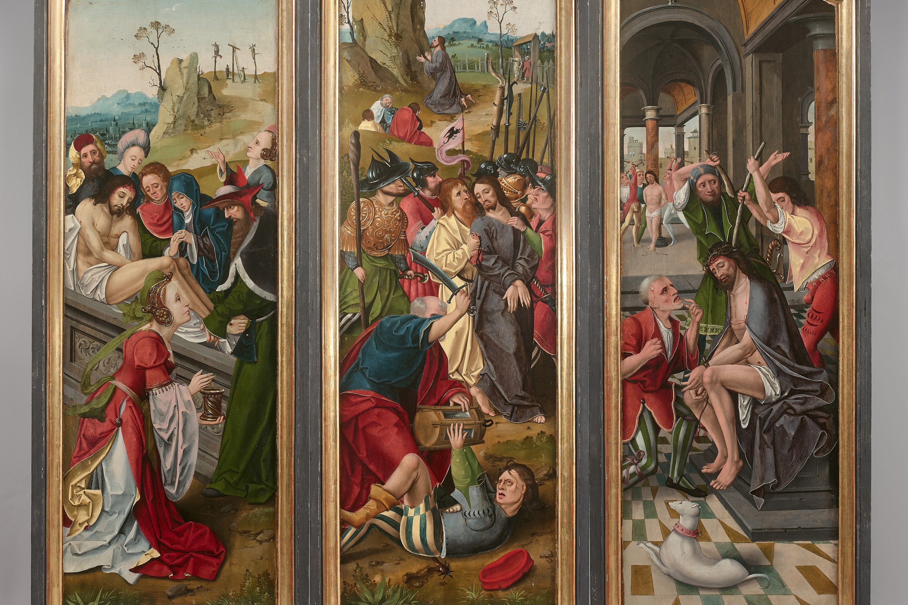 A set of three paintings attributed to the Master of the Antwerp Adoration depicting the Entombment of Christ, Christ On The Mount of Olives, and The Mocking of Christ. Panel paintings.