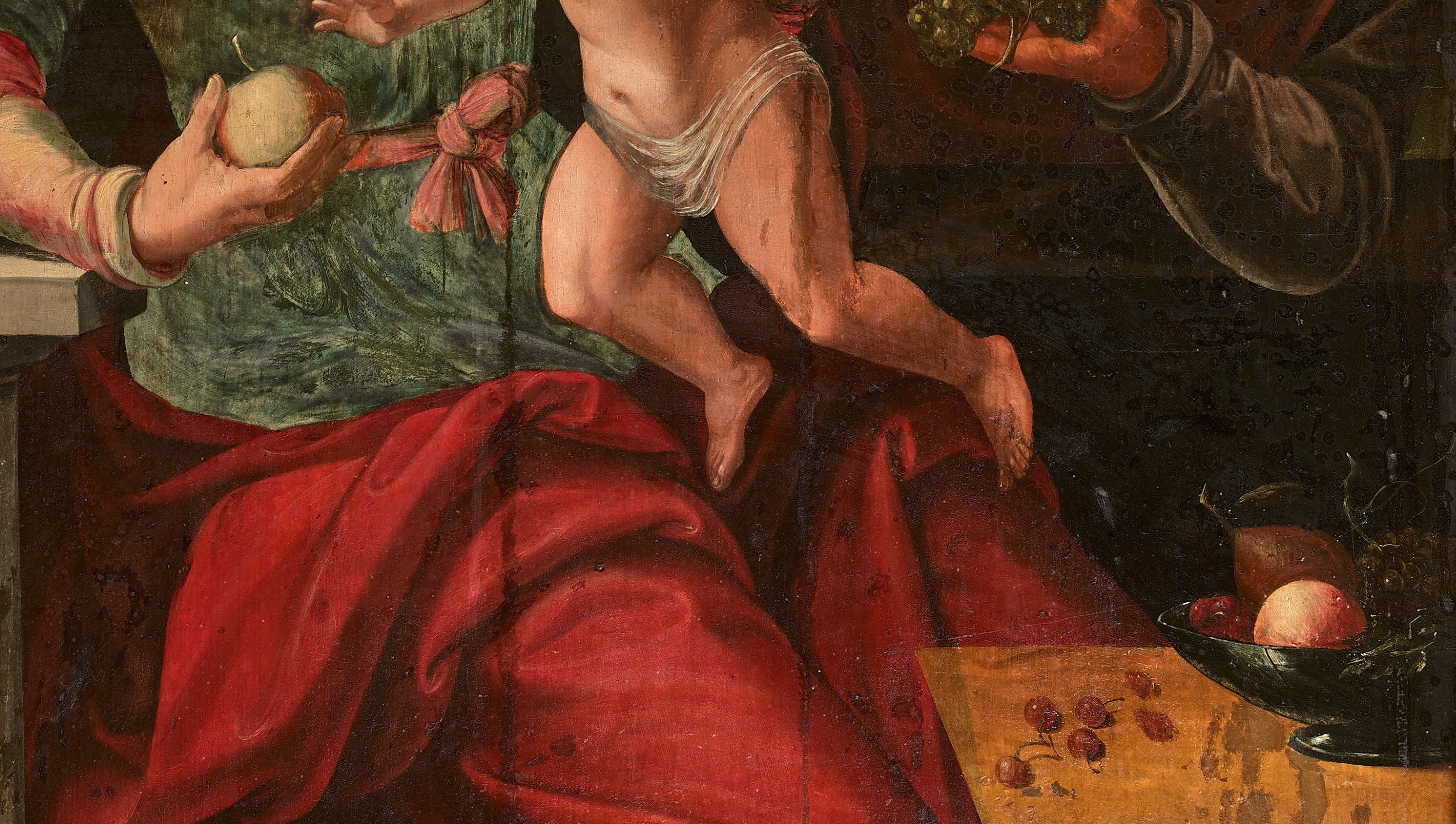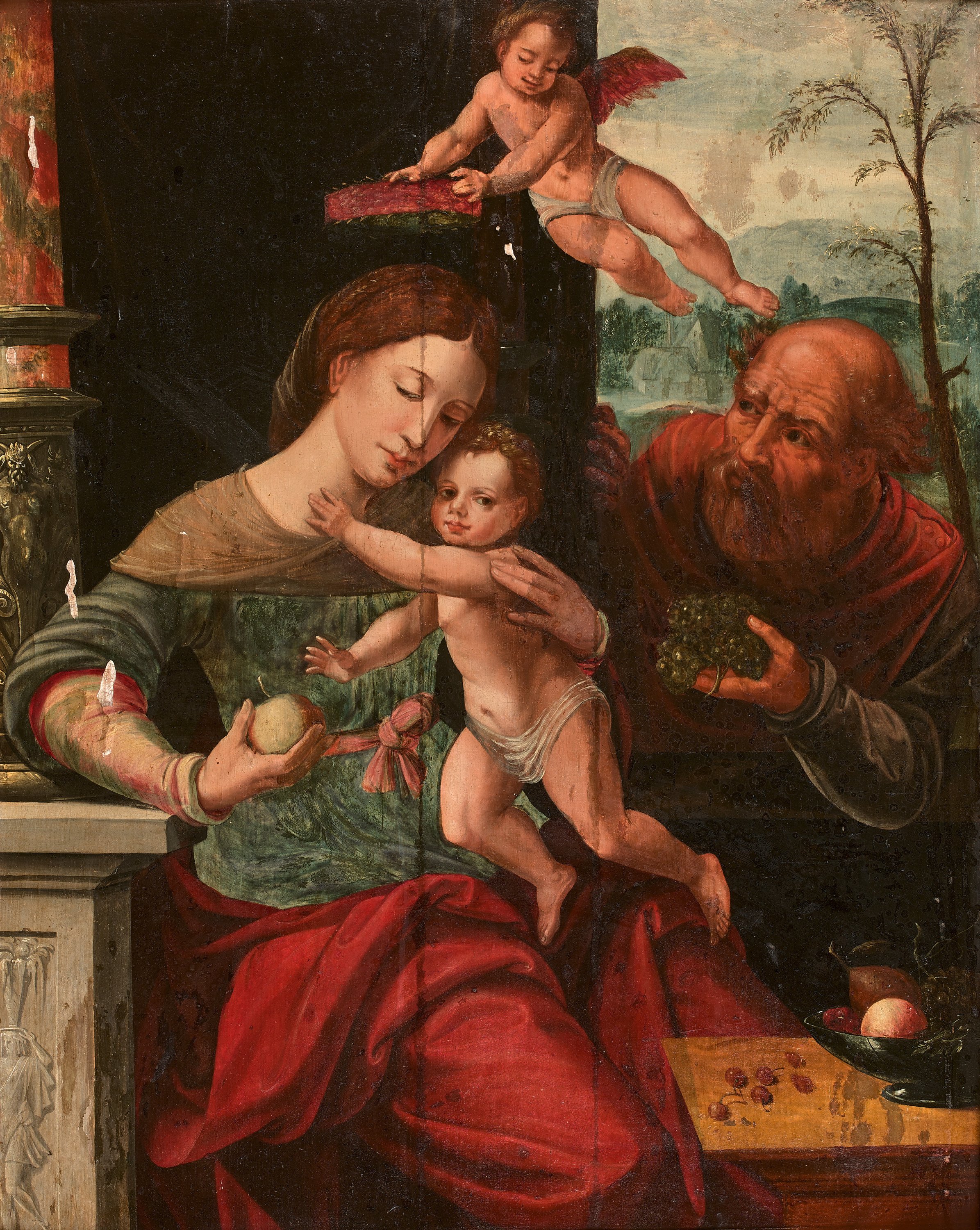 A Flemish 16th century painting of the Holy Family by a member of Pieter Coecke van Aelst's entourage. Oak panel painting.