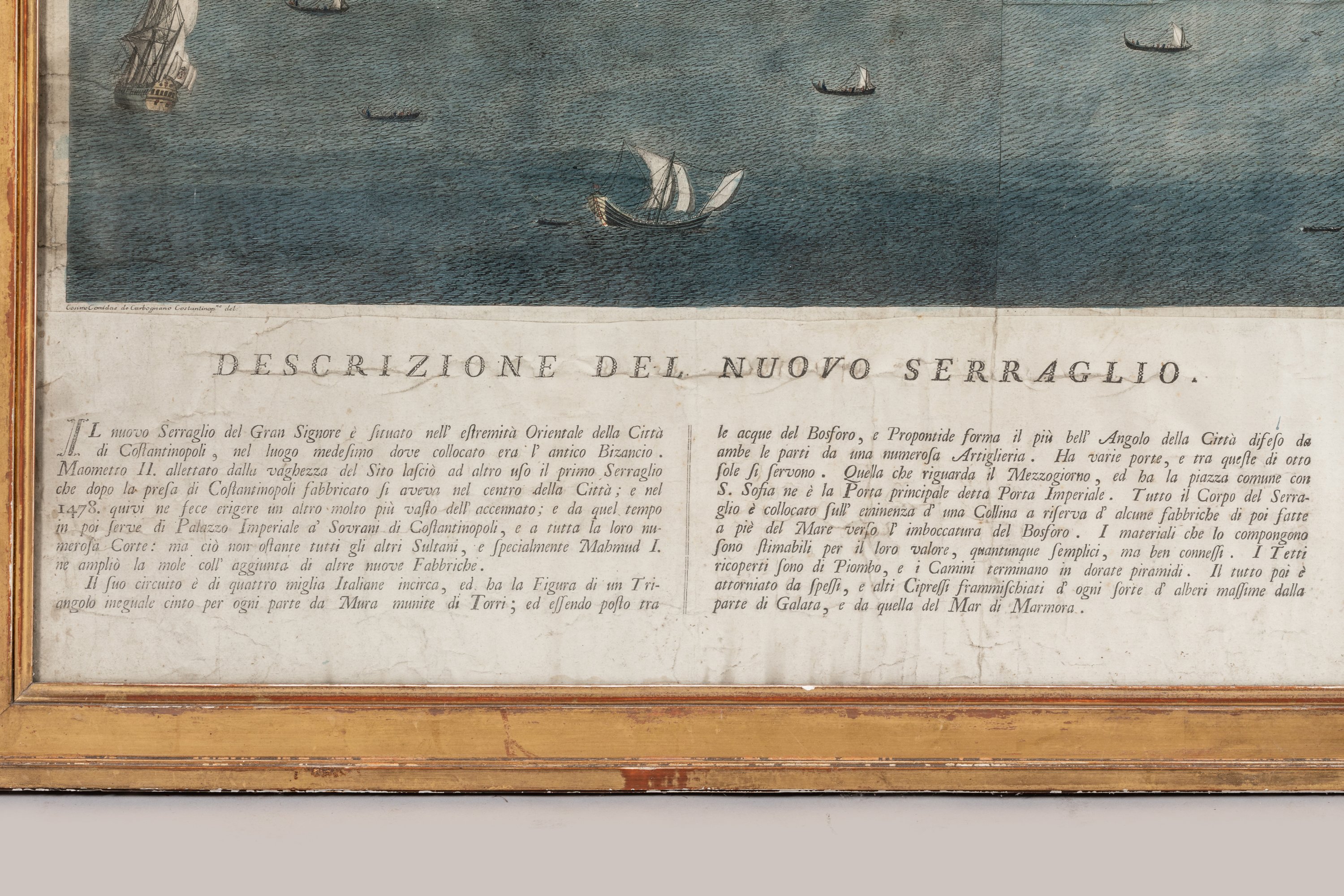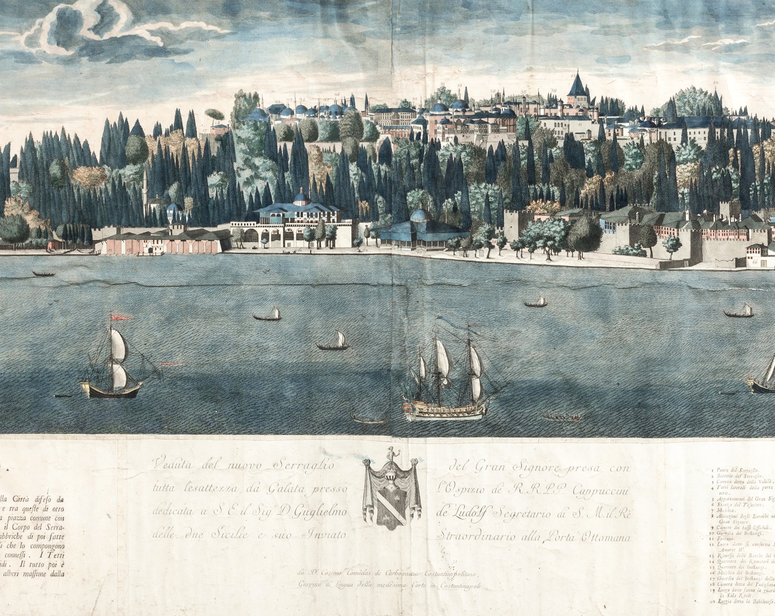 Titrée et dédicacée: « Veduta del nuovo Serraglio tutta lésattezza da Galata presso dedicata a S.E. il Sig D Guglielmo delle due Sicilie e suo Inviato del Signore presa con LOspizio de R.R.P.P. Cappuccini de Ludolf Segretario di S.M il Rè Straordinario alla Porta Ottomana ».