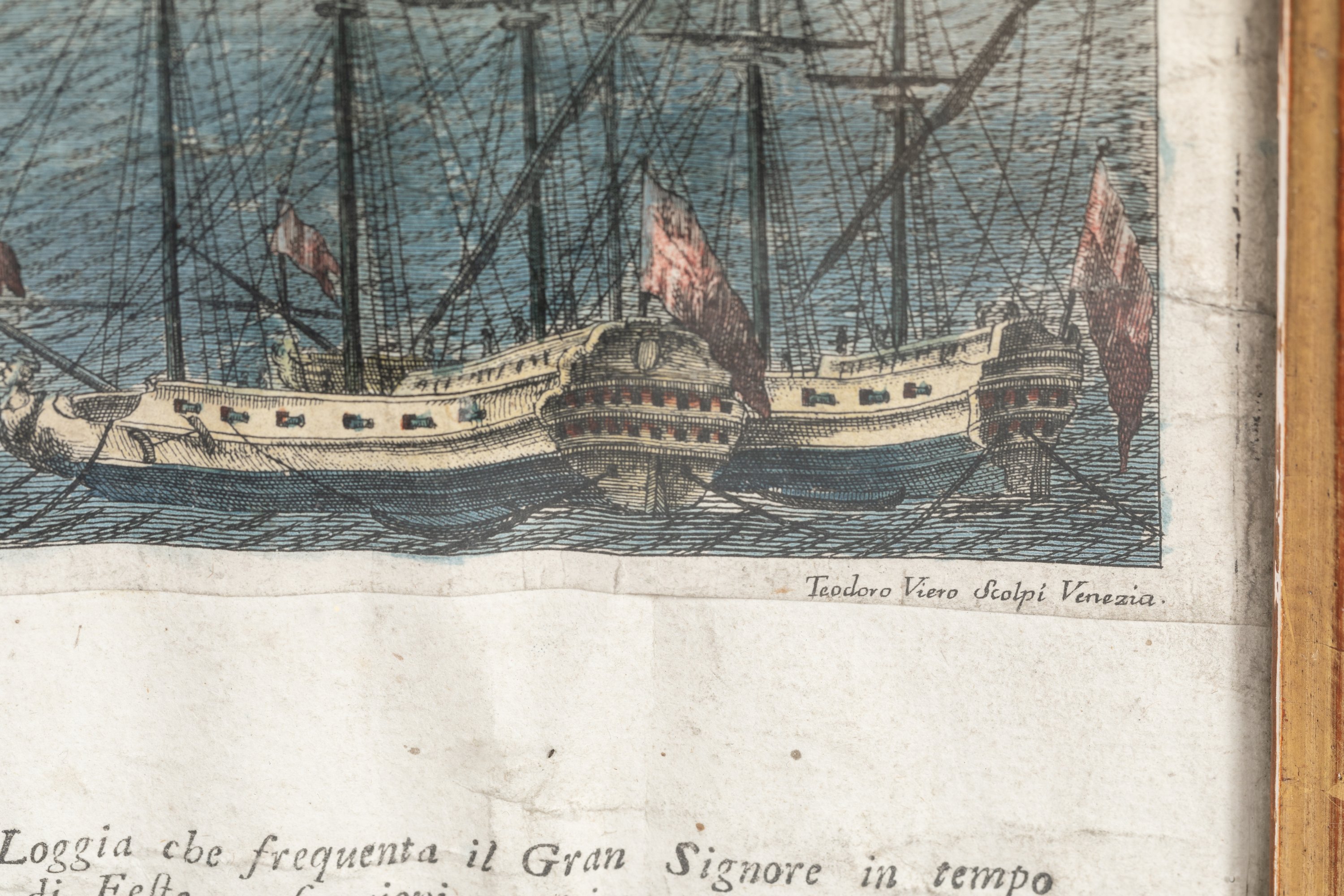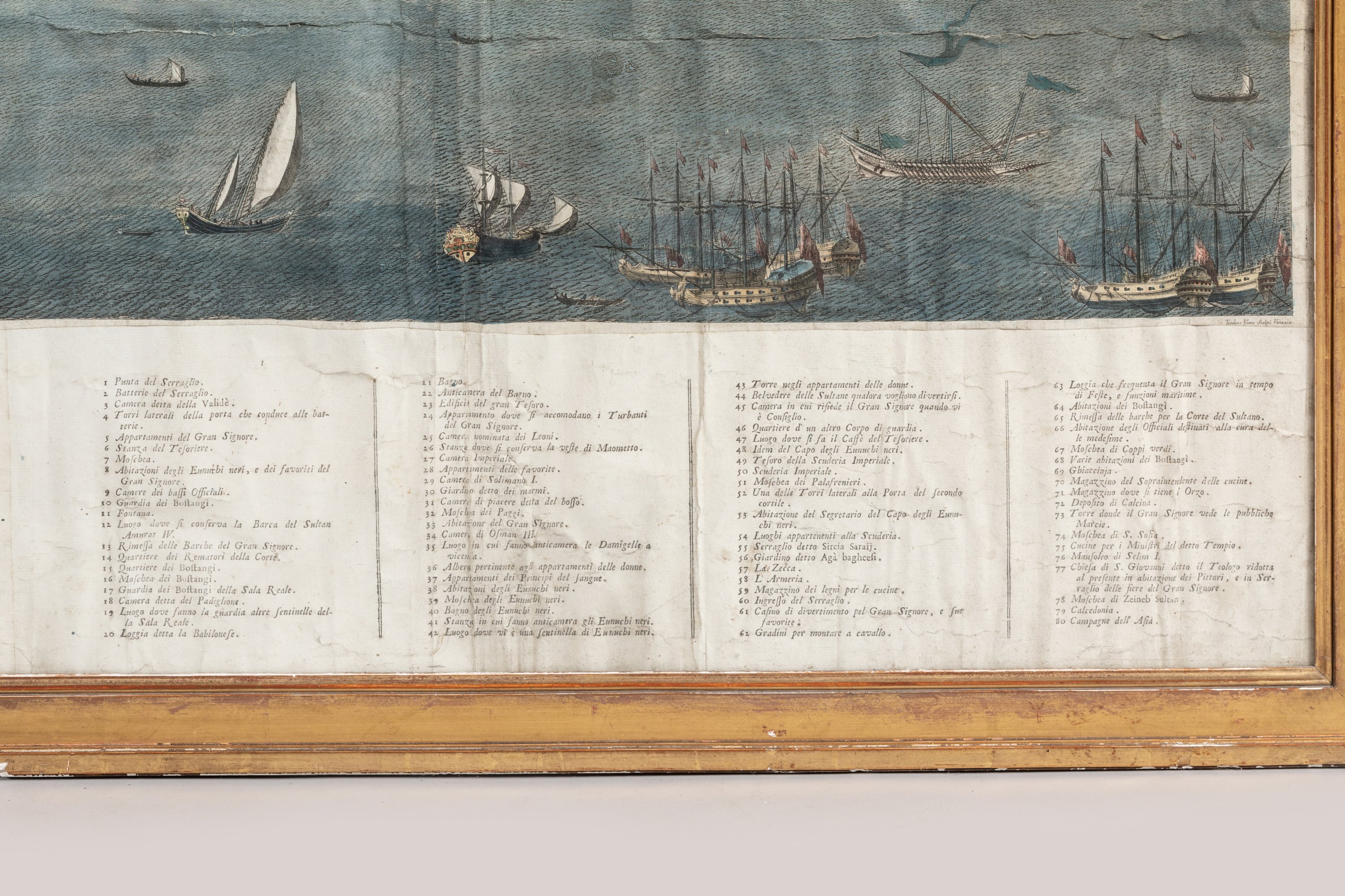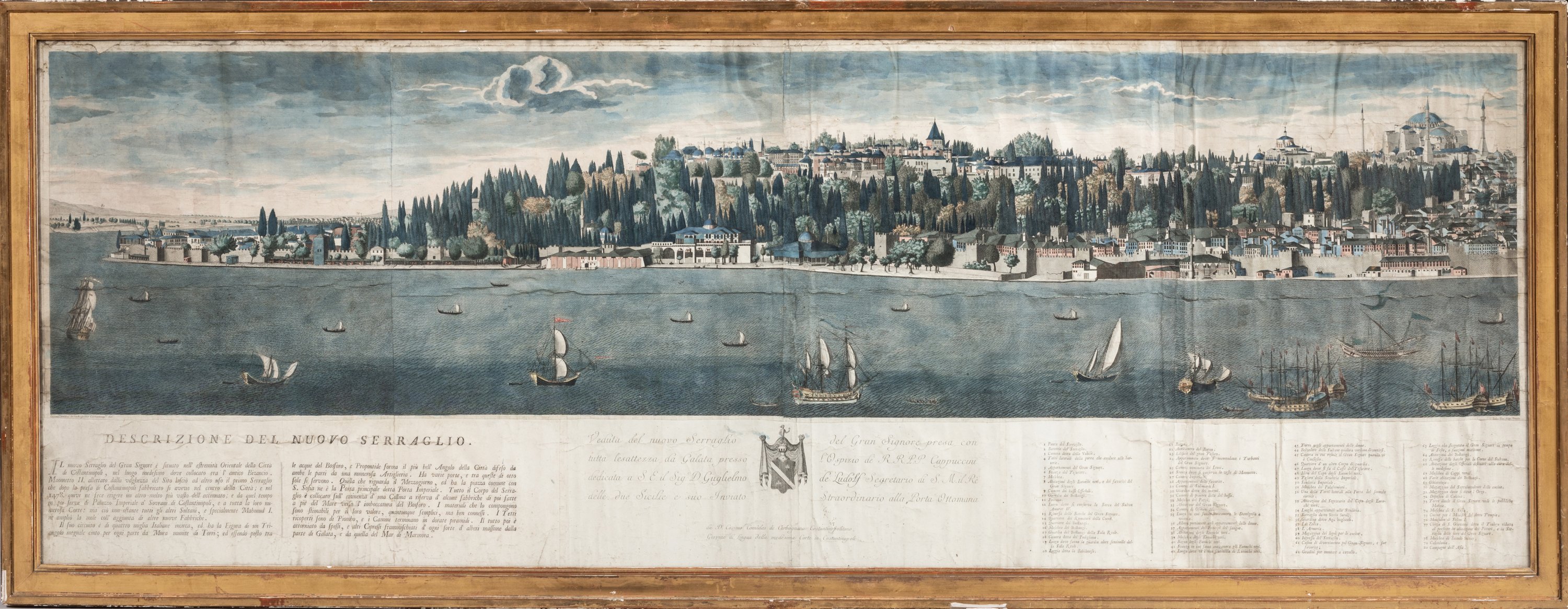 Par ses belles dimensions et sa transcription topographique précise, notre gravure se présente comme un rare témoignage de la Sublime Porte à la fin du XVIIIe siècle. Quatre-vingt points dintérêts du palais de Topkapi sont numérotés dans le dessin et légendés en bas, des appartements les plus intimes jusquà Sainte Sophie en passant par le mausolée du sultan Selim. Si cette gravure dérive de la partie gauche dun grand dessin à lencre dédicacé après 1794 au premier ministre espagnol Godoy, son commerce est attesté à Venise dès 1778. Toutefois, un seul exemplaire était jusquà présent référencé au musée Benaki d'Athènes. Une suite gravée de ce panorama, provenant de lancienne collection Von Celsing, serait conservée au Musée Orientaliste de Doha.