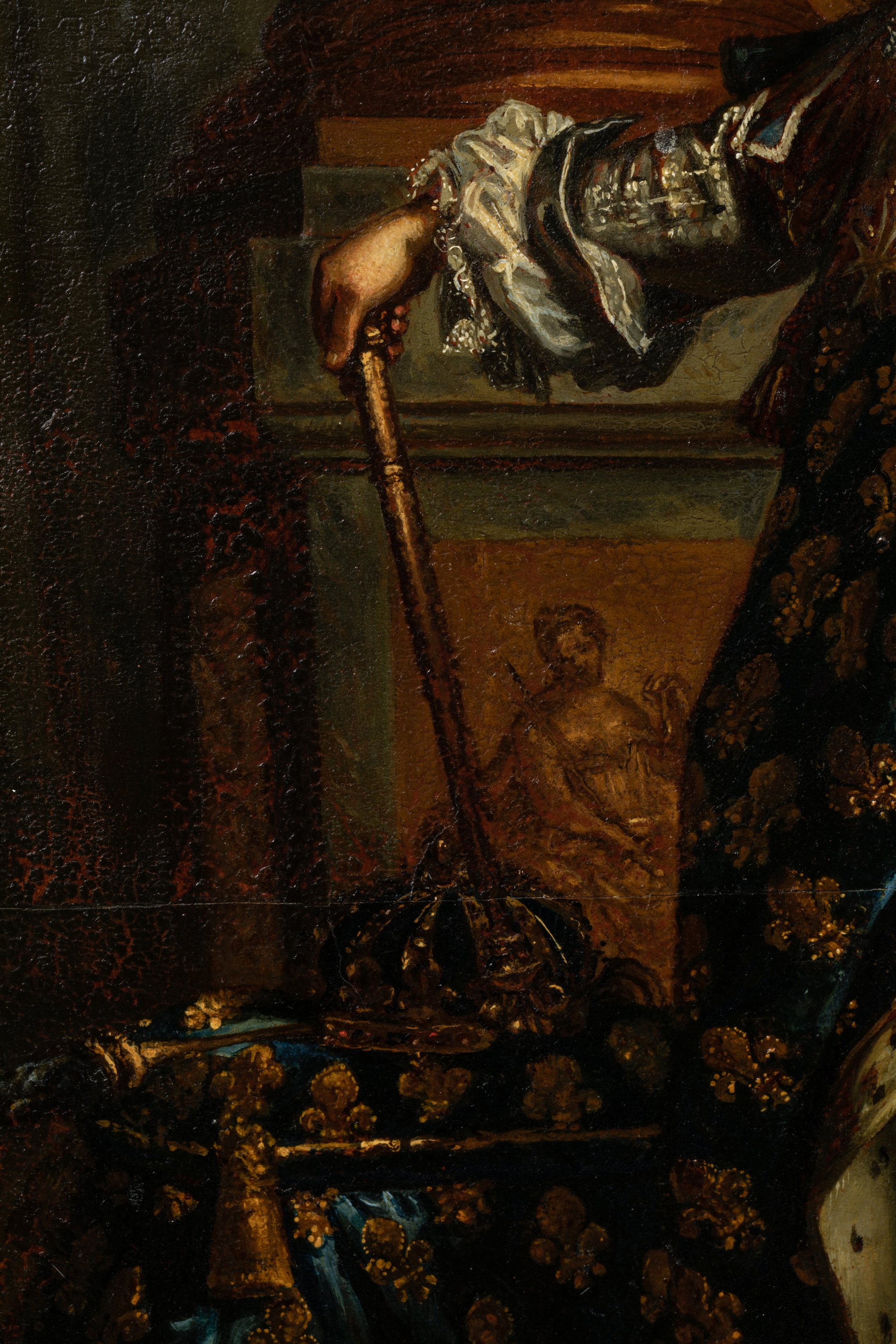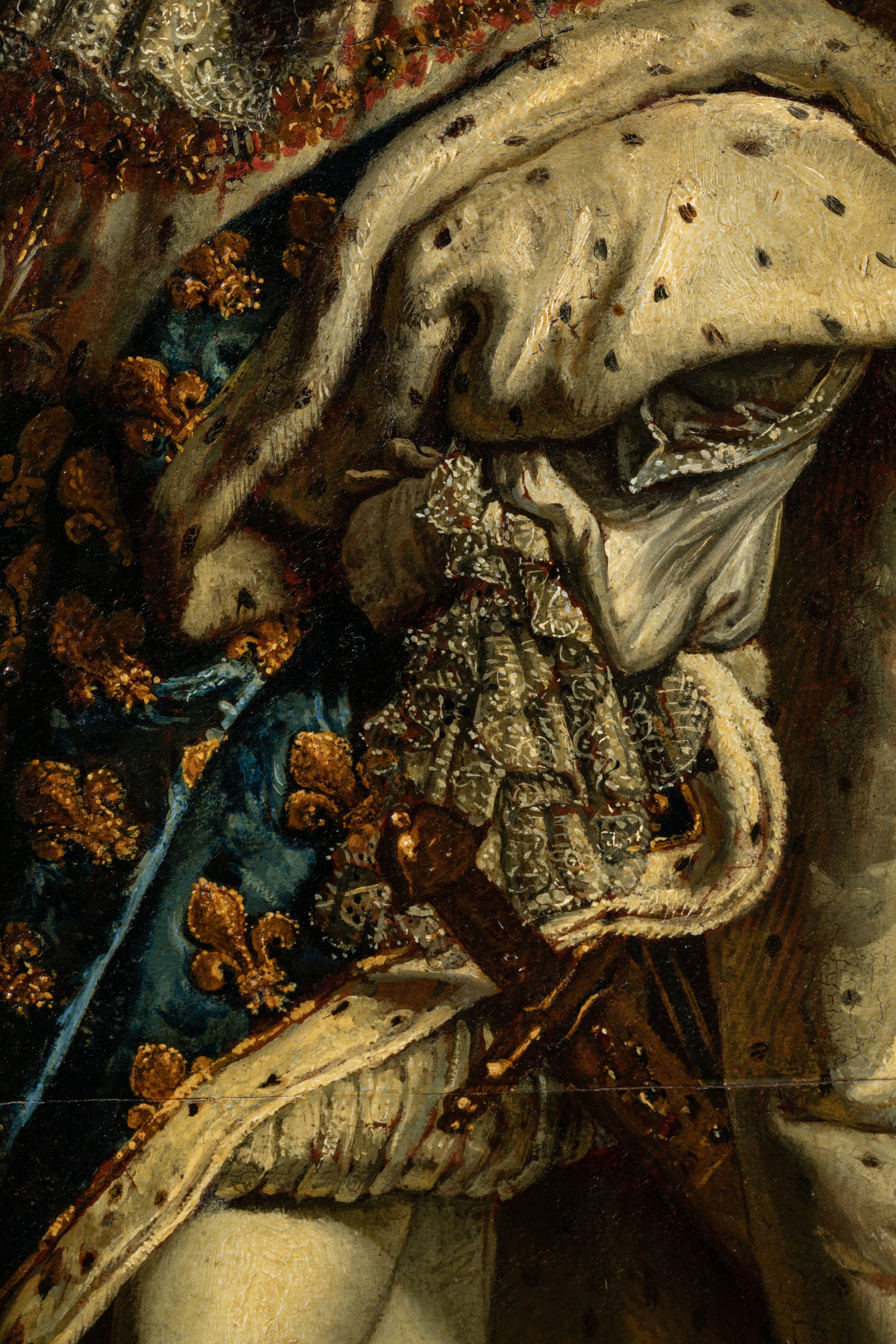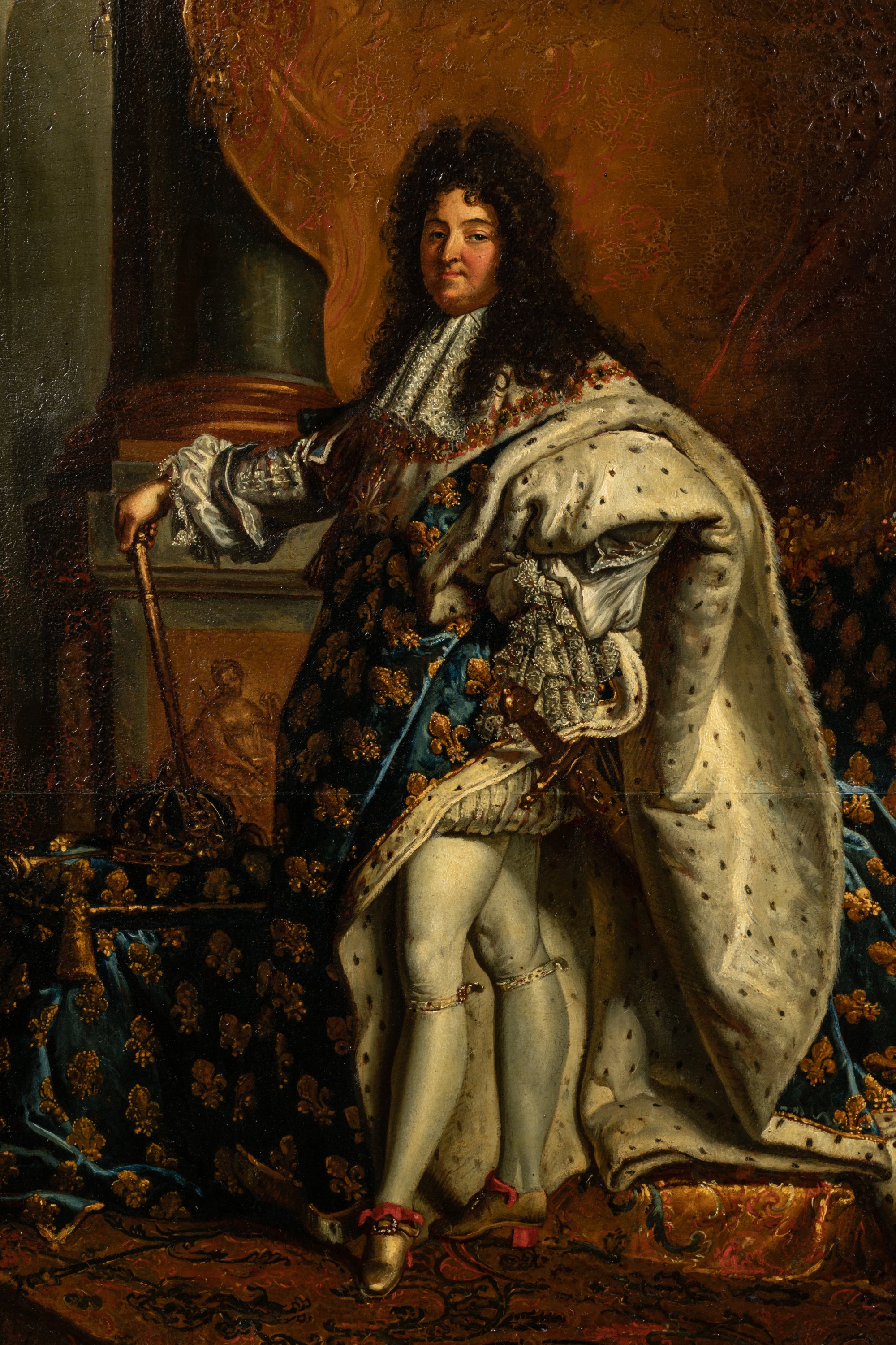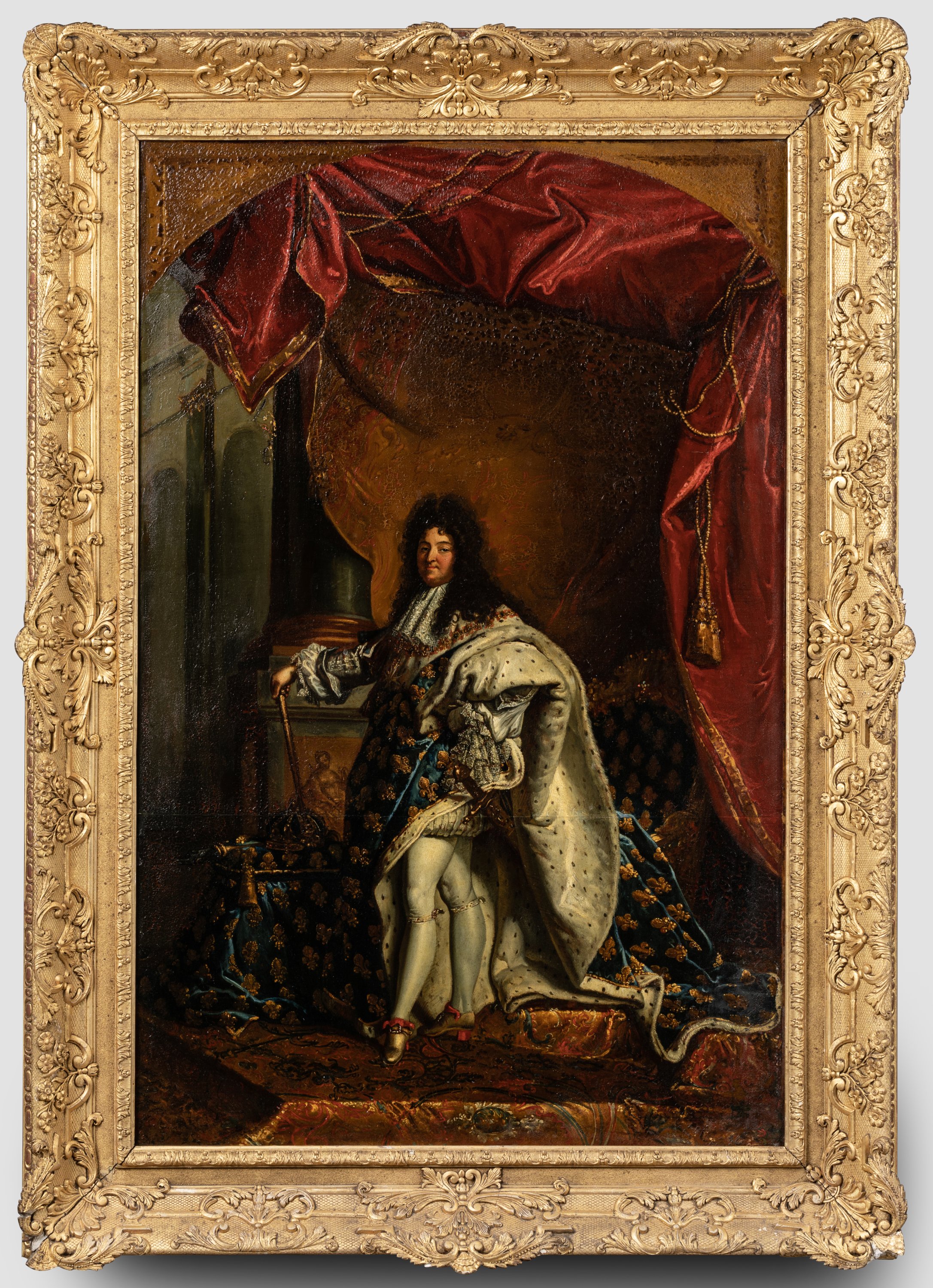 A French 19th century painting inspired by Hyacinthe Rigaud's "Portrait of Louis XIV in Coronation Robes". Paper mounted on canvas.