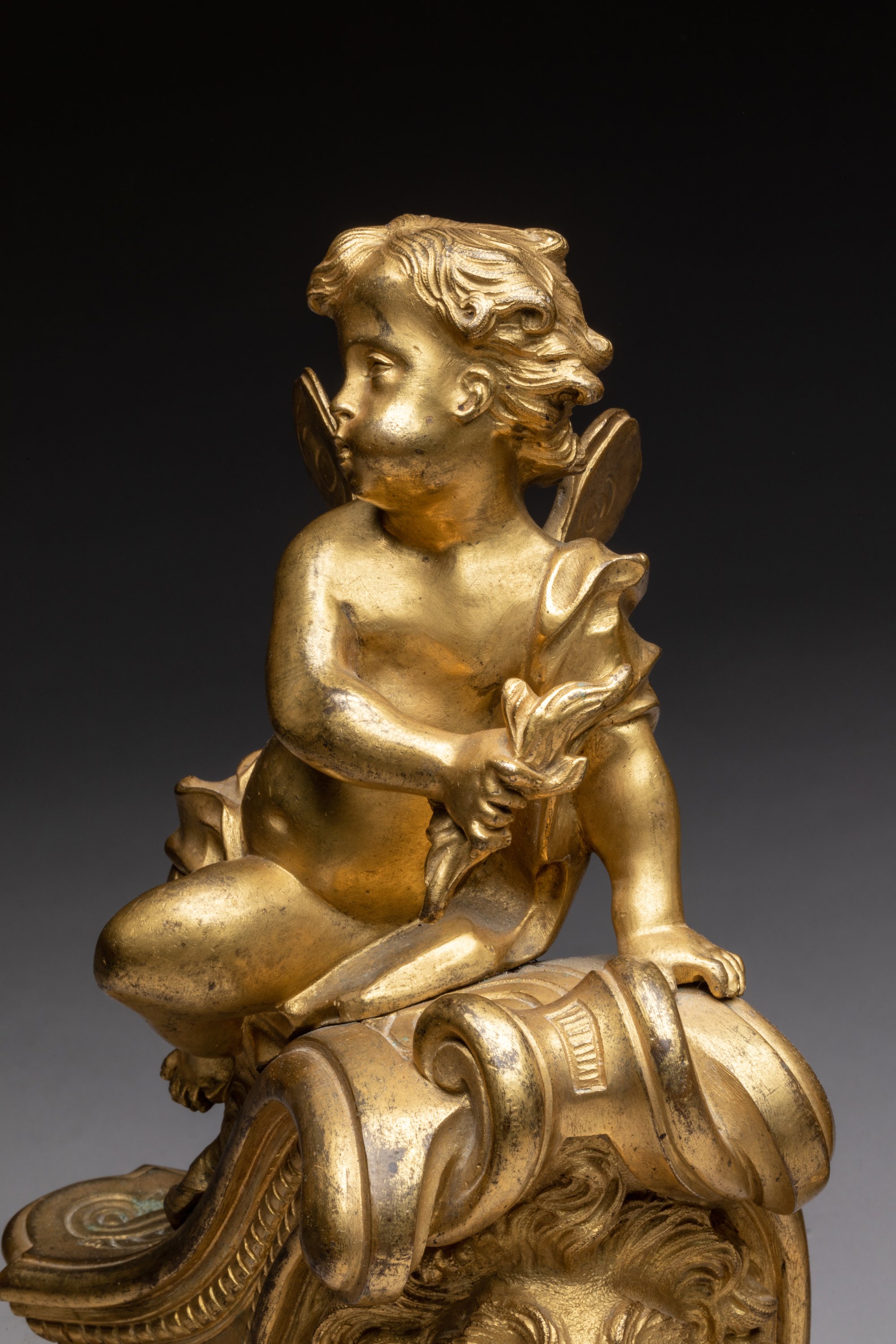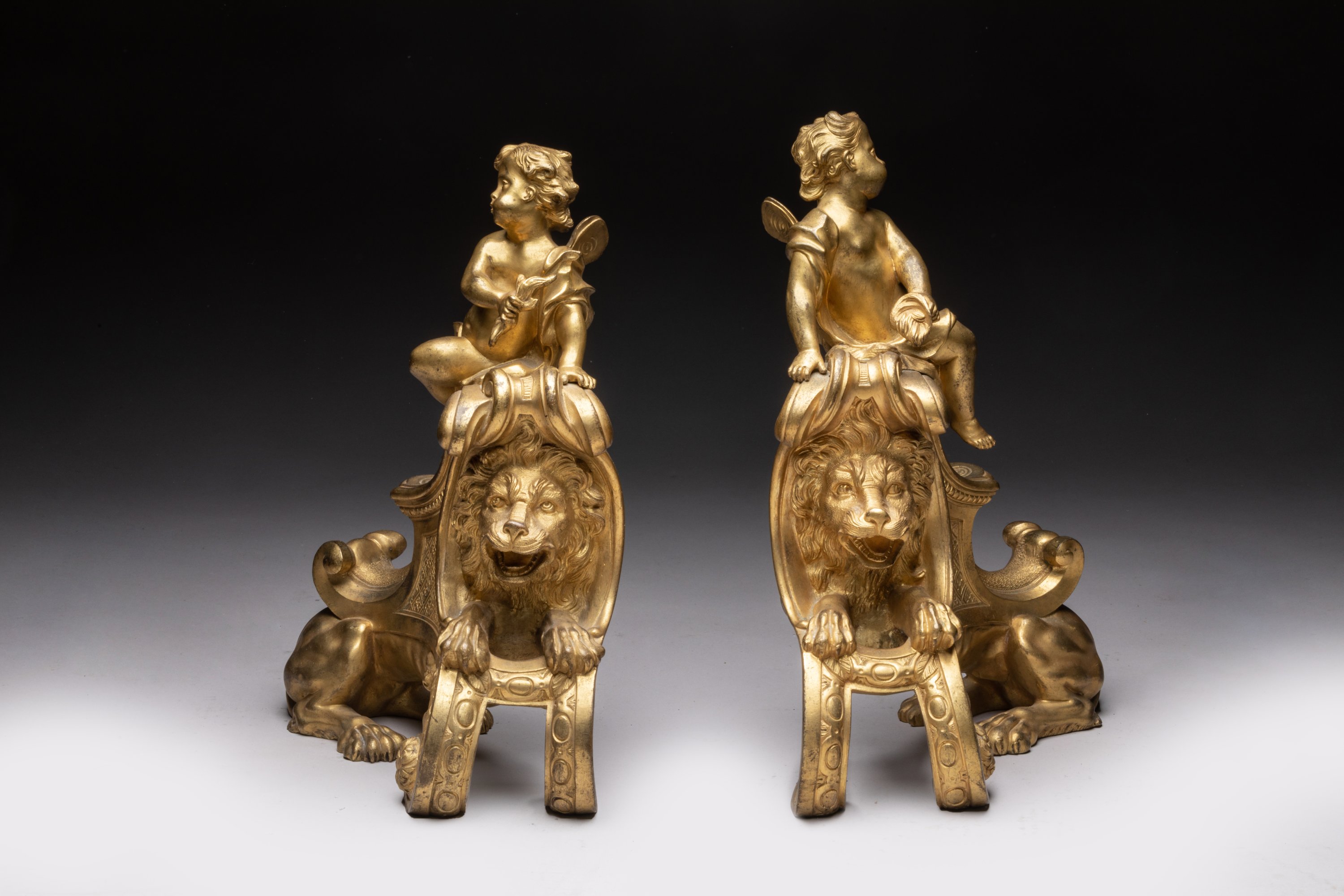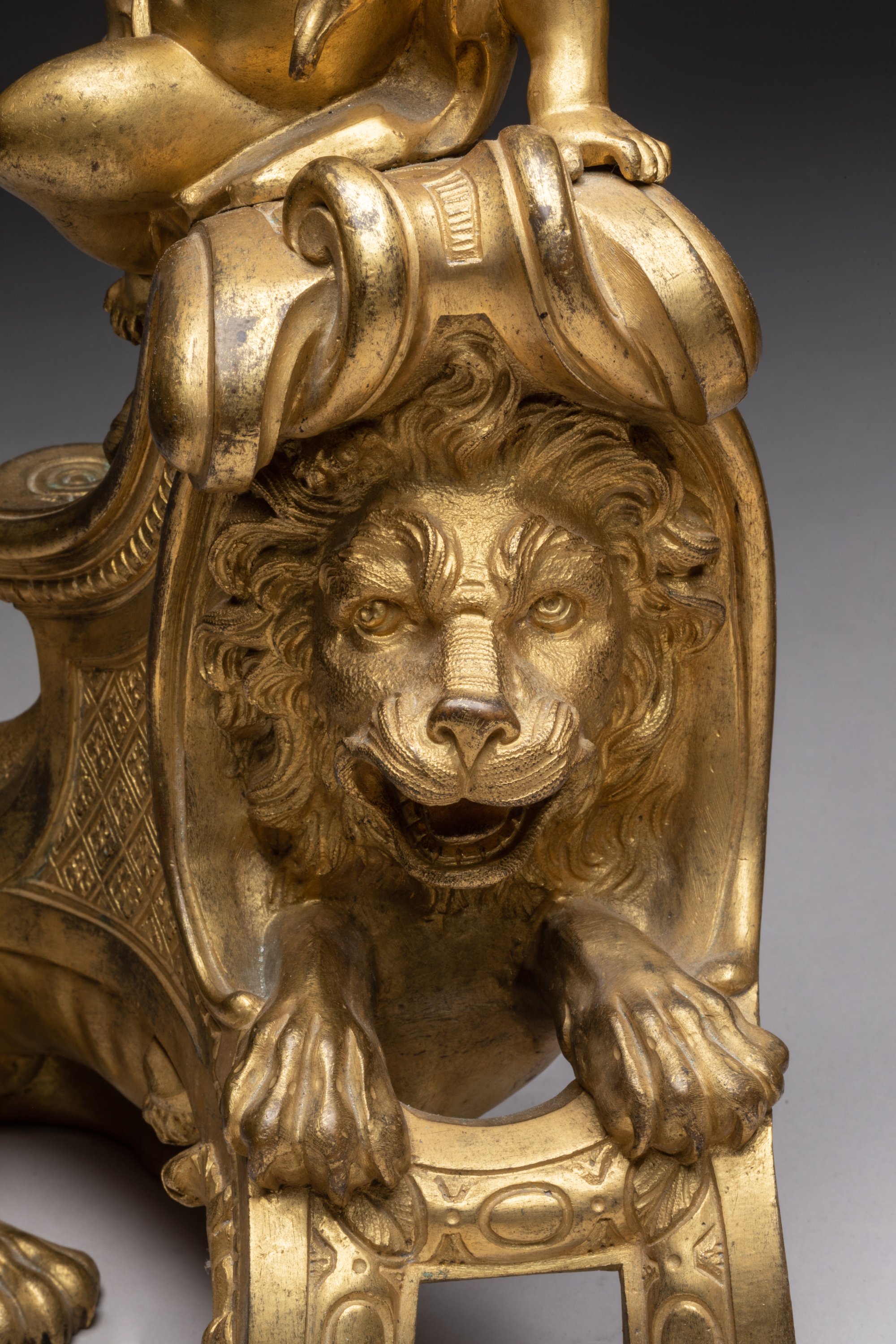 A pair of Regency period chiseled and gilded bronze andirons in the shape of lions exiting a cave topped by cherubs. Attributed to Charles Cressent.