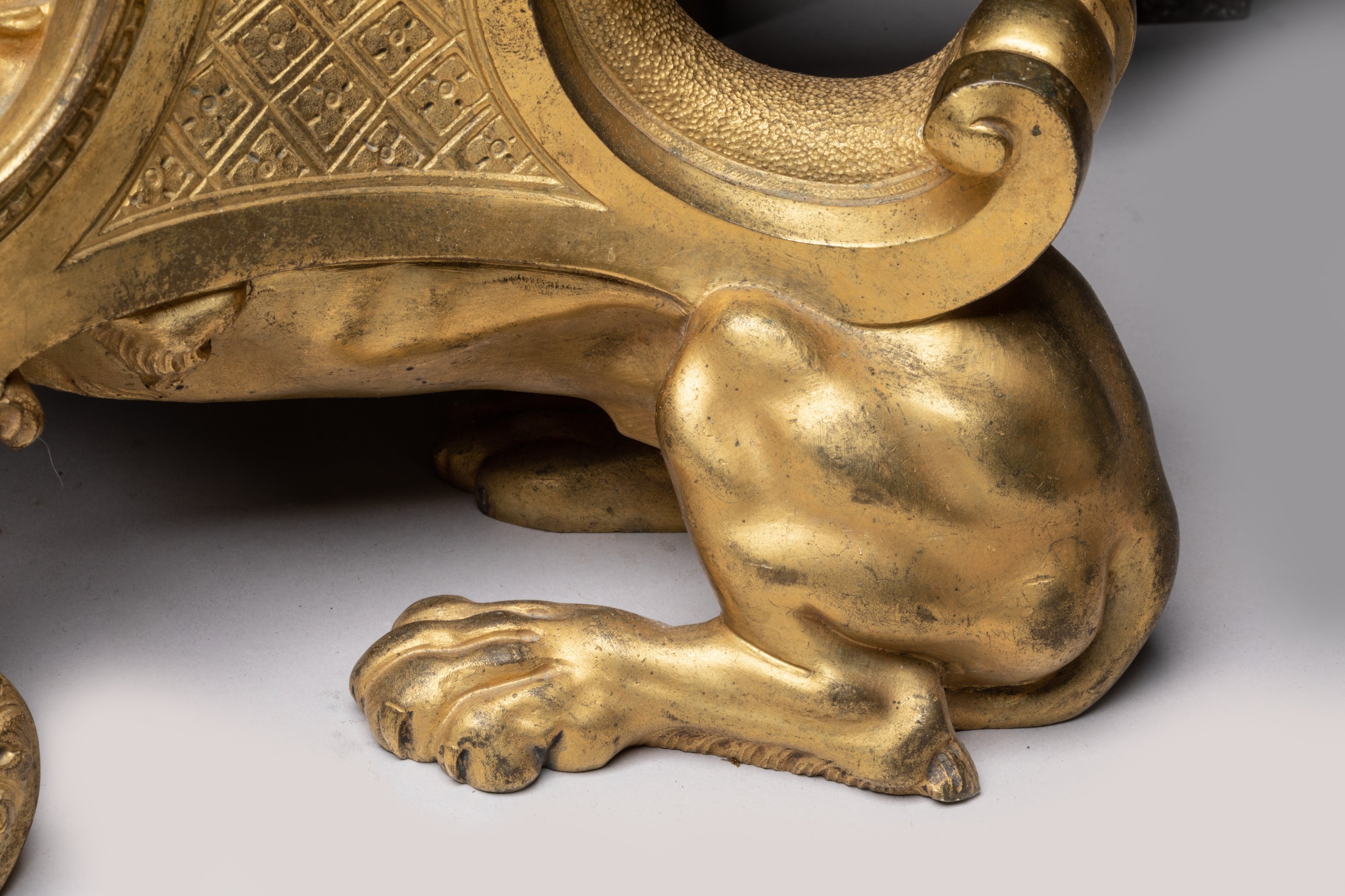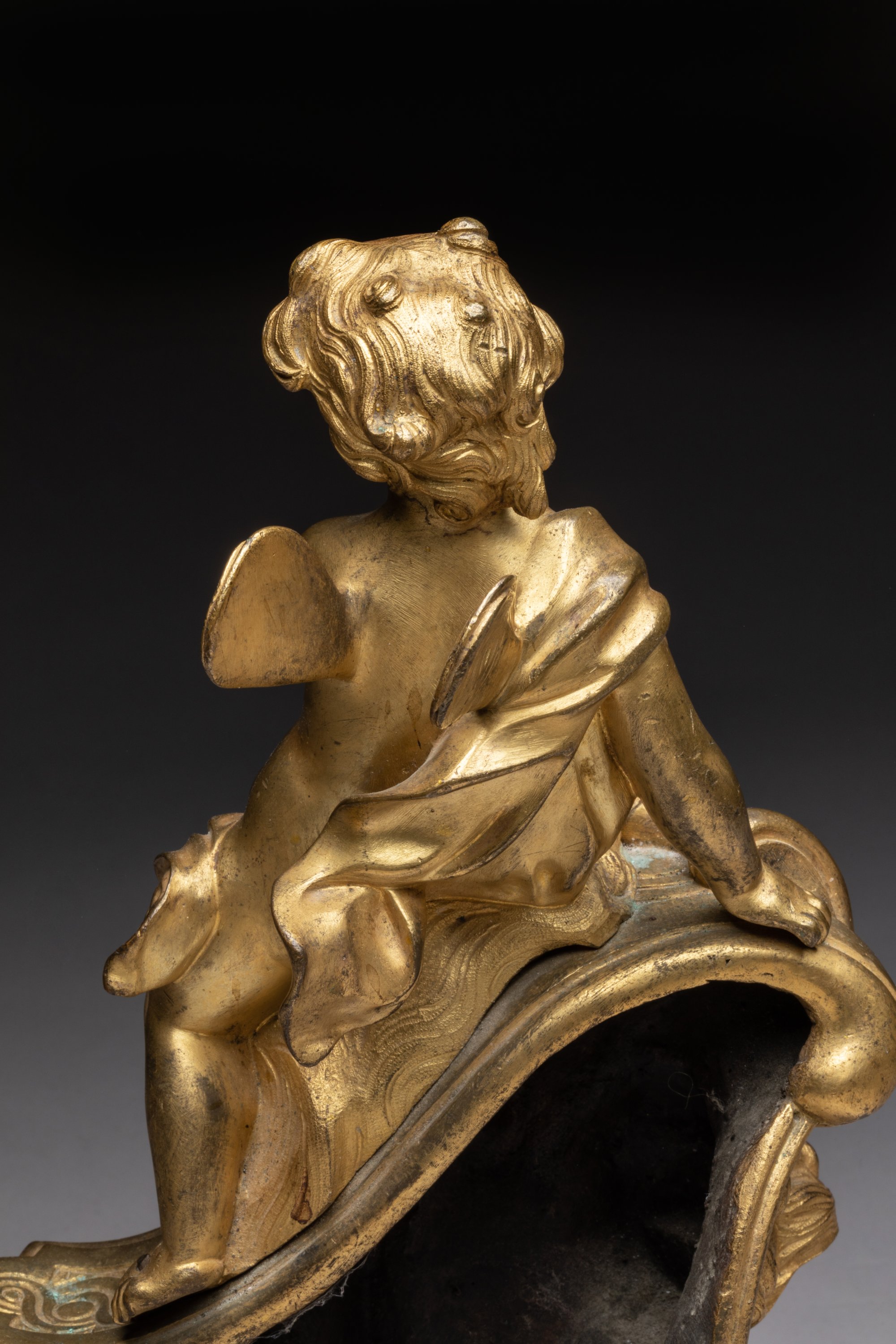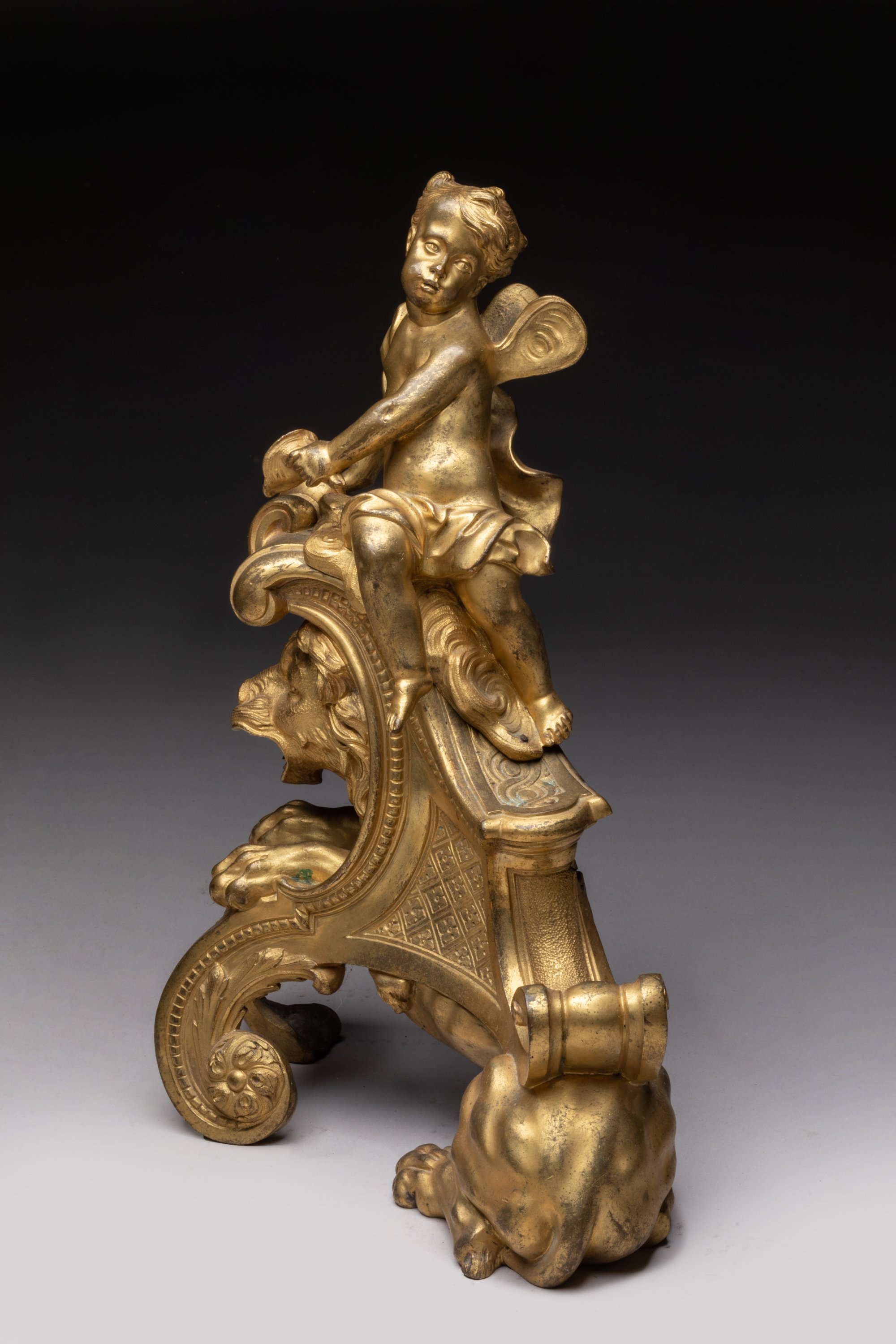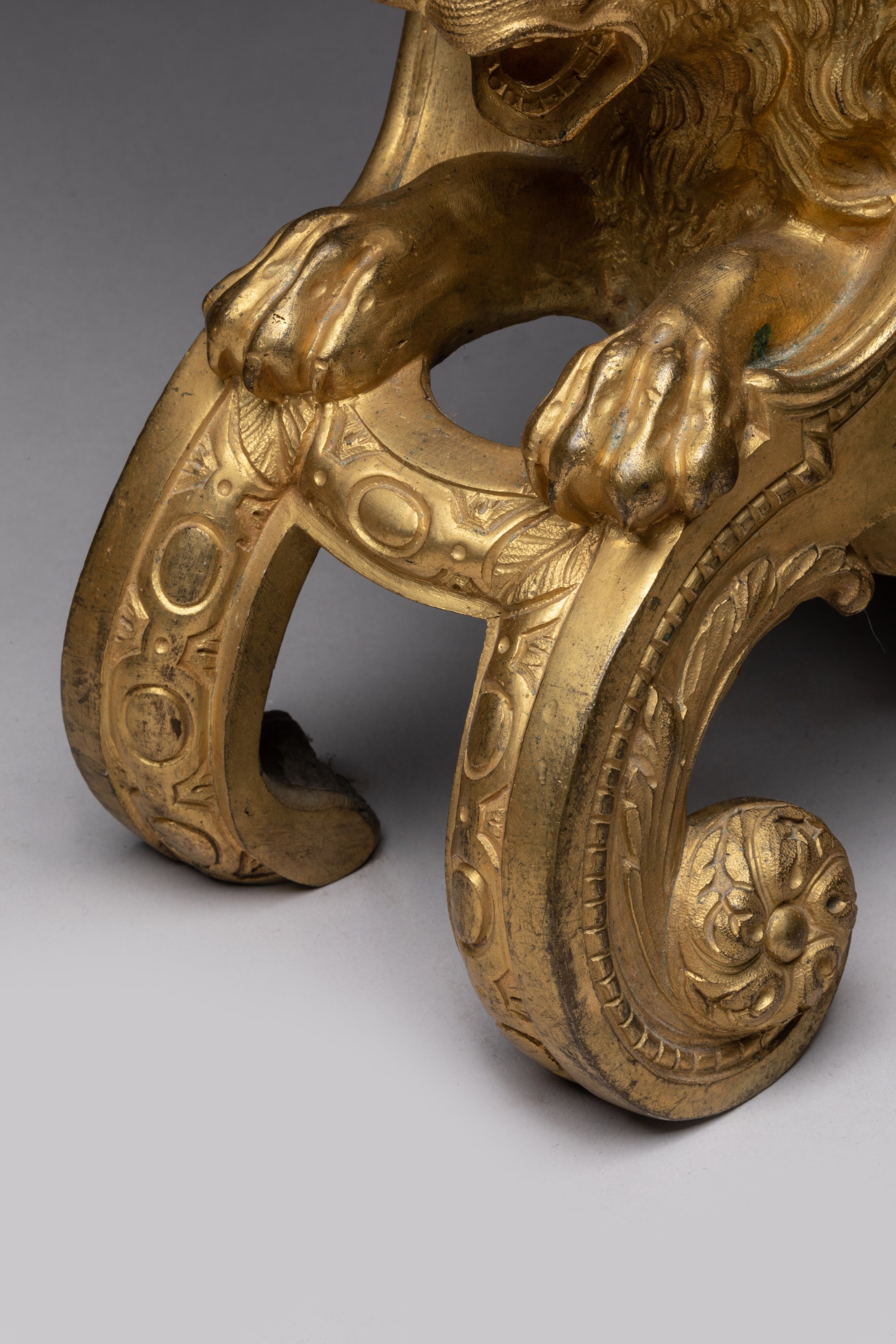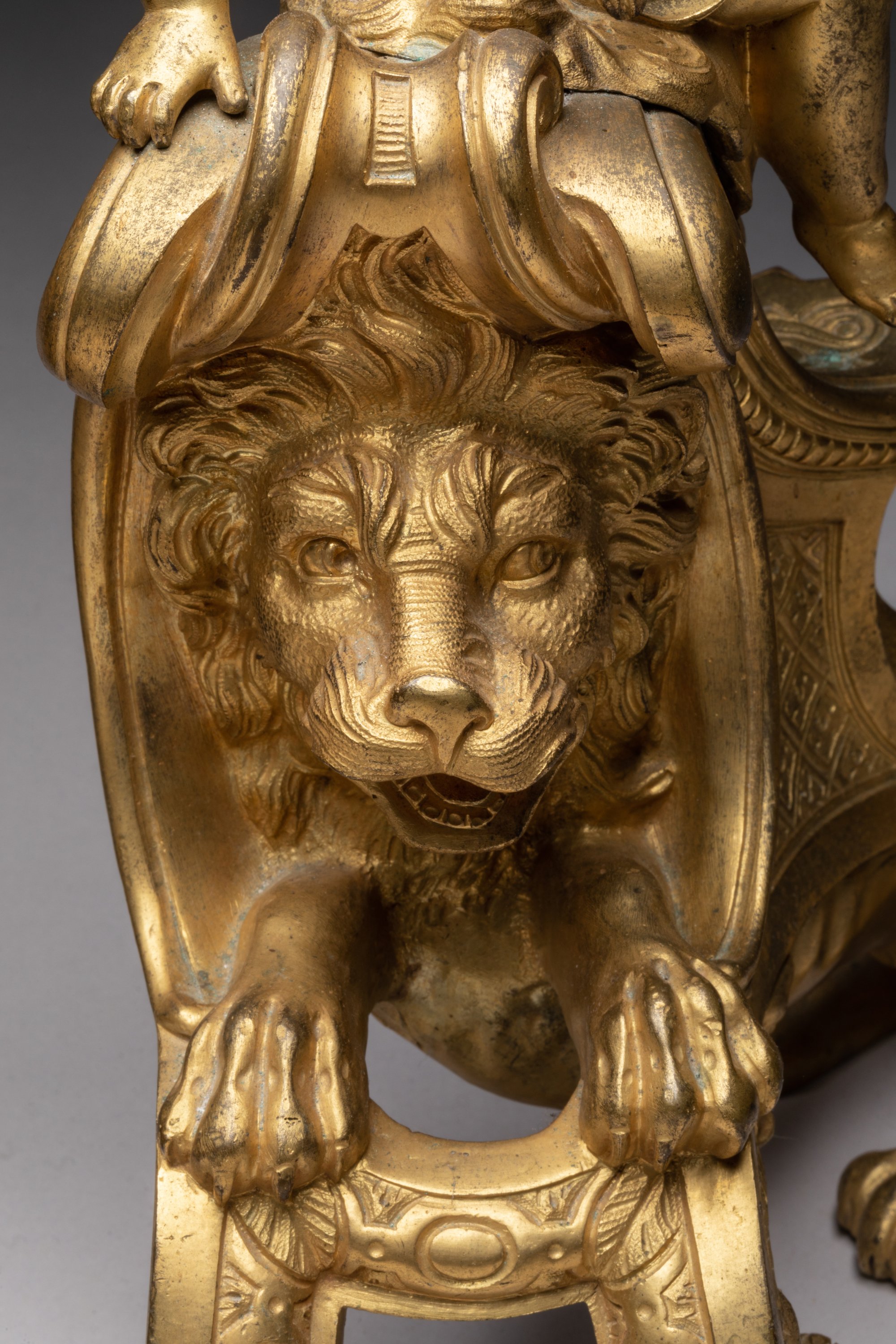 en bronze ciselé et doré. Composés de lions assis sur leurs pattes arrière et sortant en rugissant dune grotte figurée par des enroulements. Aux sommets, deux amours sont assis en vis-à-vis.