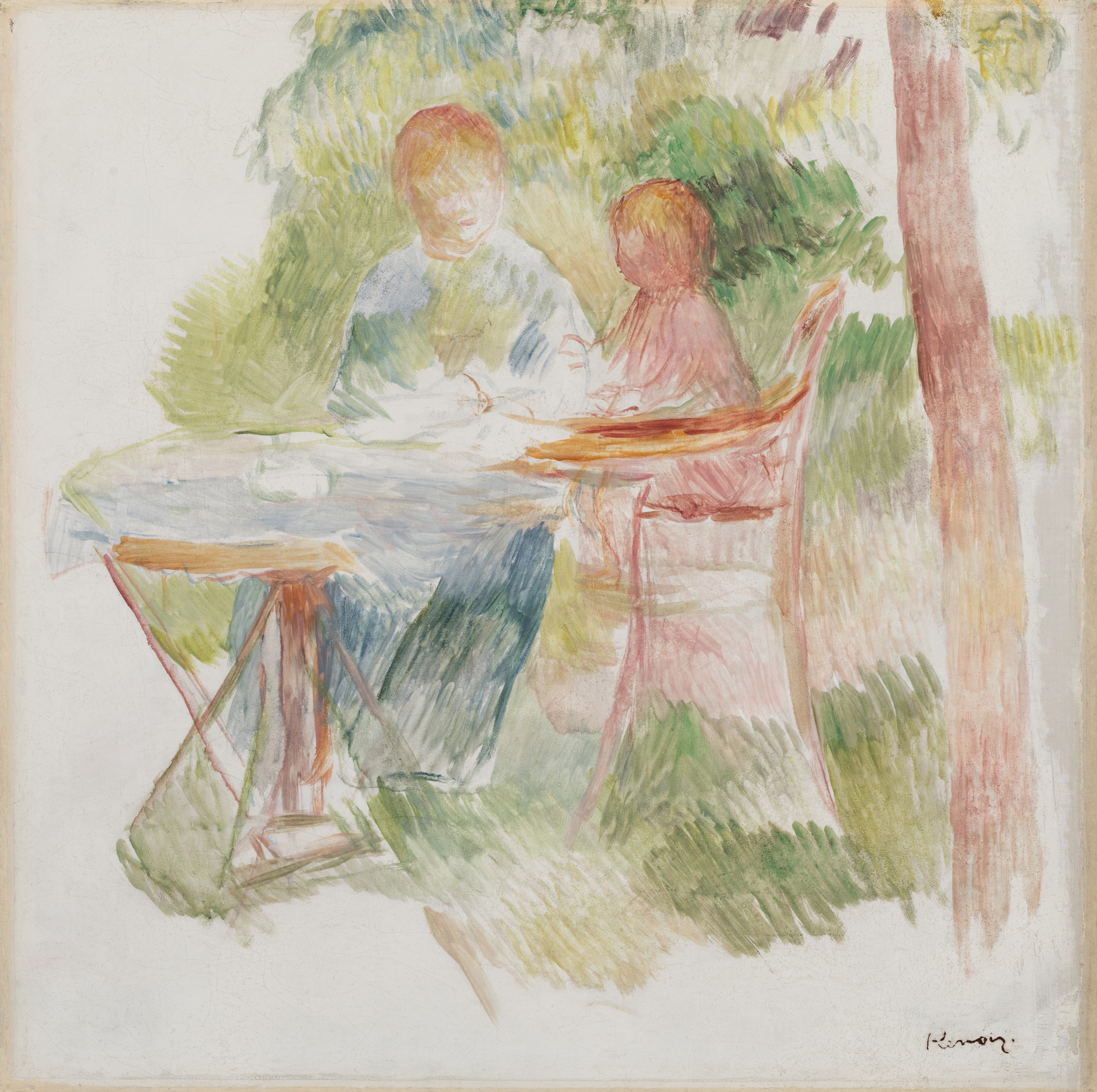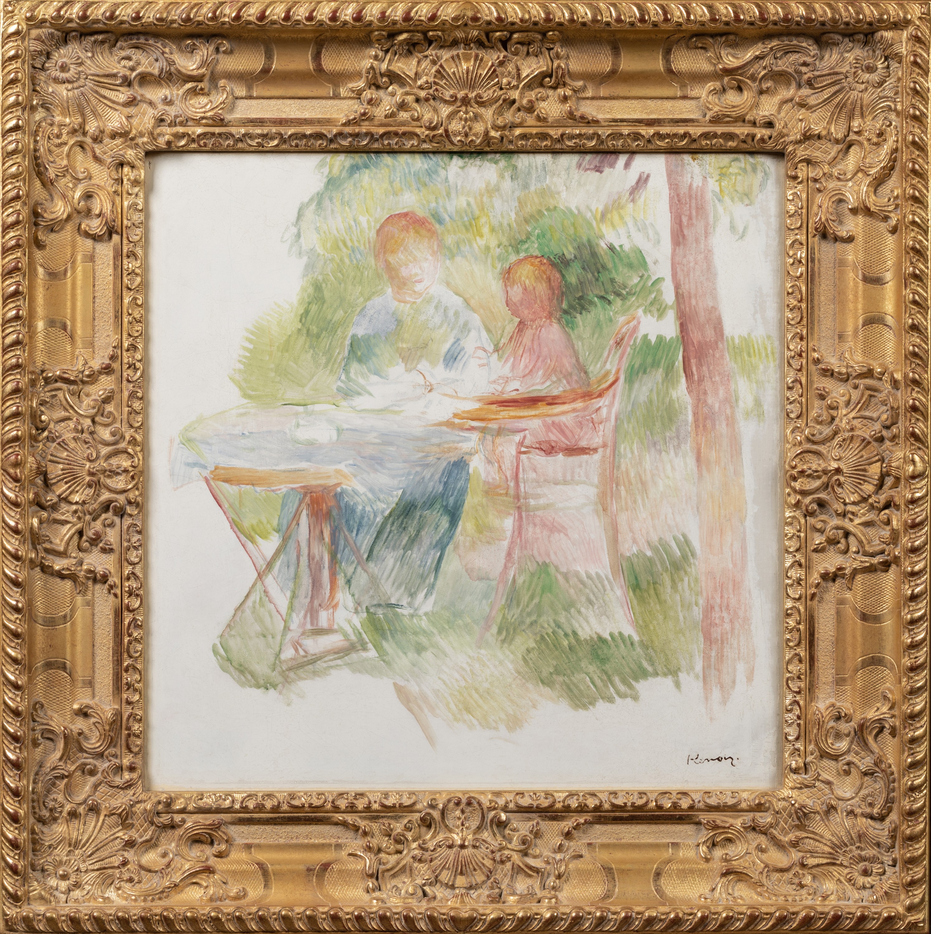 Notre esquisse présente cette femme tout en courbes, comme sur un autre portrait d'Aline (1885, Philadelphie). Blonde et douce, le peintre l'esquisse en touches hachurées qui rappellent l'œuvre de Cézanne dans les années 1880. Deux autres études en extérieur de la même année, illustrées au catalogue raisonné (1022 A et 1022 B, p. 214 Guy-Patrice & Dauberville), figurent aussi la maternité d'Aline. Notre toile, ces deux esquisses et le portrait d'Aline de Philadelphie prouvent l'importance que l'être aimé prend dans l'œuvre et dans la vie du peintre. Les figures rouges et bleues silhouettées de notre peinture jaillissent du fond vert. Renoir ne met pas l'accent sur l'individualité des modèles mais sur la douceur du moment. Plutôt que de s'attacher à l'intérieur des figures, l'artiste travaille les nuances de l'arrière-plan végétal. Renoir dessine le contour du motif d'un mystérieux trait d'union entre Ingres et Cézanne.