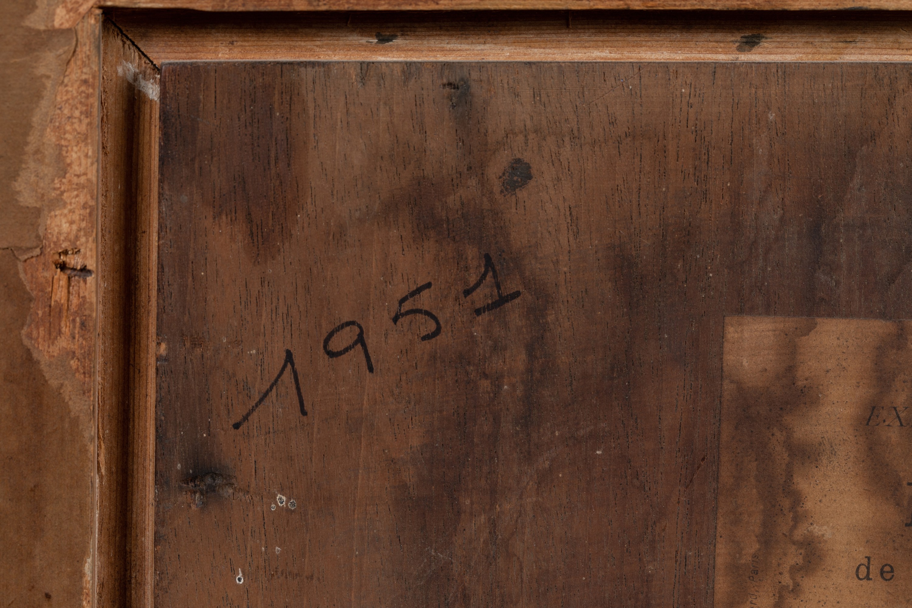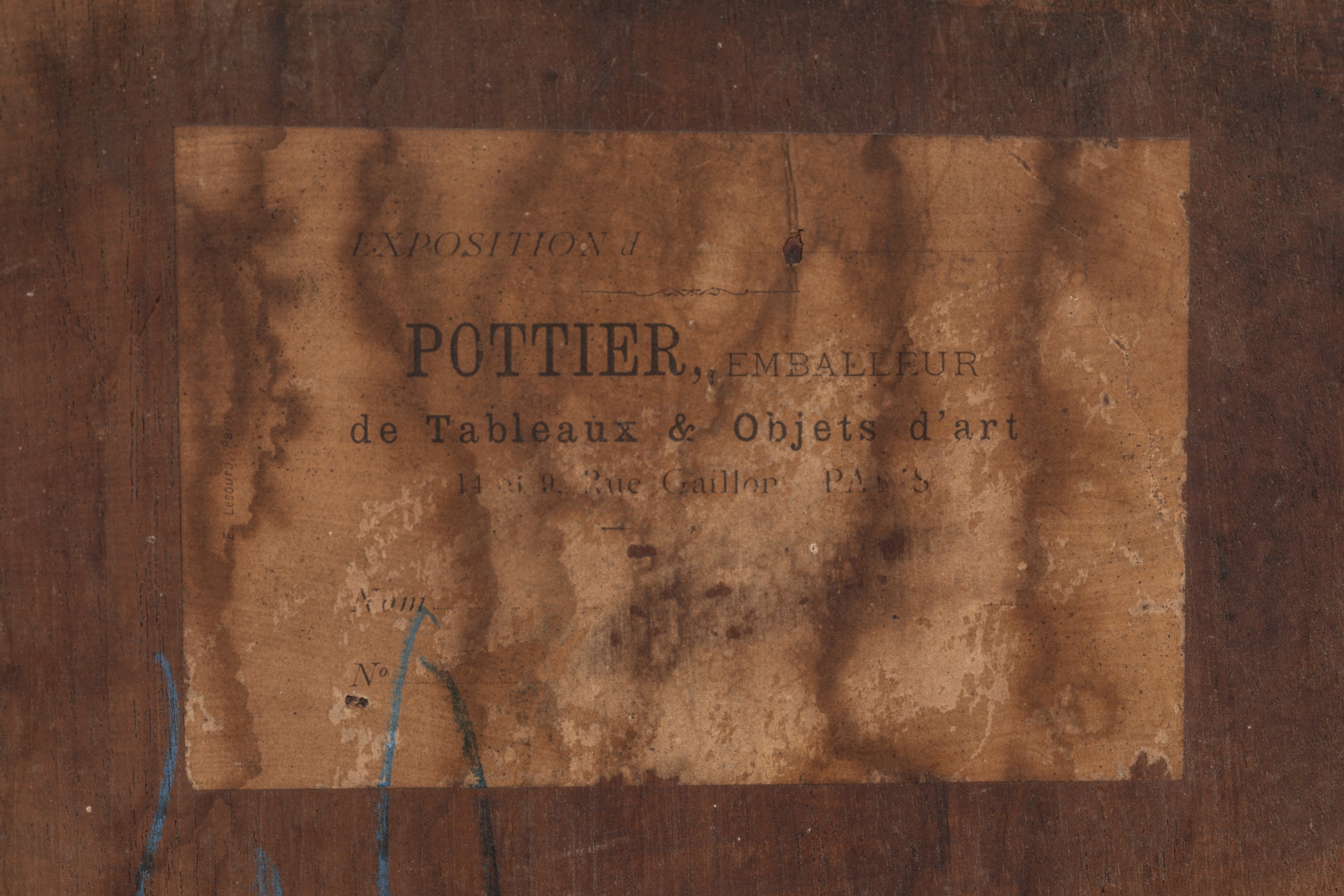 Étiquette au dos d'une exposition au Havre, de "Pottier, Emballeur de Tableaux & Objets d'art 14 & 9 rue Gaillon Paris". Différents numéros d'inventaires: "40" au pastel bleu, "n°2.90" au crayon noir et "1951" au feutre noir.