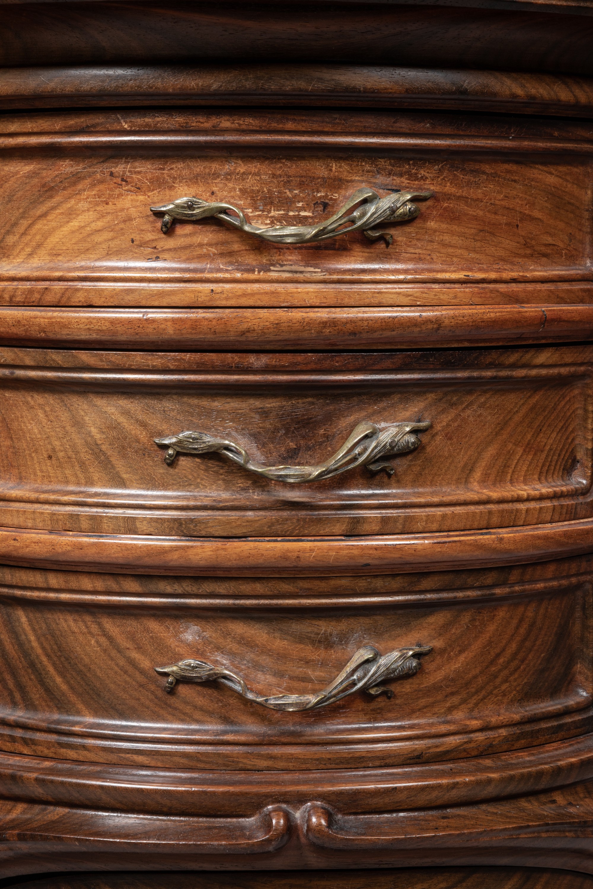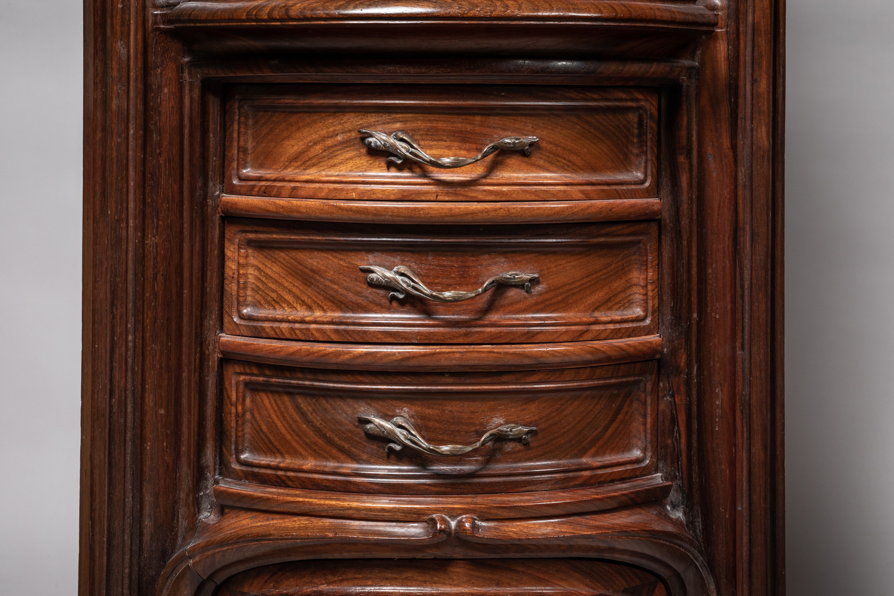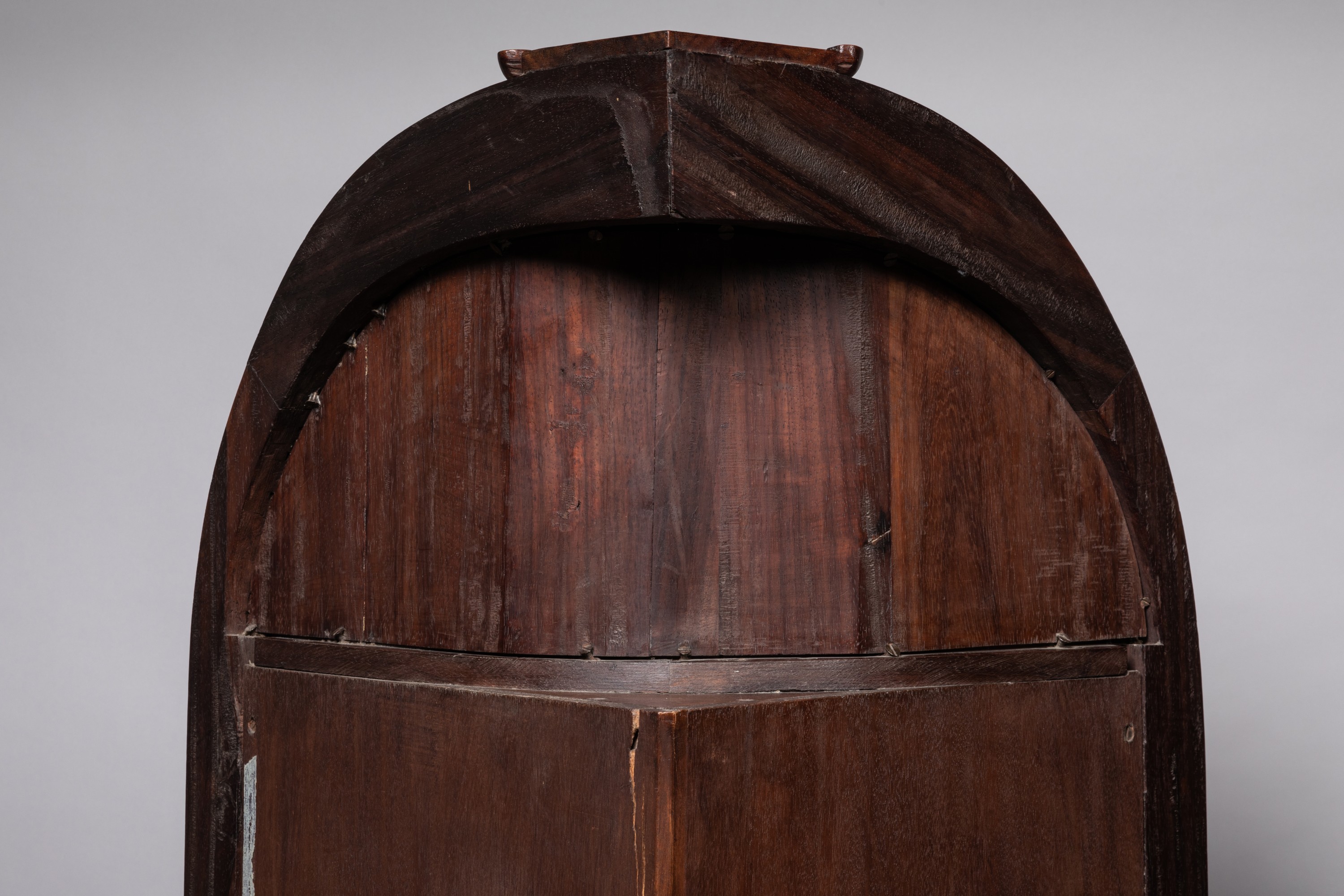 Bois de padouk, ou santal, mouluré et sculpté en quart de cercle. Le meuble ouvre en partie haute par une porte vitrée galbée qui dévoile une étagère en verre et trois tiroirs. En partie basse, une porte révèle un fond en marbre blanc. Son sommet est coiffé d'un fronton se terminant par des volutes à gorge formant une niche. Les deux pieds antérieurs sont subtilement mouvementés.