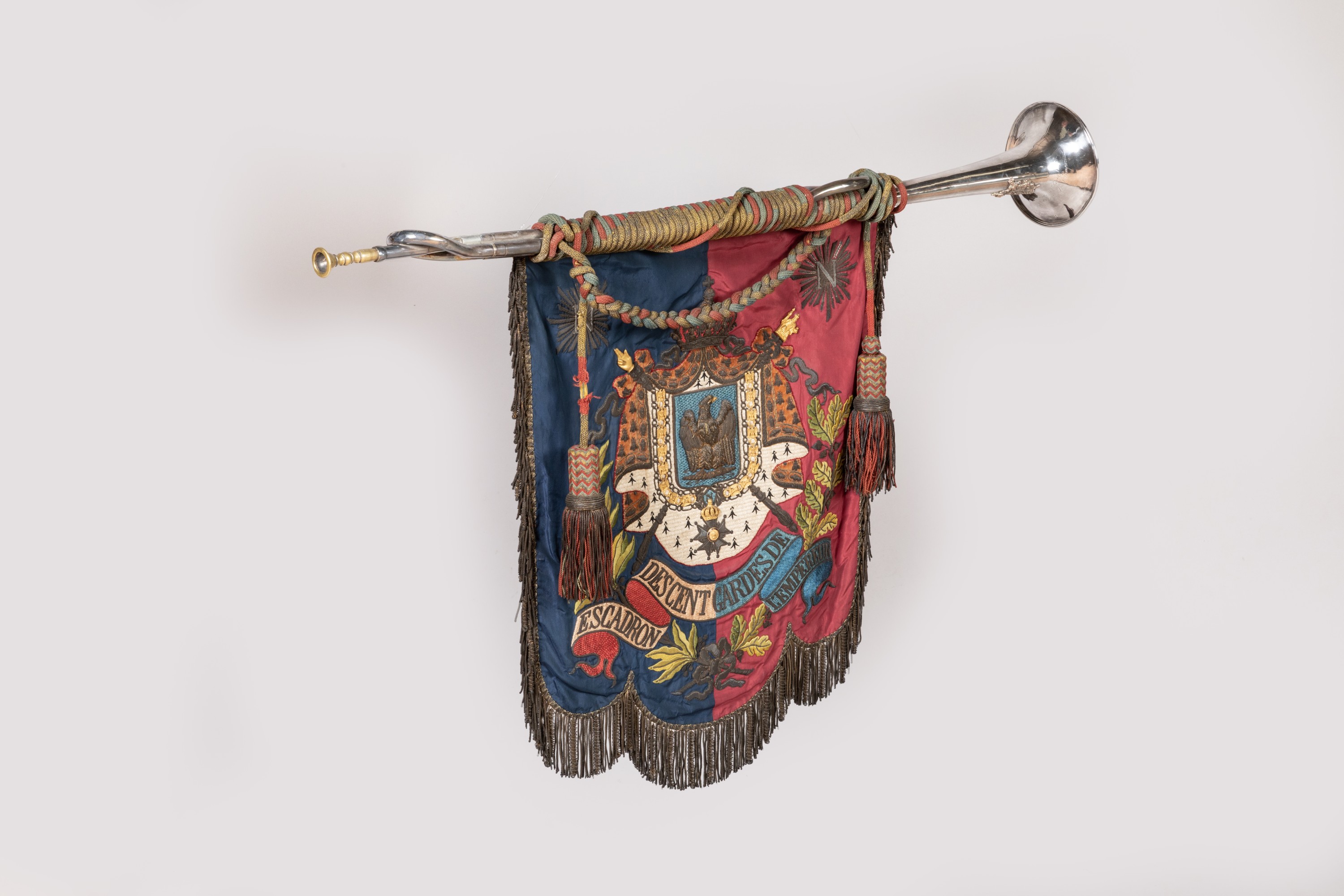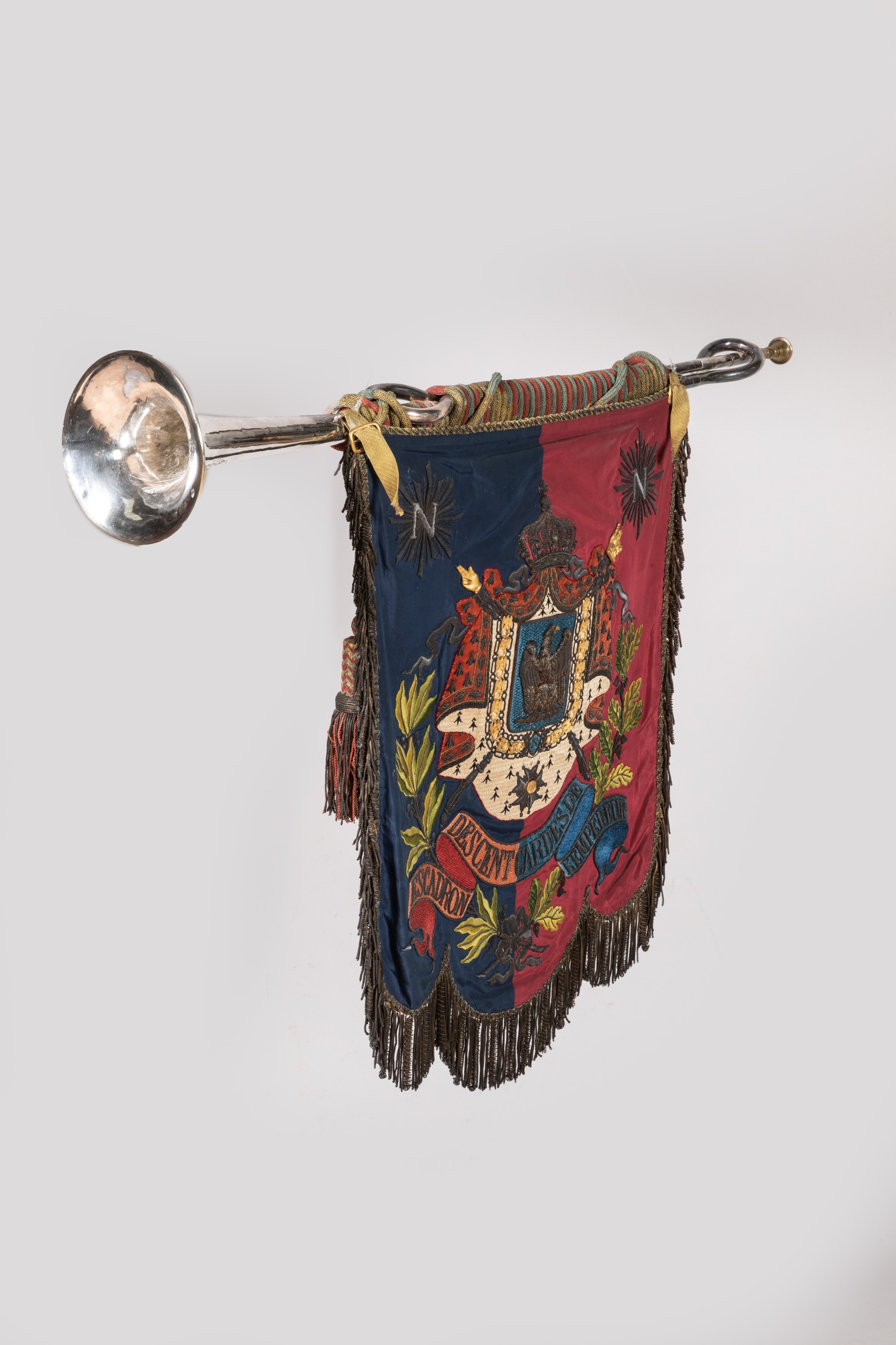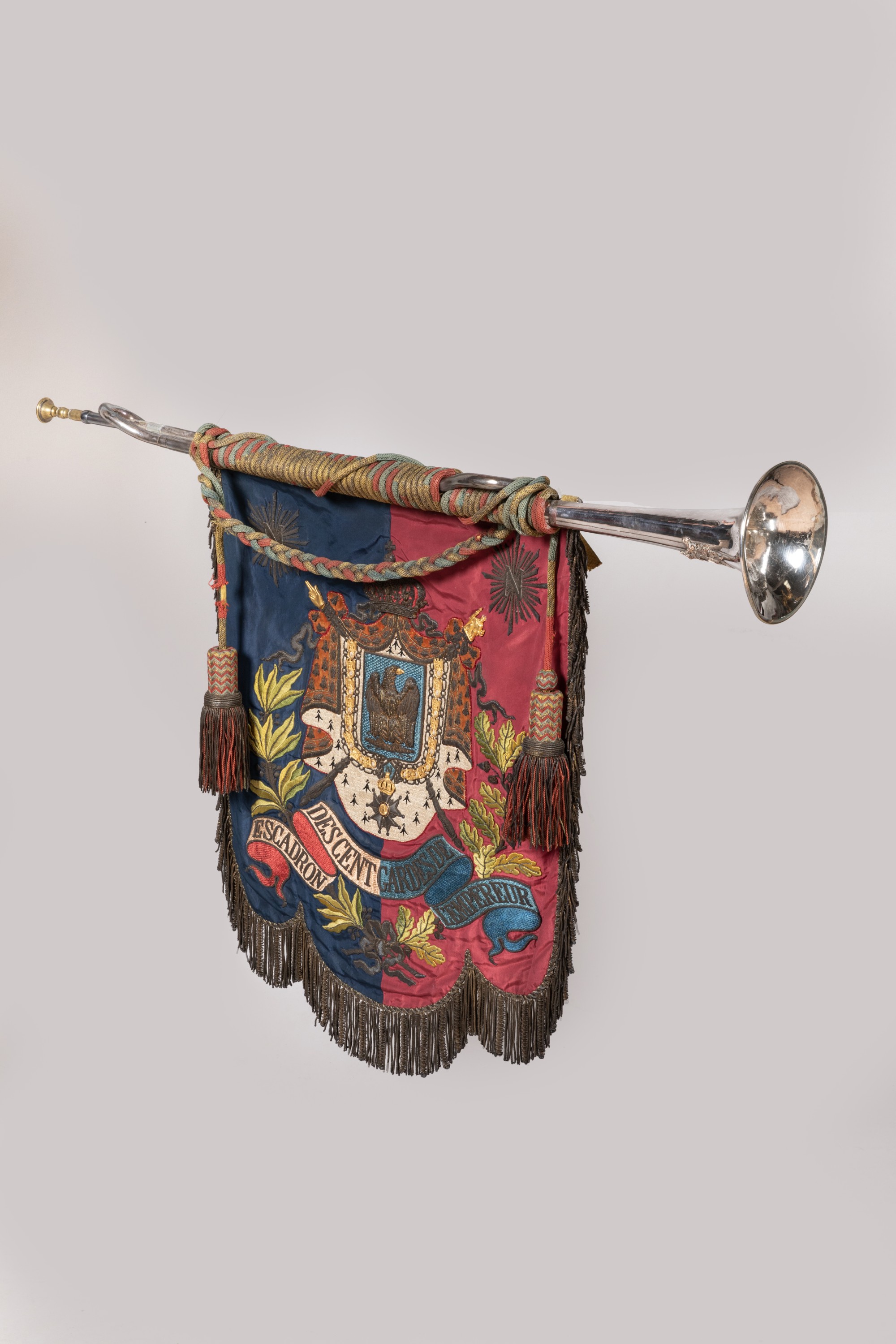 Extremely rare and exceptionally well-preserved ceremonial trumpet, banner and case having belonged to the Cent-gardes squadron, an elite cavalry squadron of the Second French Empire primarily responsible for protecting the person and family of Emperor Napoleon III.